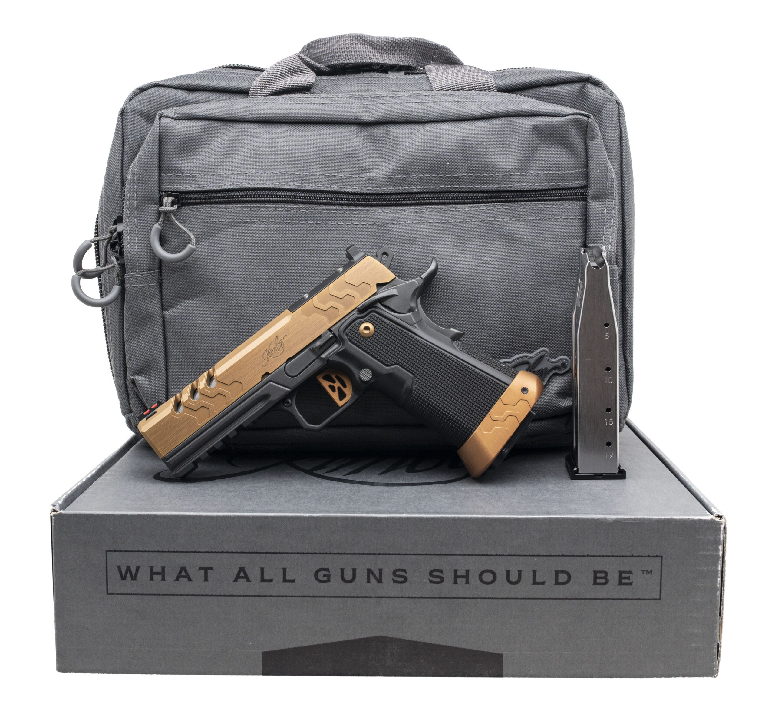 Double Stack 1911 Style Pistol with a 4.25" DLC Bull Barrel. Commander Size, Coyote PVD Finish, Aluminum Grip Module, Optic Ready, GT Trigger, Flared Magwell, Lightning Cuts, and Accessory Rail. Includes 2-19rd Magazines and a Carry Bag. NEW. UPC: 669278350639