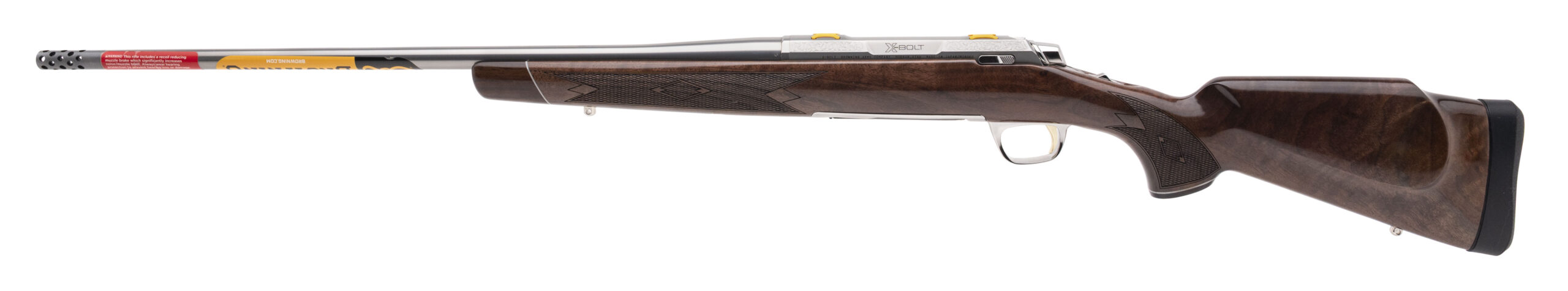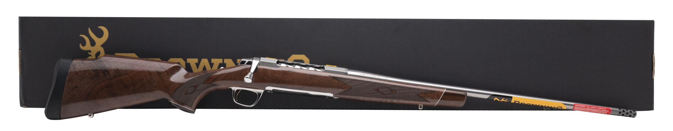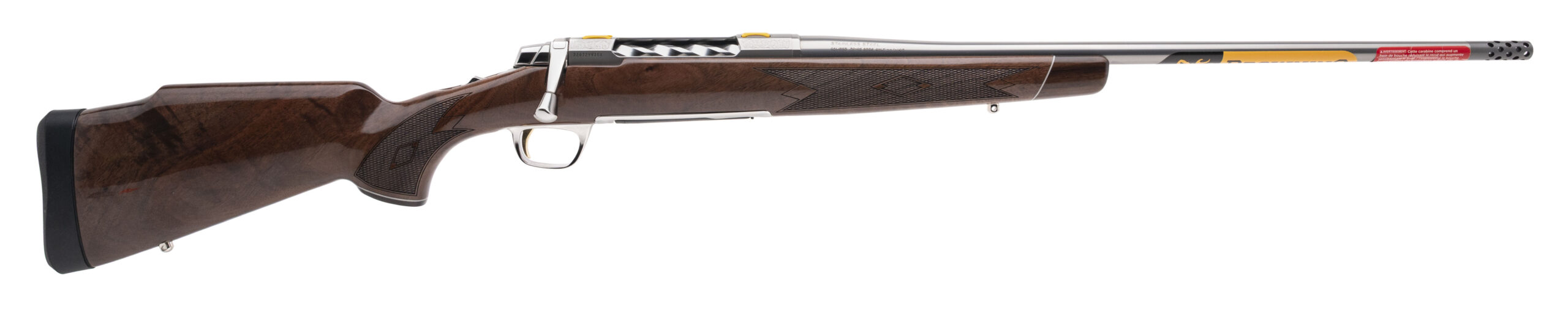 Bolt-Action Hunting Rifle with a 22" Threaded Stainless Steel Sporter Contour Barrel w/Muzzle Brake. Engraved Stainless Steel Receiver, and Gloss Finished Grade V/VI Checkered American Walnut Monte Carlo Style Stock w/Rosewood Fore-end Tip & Grip Cap. NEW. UPC: 023614857778