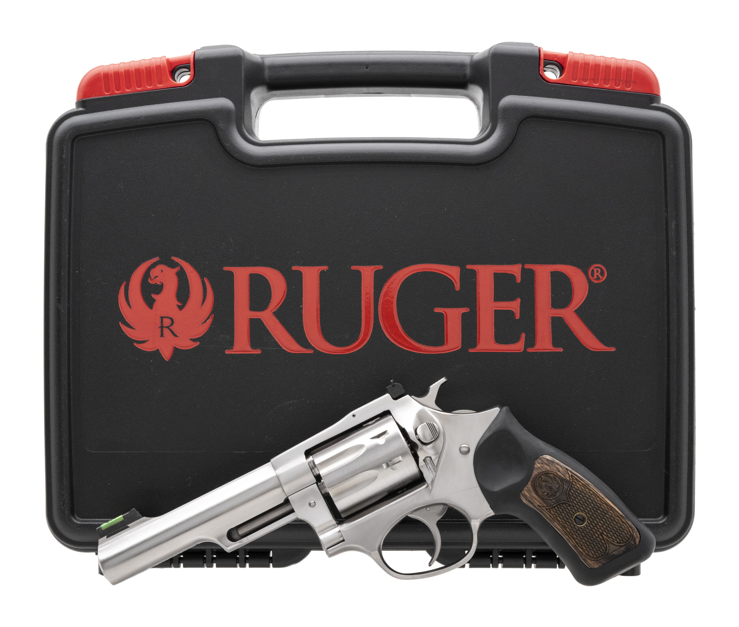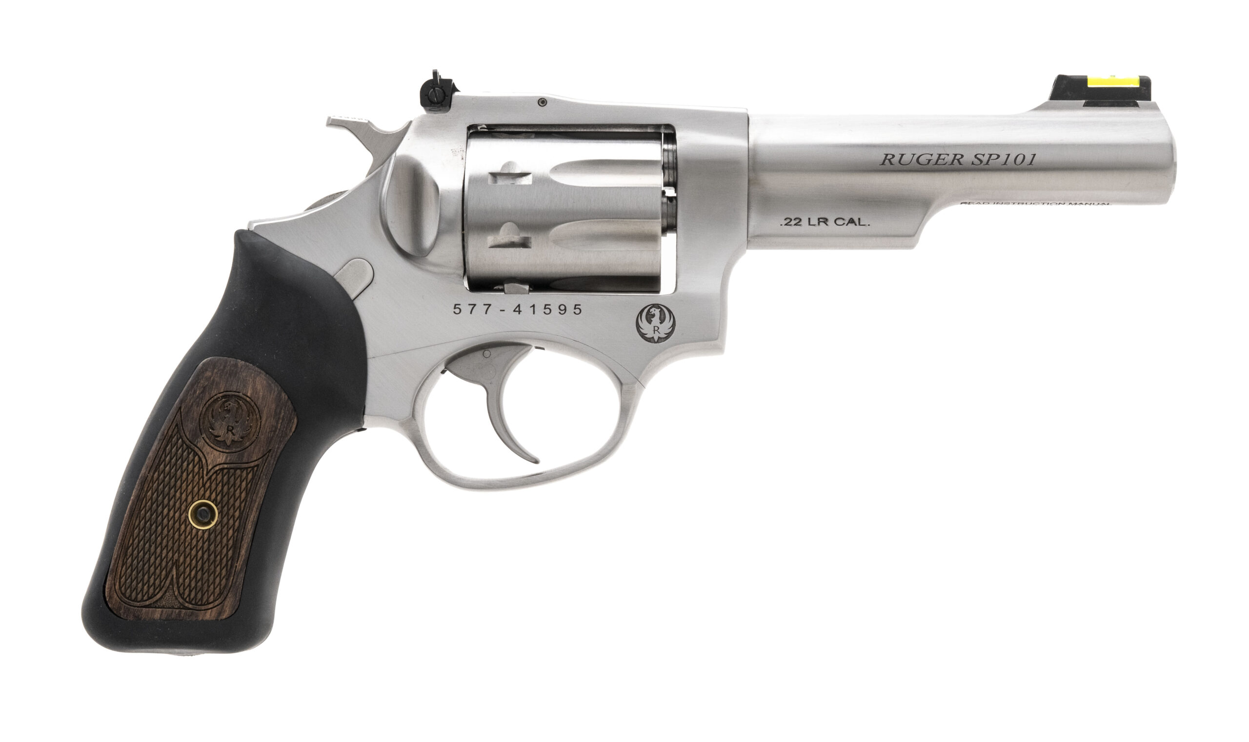 Ruger SP101 .22LR with an 4.2" Barrel. Double Action Small Frame Revolver. Stainless Steel, Silver Satin Finish, Rubber Grips with Wood Inlay, Fiber Optic Front and Adjustable Rear Sights, 8 Round Cylinder. NEW. UPC: 736676057658