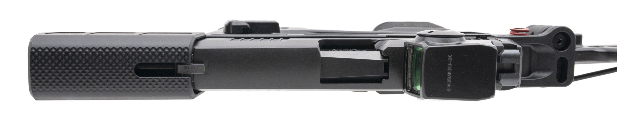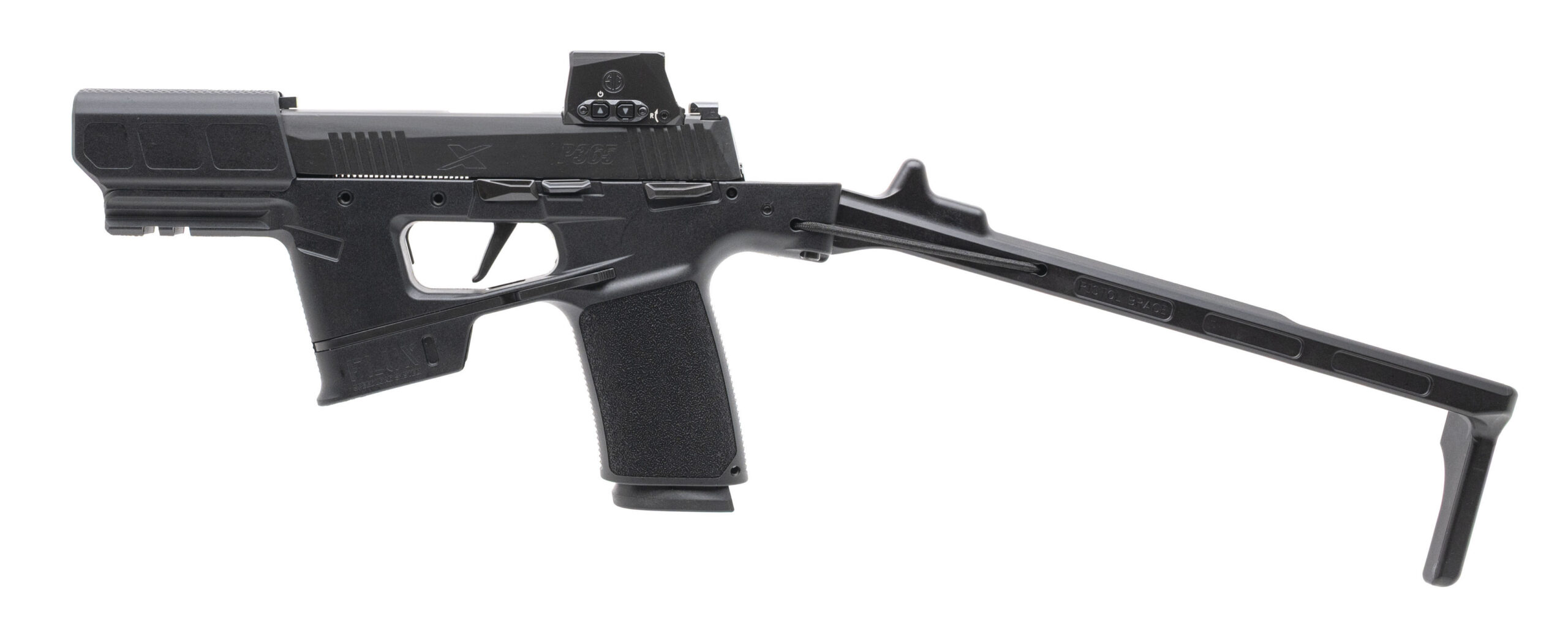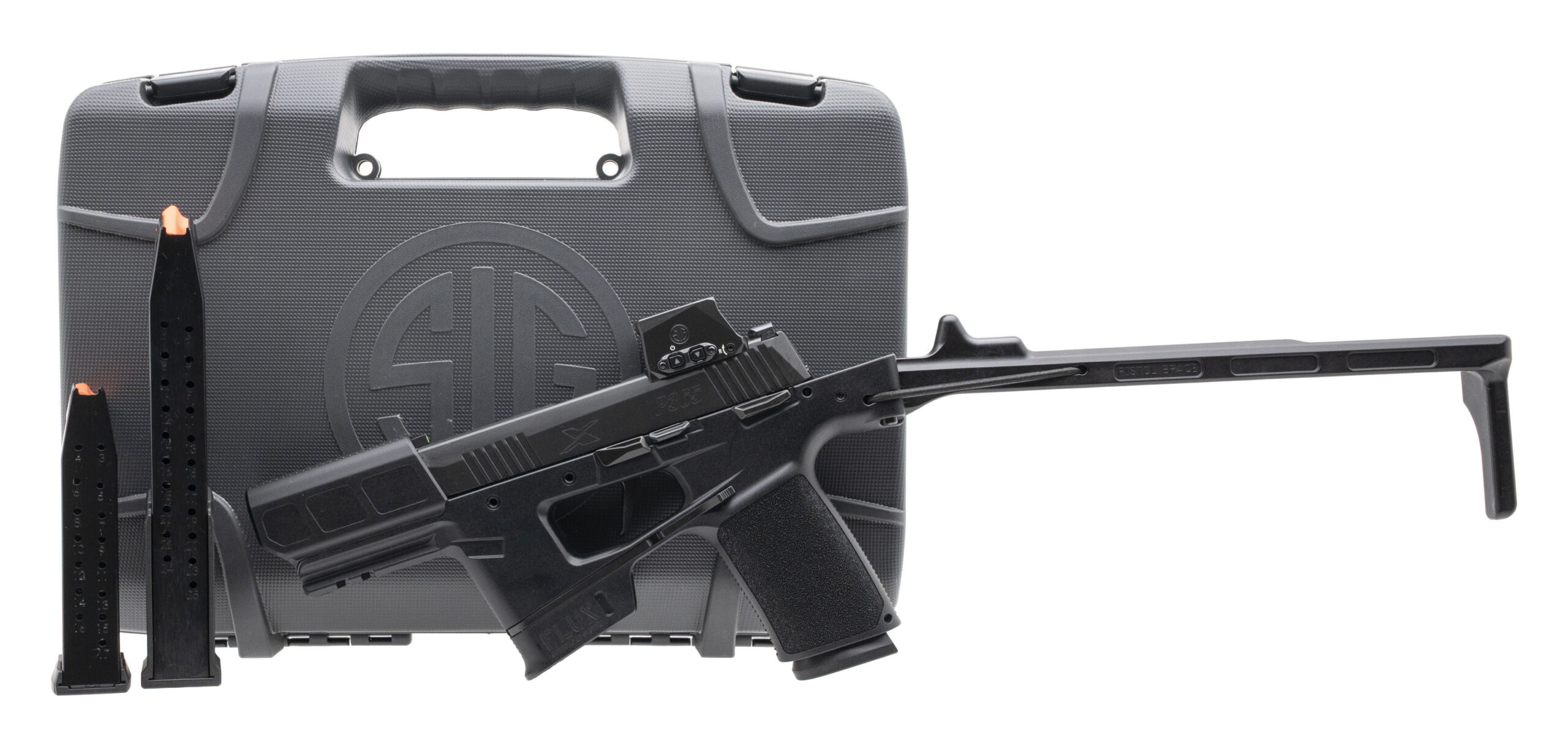 Striker-Fired Pistol with a 6" Barrel w/Muzzle Shroud. Full Size, Romeo-X Compact Red Dot Sight, X-RAY 3 Front & Rear Night Sights, Ambidextrous Manual Thumb-Safety, Sig Foxtrot 1X Light Module, Spring Deployable Side-Folding Brace, FLUX P365 Chassis, and Nitron Finish. Includes 1-25rd & 2-17rd Magazines, and OWB Holster. NEW. UPC: 798681726226(STOCK PHOTO)
