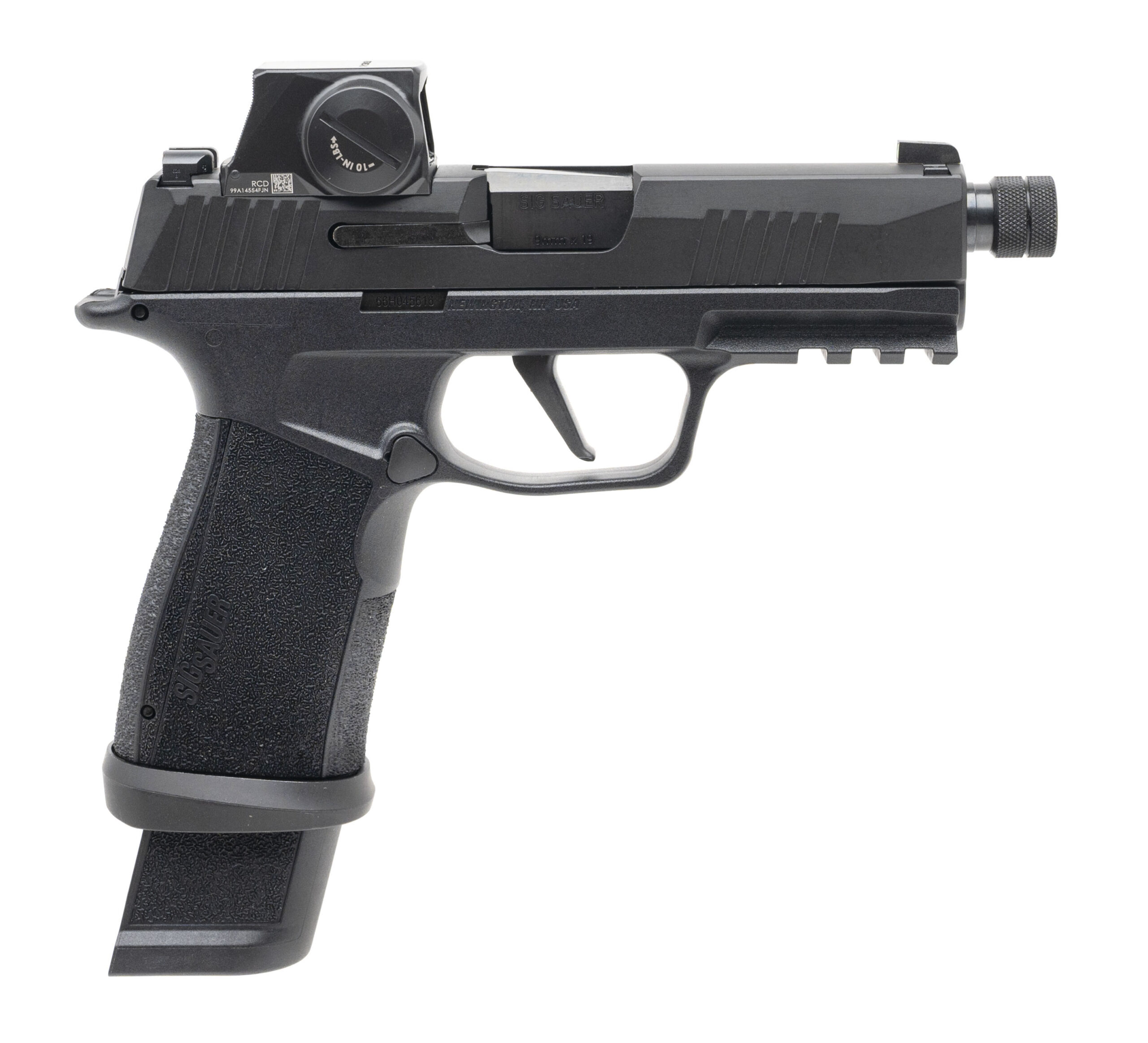 Striker Fired Pistol with a 4.3" Threaded Barrel. Compact, Nitron Finish, Polymer Frame, Sig Romeo-X Red Dot Optic, XRAY3 Day/Night Sights, Magwell, Accessory Rail. Includes 4-21rd Magazines. NEW. UPC: 798681731398