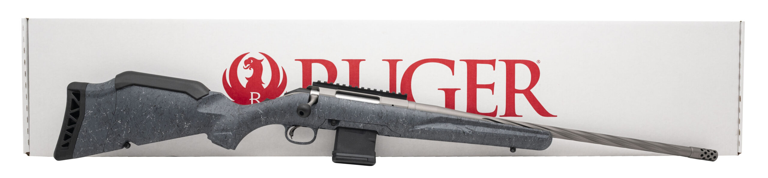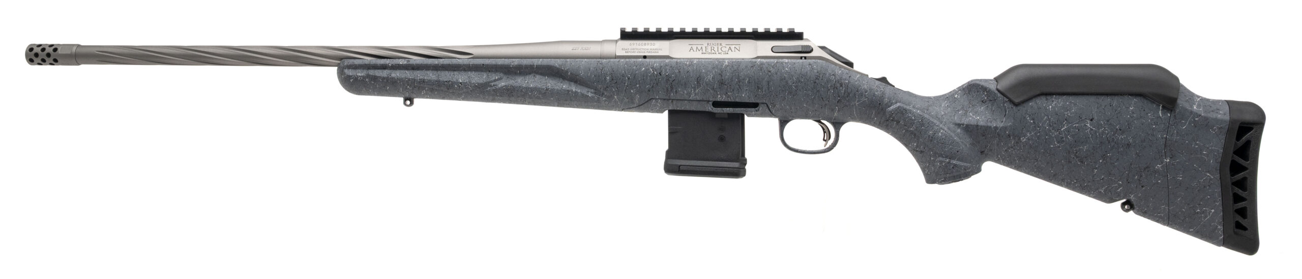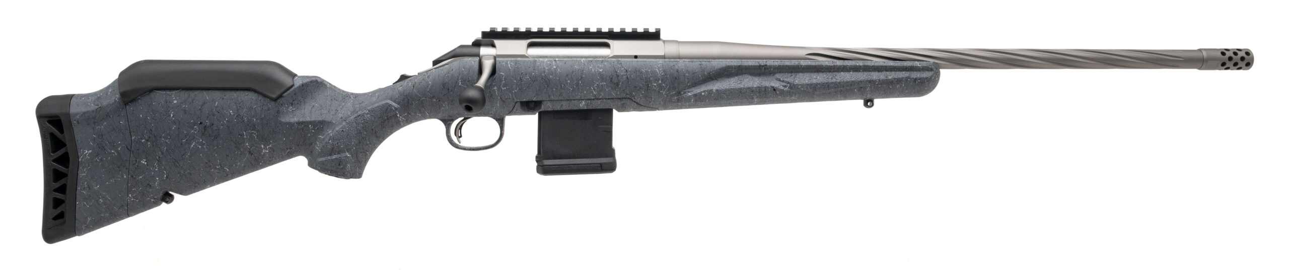 Bolt-Action Hunting Rifle with a 20" Spiral Fluted Threaded Barrel w/Muzzle Brake. Adjustable Trigger, Picatinny Optic Rail, Gun Metal Gray Cerakote Finish, and Synthetic Gray Splatter Stock. Accepts AR Pattern Magazines. Includes 1-10rd Magazine. NEW. UPC: 736676469093