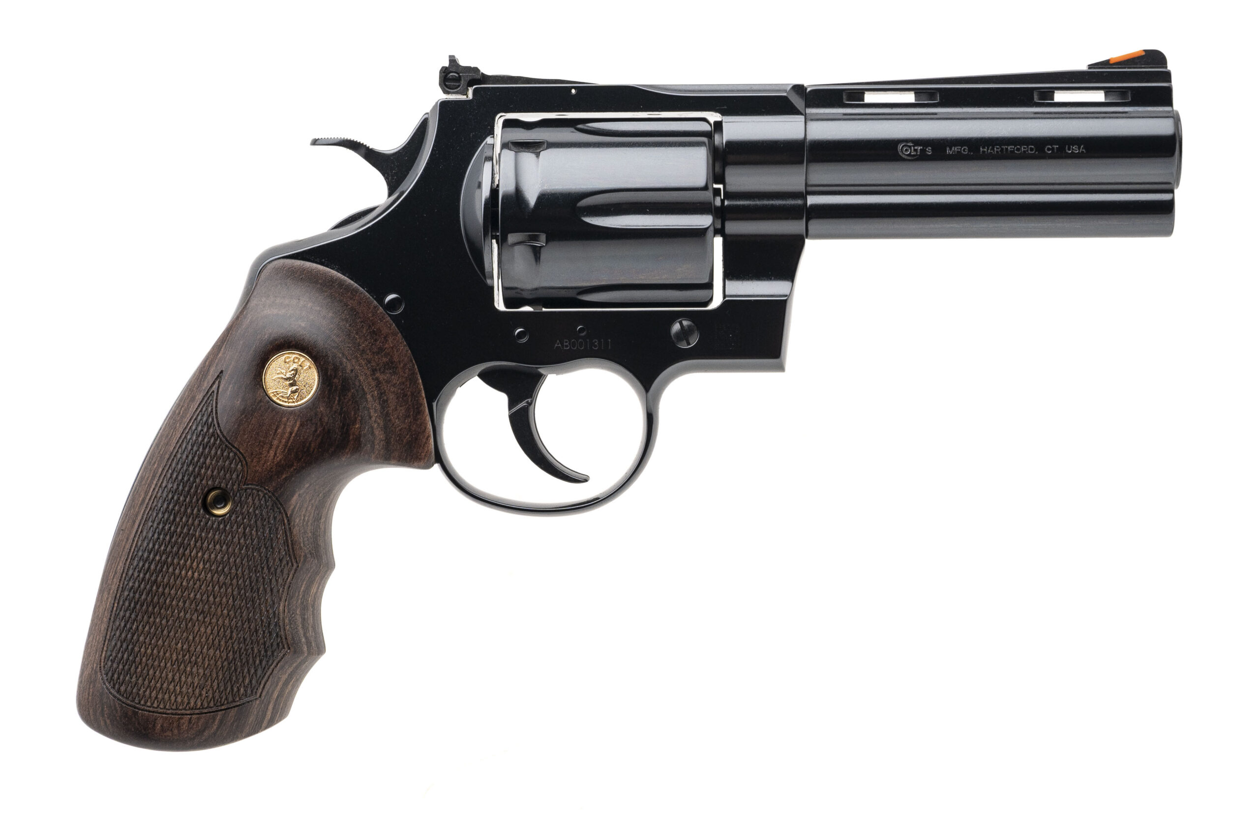 Stainless Steel Frame Revolver with 4.25" Vent Rib Barrel. Double-Action, Red Ramp Front Sight, Adjustable Rear Sight, 6rd Cylinder, Polished Blue Finish, and Checkered Target Walnut Gold Medallion Grips. NEW. UPC: 098289005502