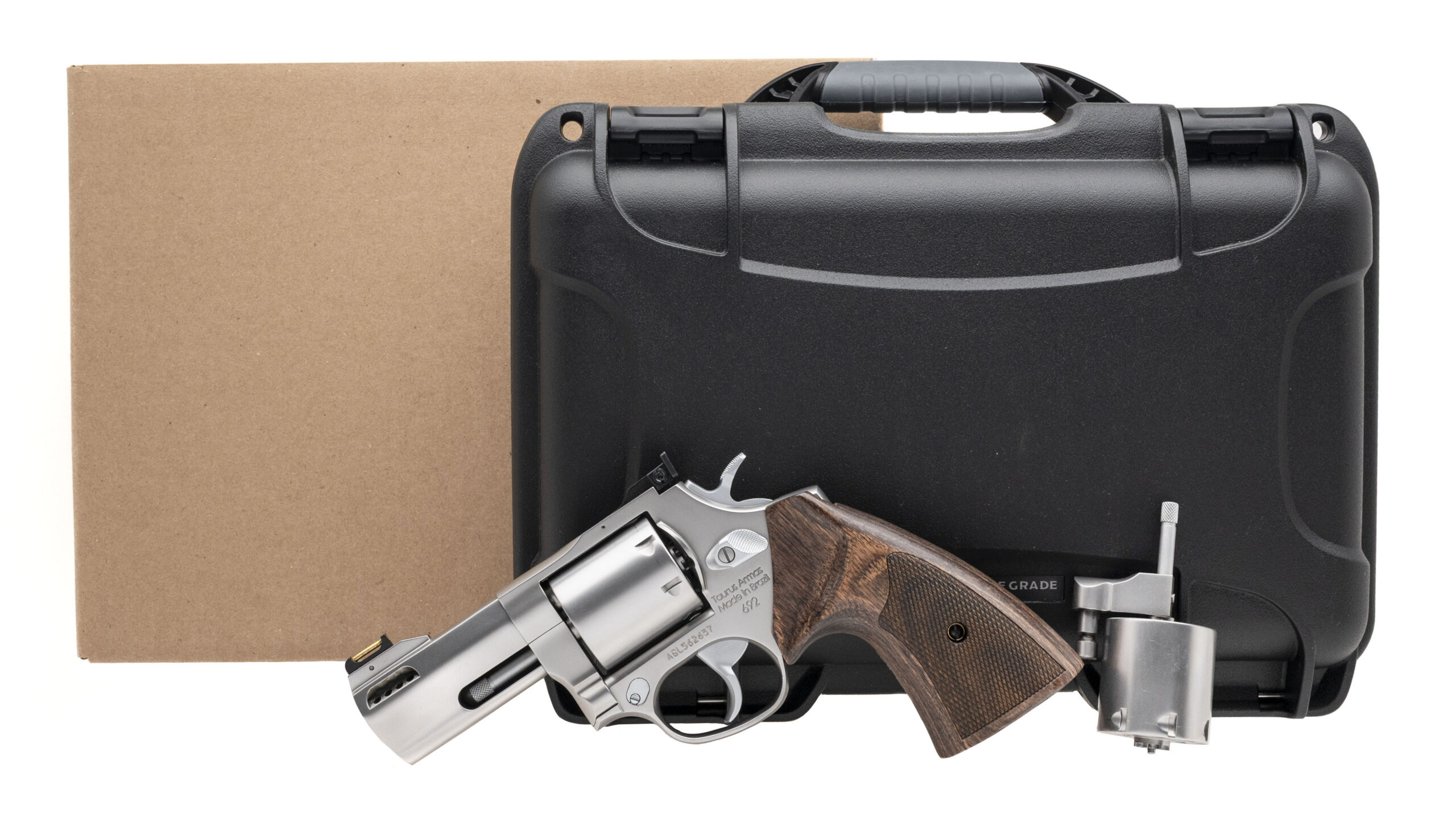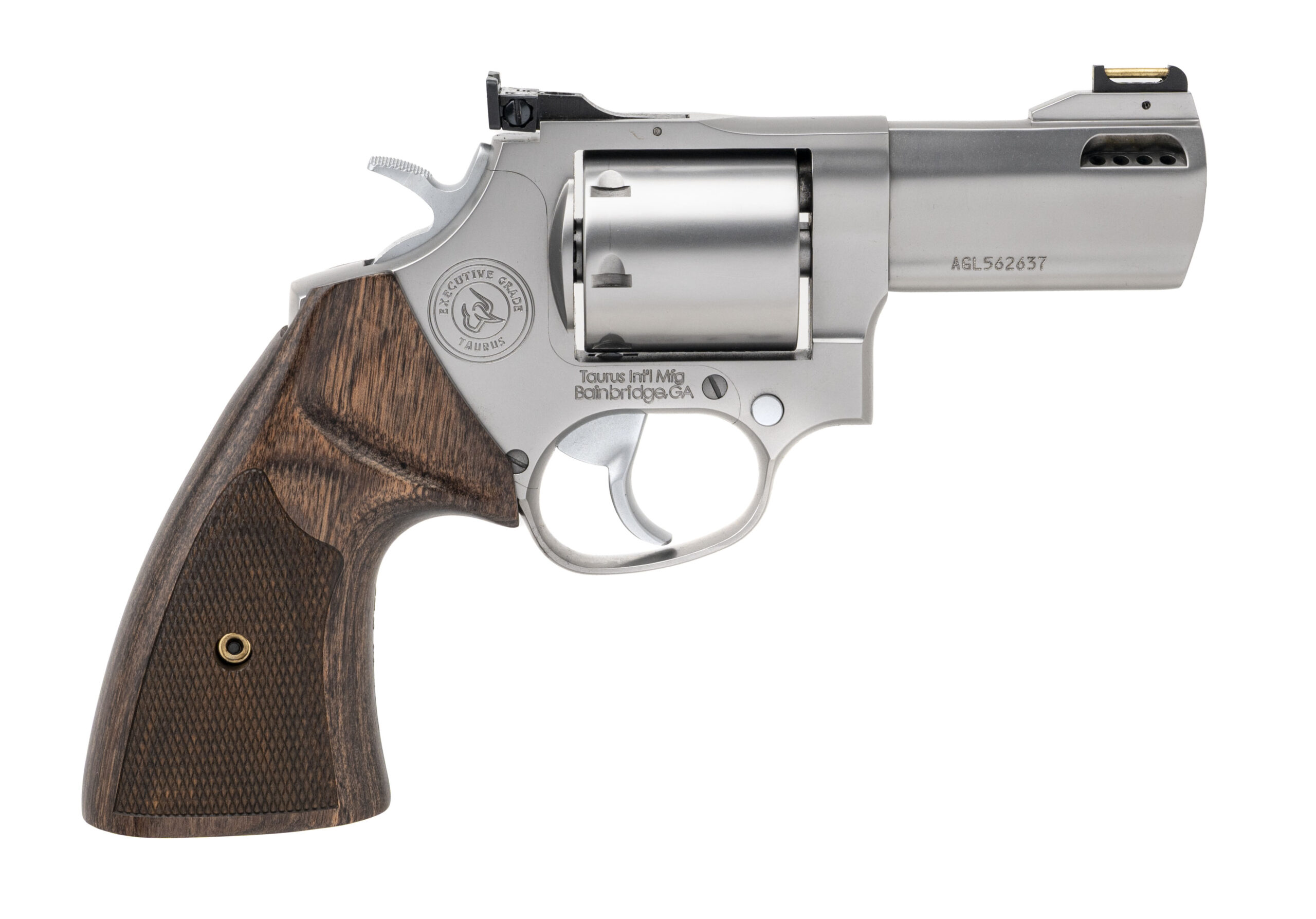 Stainless Steel Medium Frame Double-Action Revolver with a 3" Ported Barrel. Executive Grade, Fixed Brass Insert Front Sight, Adjustable Rear Sight, 7rd Cylinder, and Checkered Walnut Grips. Includes an Additional 7rd 9mm Cylinder. NEW. UPC: 725327941071