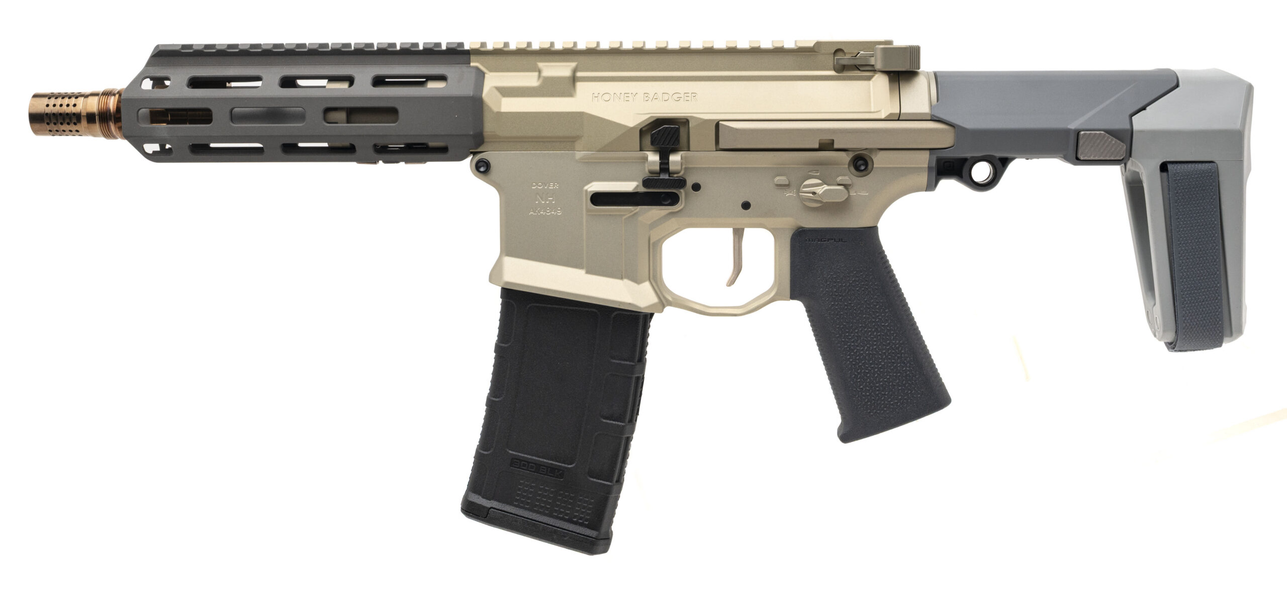 Semi-Auto Tactical Pistol with a 7" Barrel w/Cherry Bomb Muzzle Brake. Picatinny Optic Rail, 2-Stage Match Trigger, MLOK Forend, Ambidextrous Controls, Proprietary Collapsible Brace, and FDE Finish. Includes 1-30rd Magazine. NEW. UPC: 850000857155(STOCK PHOTO)