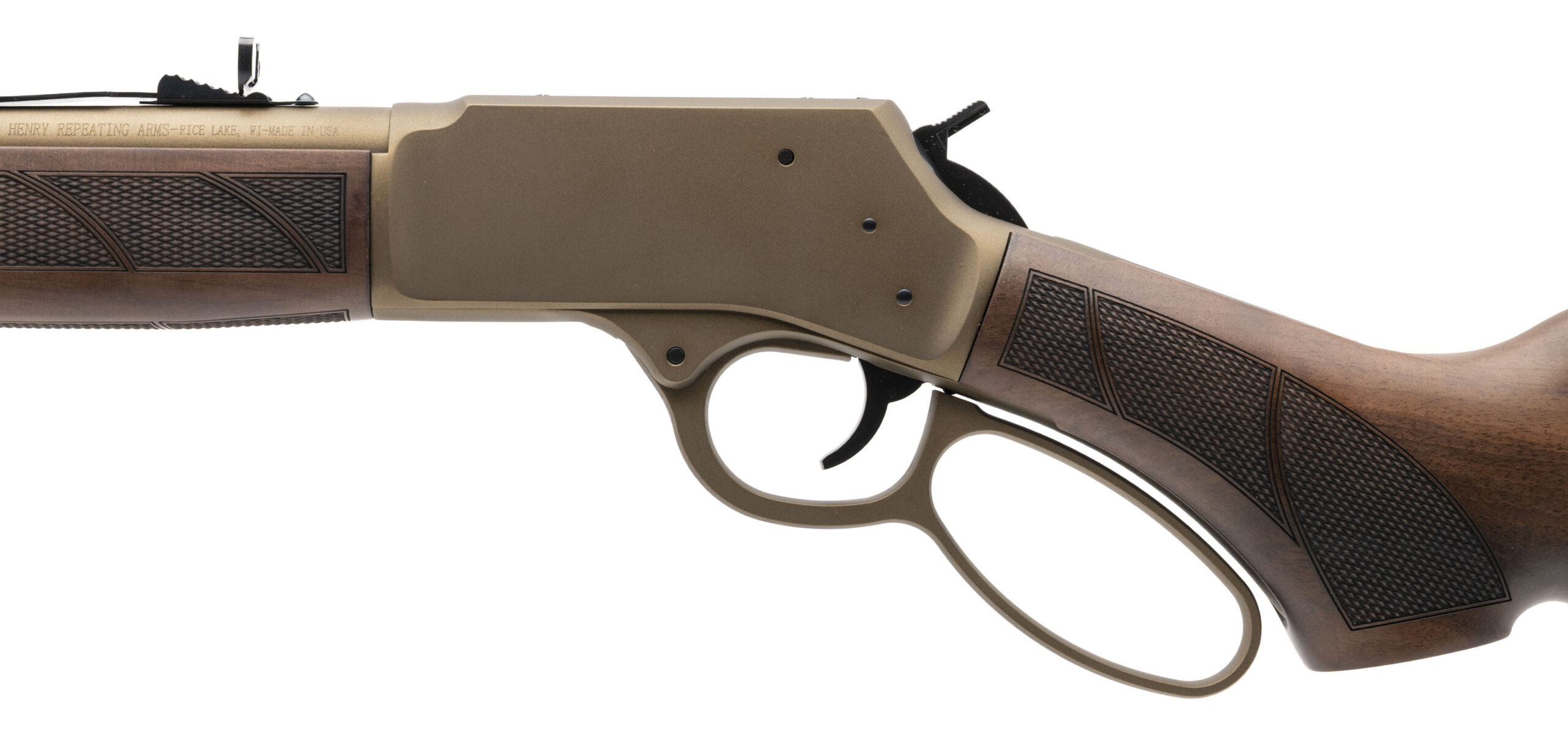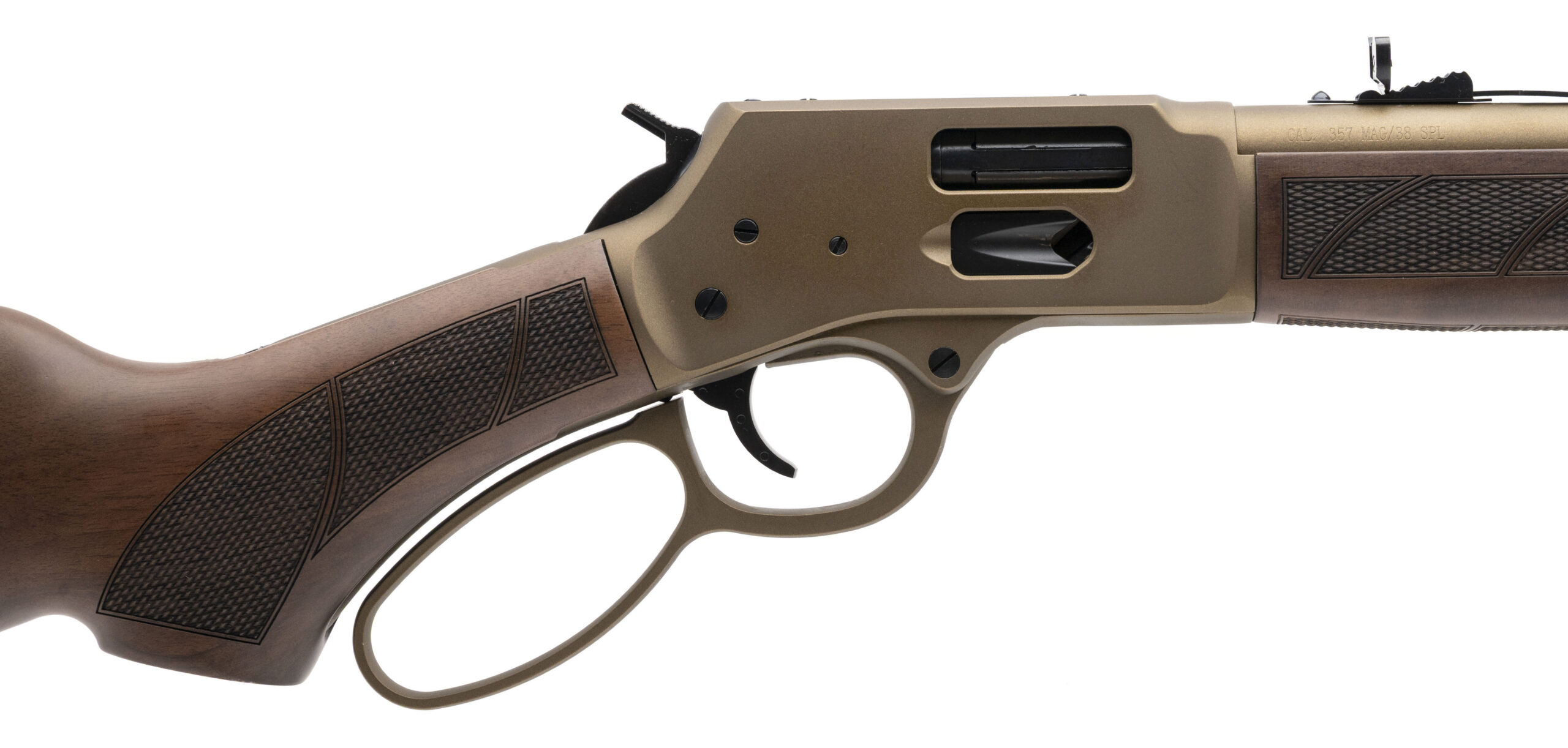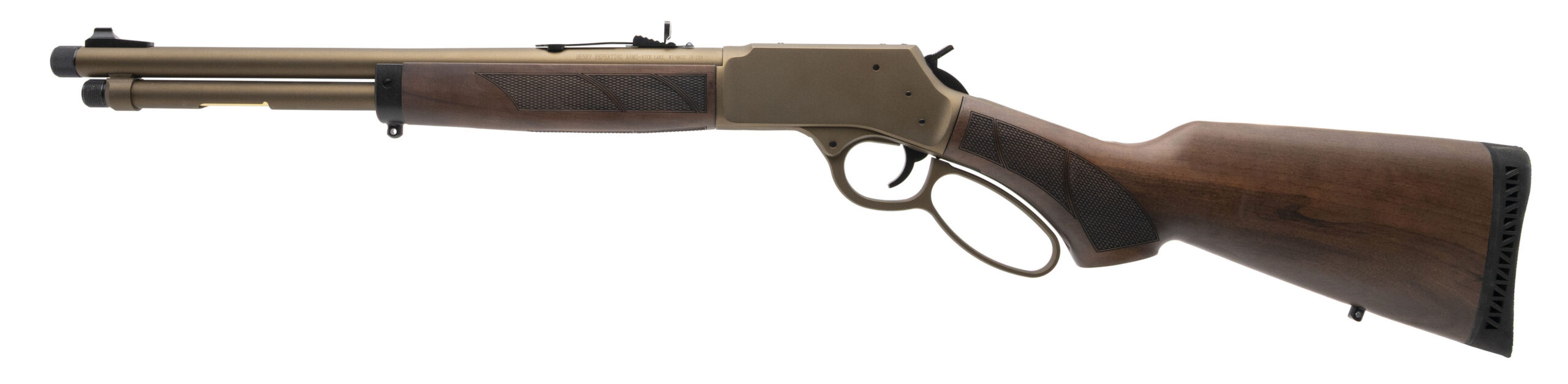 Lever-Action Rifle with a 16.5" Threaded Barrel. White Bead Front Sight, Adjustable Semi-Buckhorn Rear Sight, Burnt Bronze Cerakote Finish, and Checkered American Walnut Wood Stock. NEW. UPC: 619835200556(STOCK PHOTO)