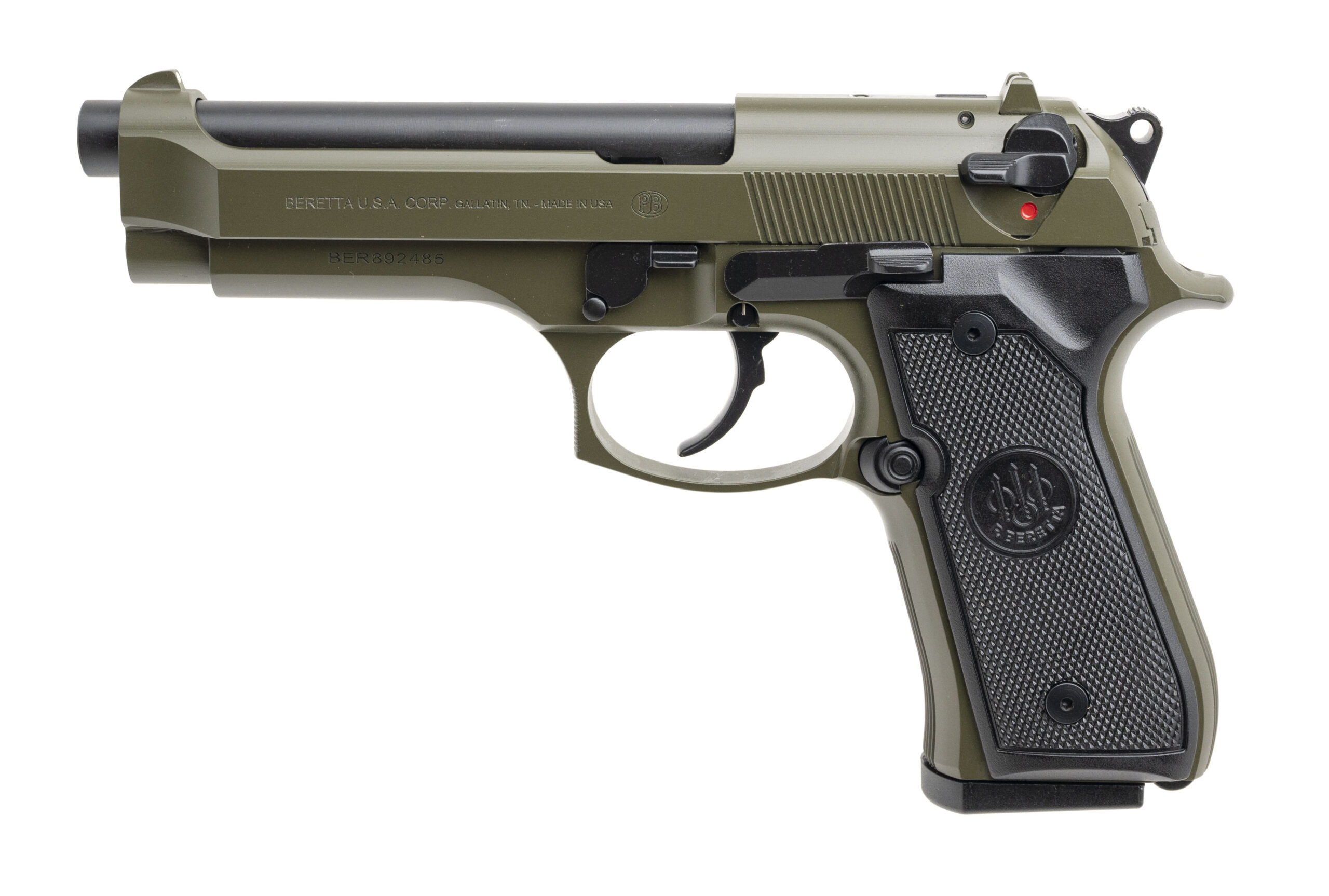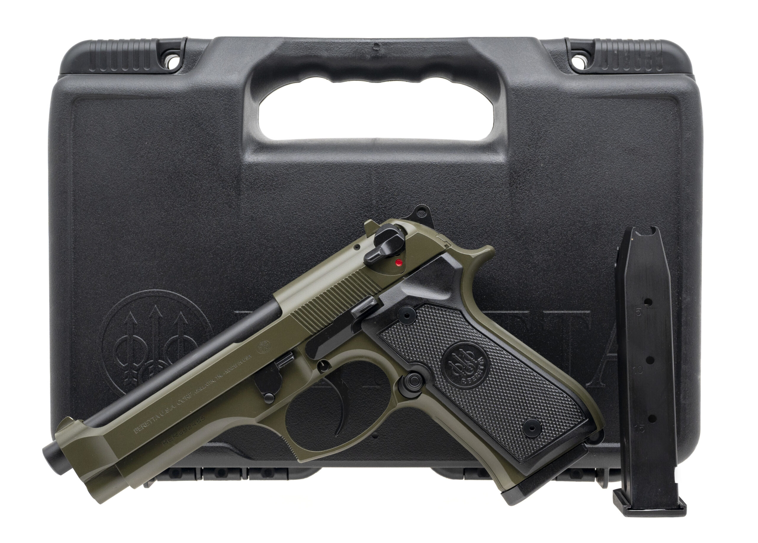 Alloy Frame Double-Action Pistol with a 4.9" Barrel. Full Size, 3-Dot Sights, Ambidextrous Manual Thumb-Safety/Decocker, OD Green Cerakote Finish, and Checkered Medallion Black Polymer Grips. Includes 2-15rd Magazines. NEW. UPC: 082442062211