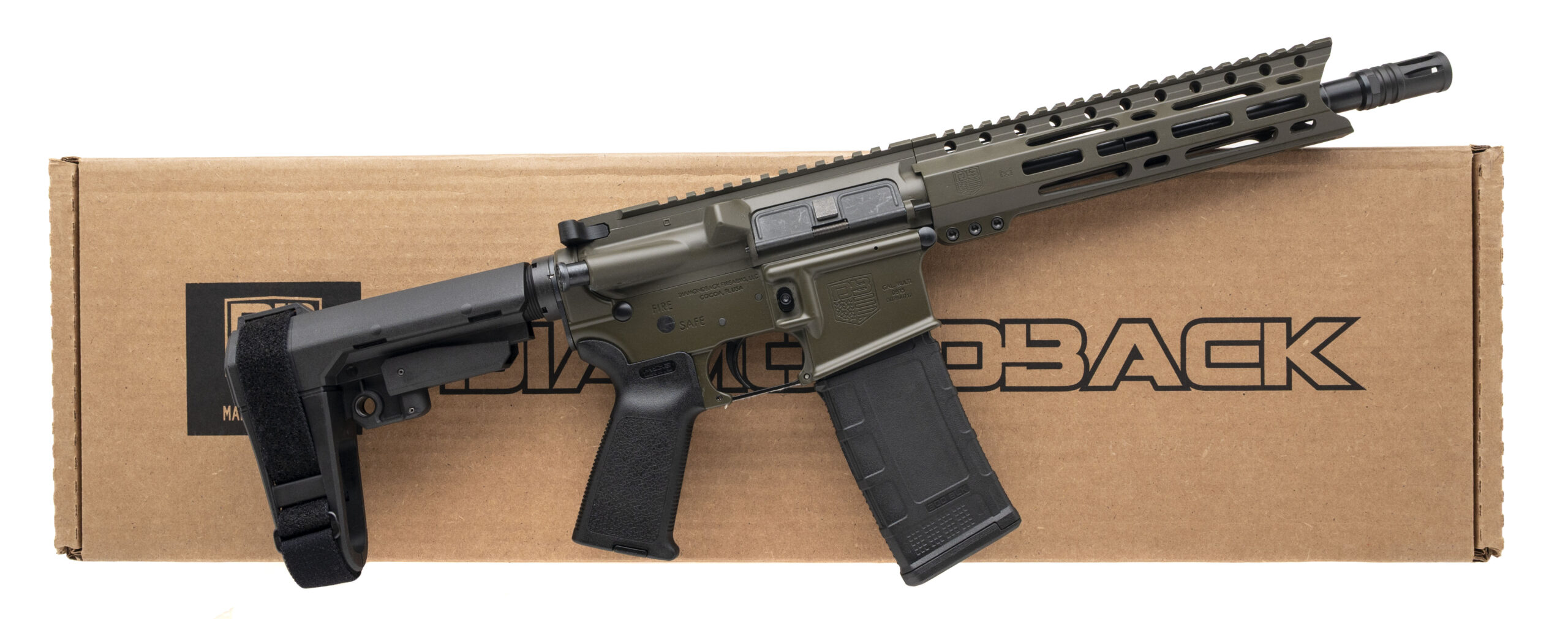 Semi-Automatic Tactical Pistol with a 10" Barrel. OD Green Cerakote Finish, 9" M-LOK Rail, Magpul Handguard, Flared Magwell, and an SB Tactical SBA3 Pistol Brace. Includes 1-30rd Magazine. NEW. UPC: 810035754416
