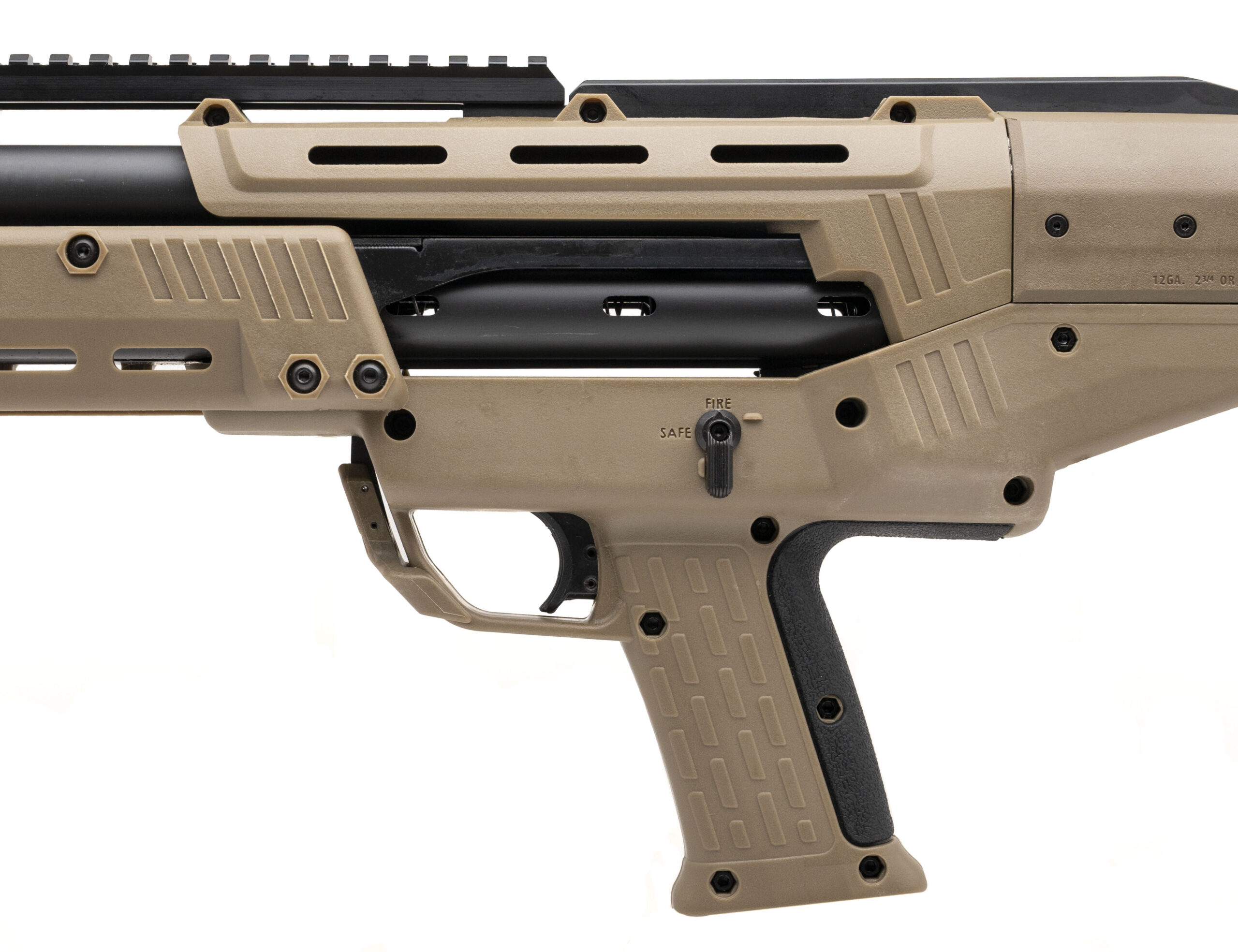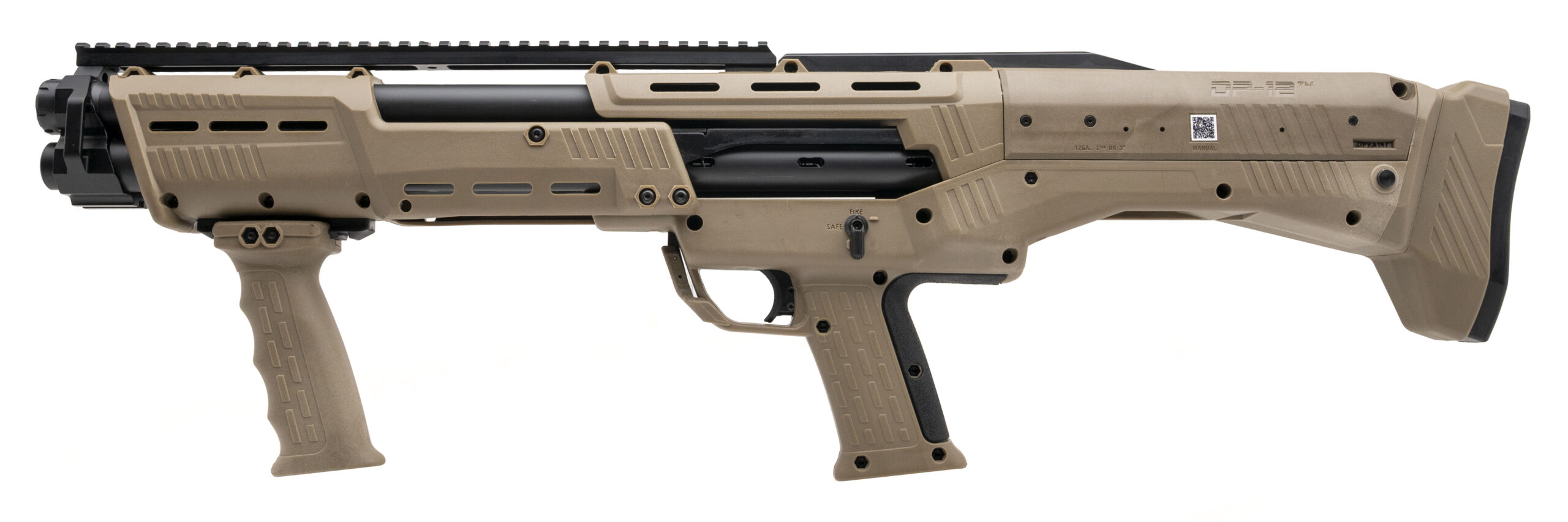 Double-Barrel Pump-Action Tactical Shotgun with 18.875" Barrels w/Removable Chokes Chambered for 2 3/4" & 3" Shells. Picatinny Optic Rail, Ambidextrous Controls, FDE Polymer Stock, and 7+7 Capacity. NEW. UPC: 810115913061