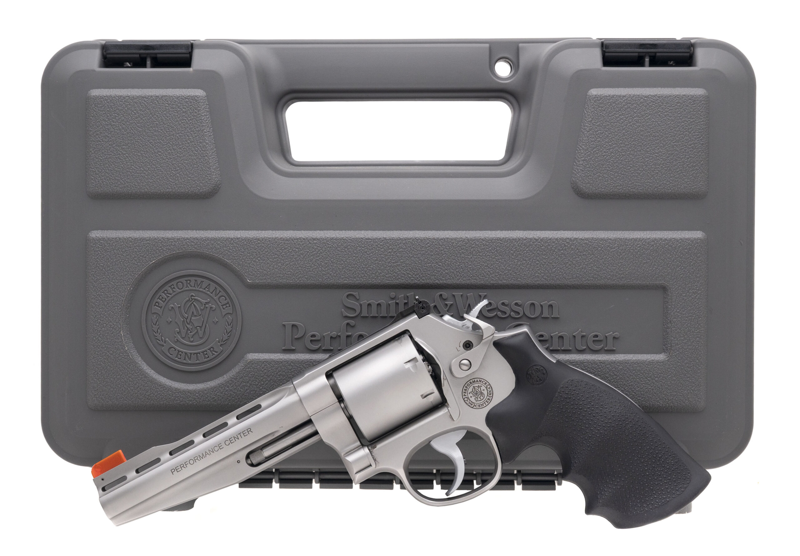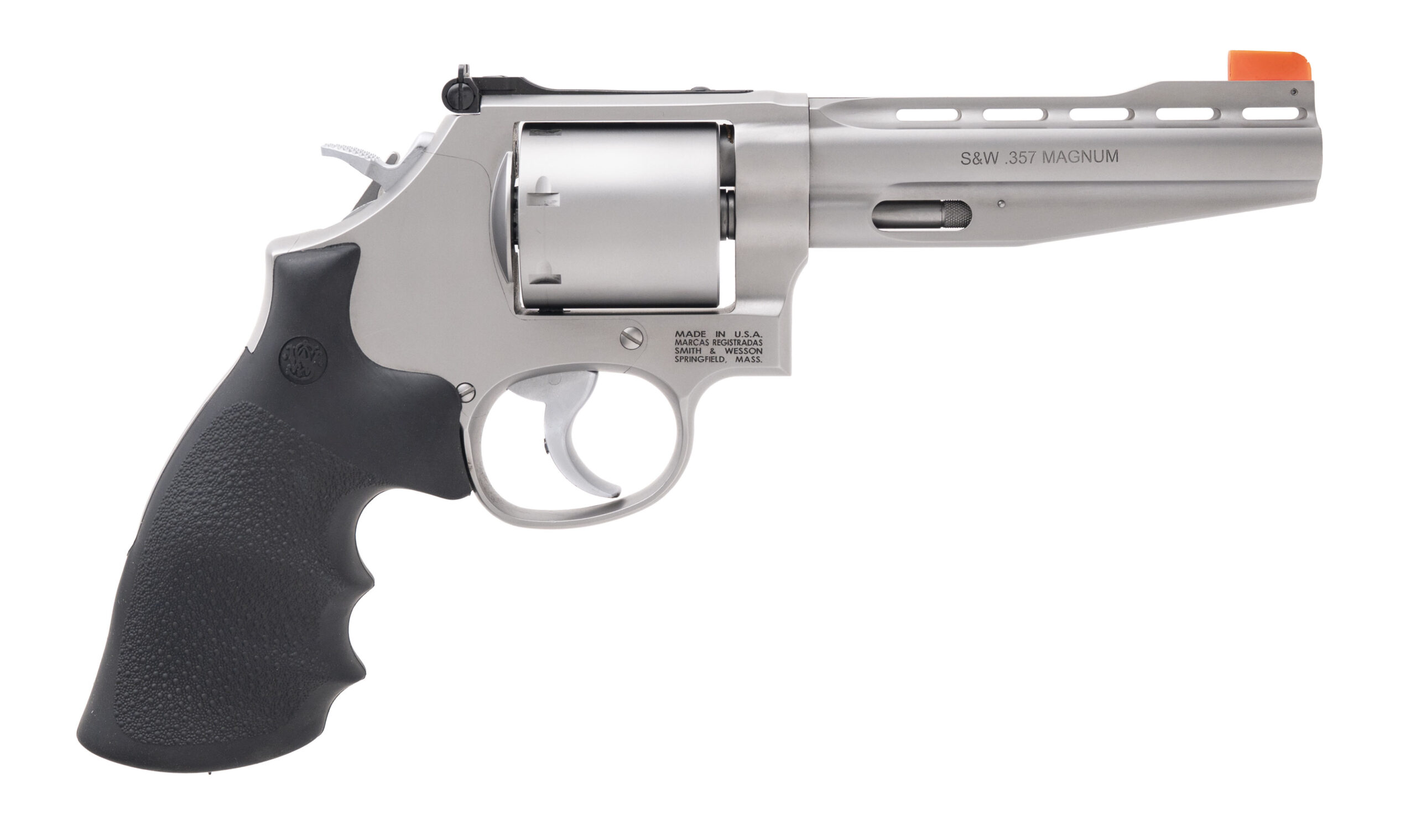 Performance Center Tuned Double Action 7 Shot Revolver with a 5" Vent Rib Barrel. L- Frame, Unfluted Cylinder, Performance Center Speed Release Thumbpiece, Stainless Steel Finish, Orange High-Vis. Front Sight, and Hogue Grips. Includes 2 Moon Clips. NEW. UPC: 022188871449