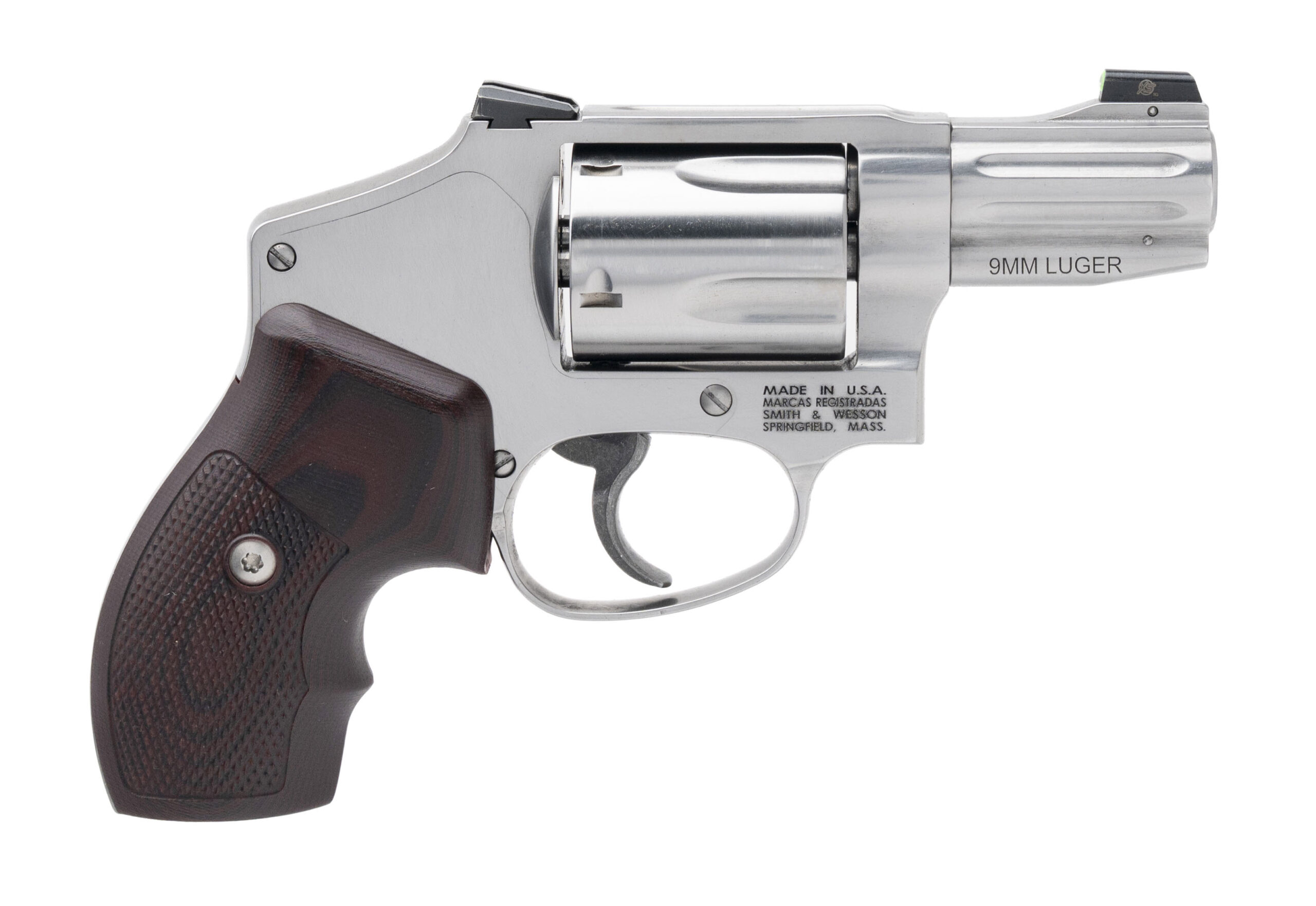 Exclusive Double-Action J-Frame Revolver with a 2.17" Fluted Barrel. 5rd Cylinder, Front Night Sight, Fixed U-Notch Rear Sight, Internal Hammer, VZ Diamond Checkered Black Cherry Grips, and Stainless Steel Frame. Includes 3-Moon Clips. NEW. UPC: 022188901313