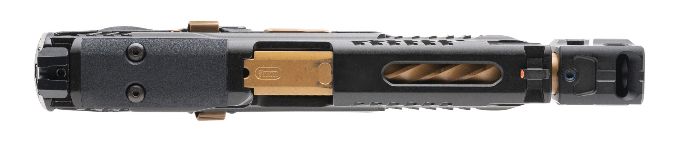TALO Exclusive Performance Center Tuned Striker Fired Pistol with a 4.25" Copper PVD Coated Spiral Fluted Threaded Barrel w/Strike Industries Compensator. Full Size, Armornite Finish, Polymer Frame, Optic Ready/Lightning Cut Slide, Tritium Front Sight, Flat-Faced Trigger, Copper PVD Controls, and an Accessory Rail. Includes 2-17rd & 2-23rd Magazines, Optic Plate Kit, Adjustable Backstraps, and Thread Protector. NEW. UPC: 022188905403(STOCK PHOTO)