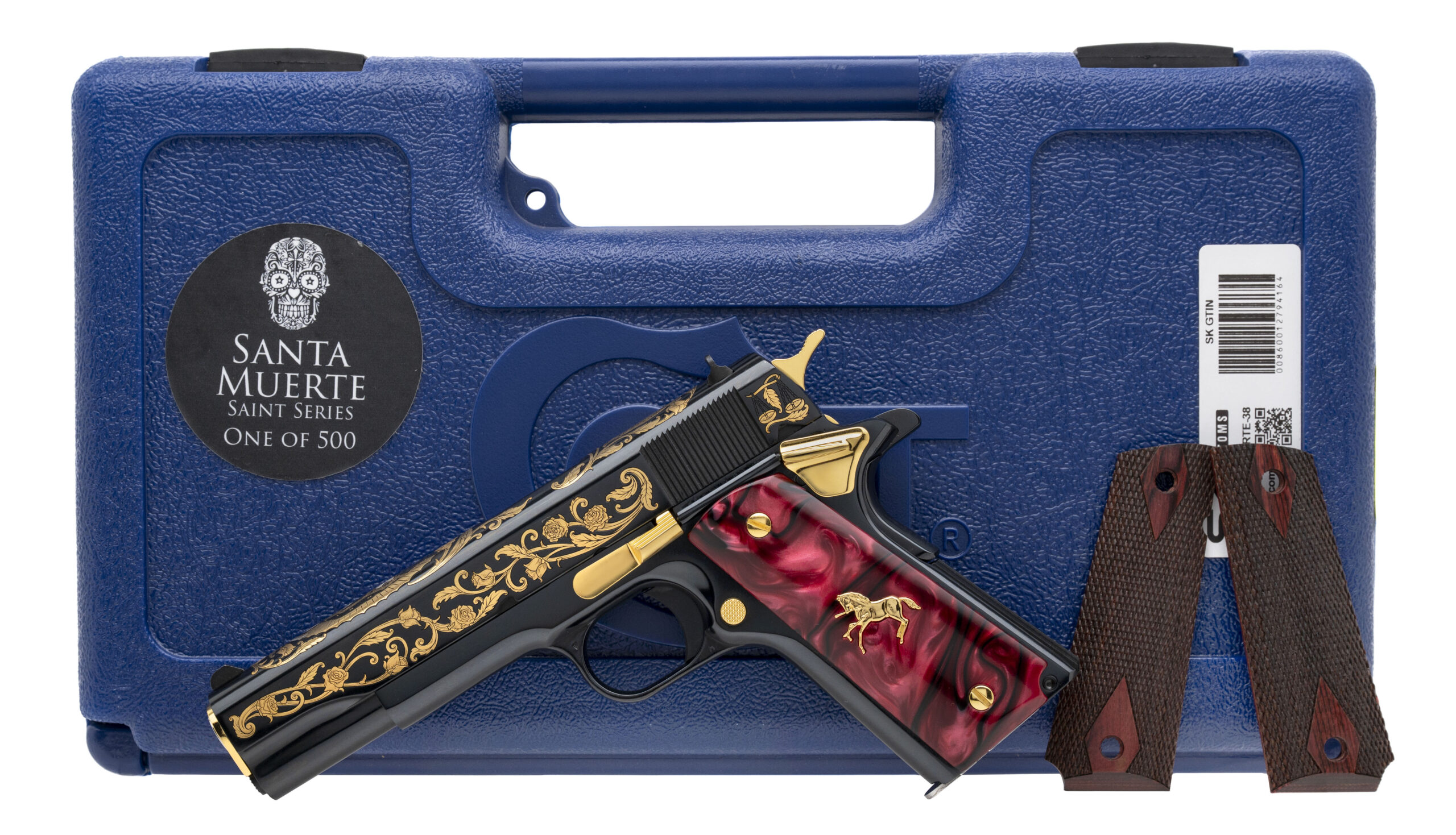 One of 500 made Custom Santa Muerte 1911 Pistol with a 5" Barrel. Government Size, Blued Finish w/Engravings & Gold Inlays, Fancy Grips w/Gold Stallion Inlay, and Gold Accents. Includes 1-9rd Magazine. NEW. UPC: 00860012794164