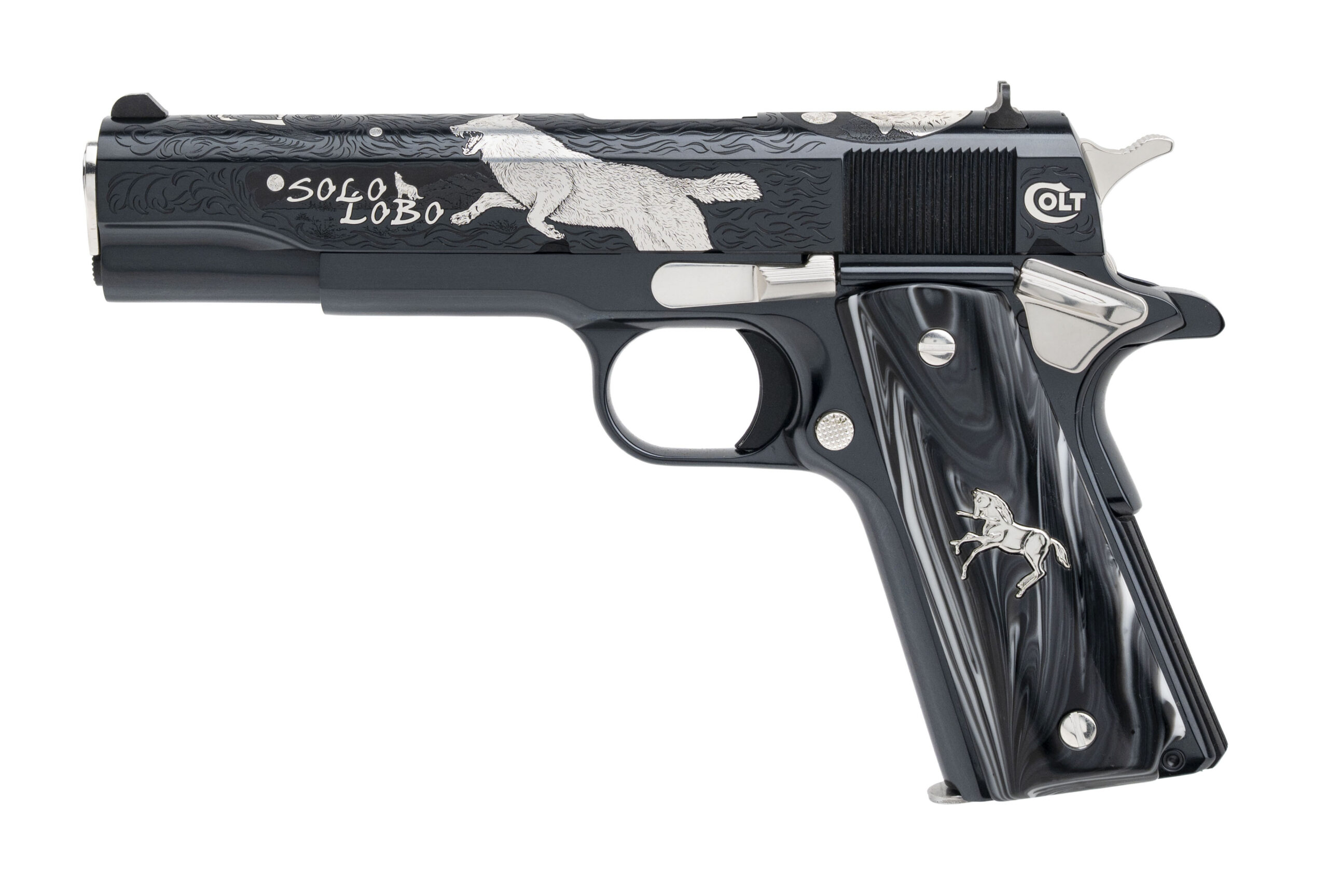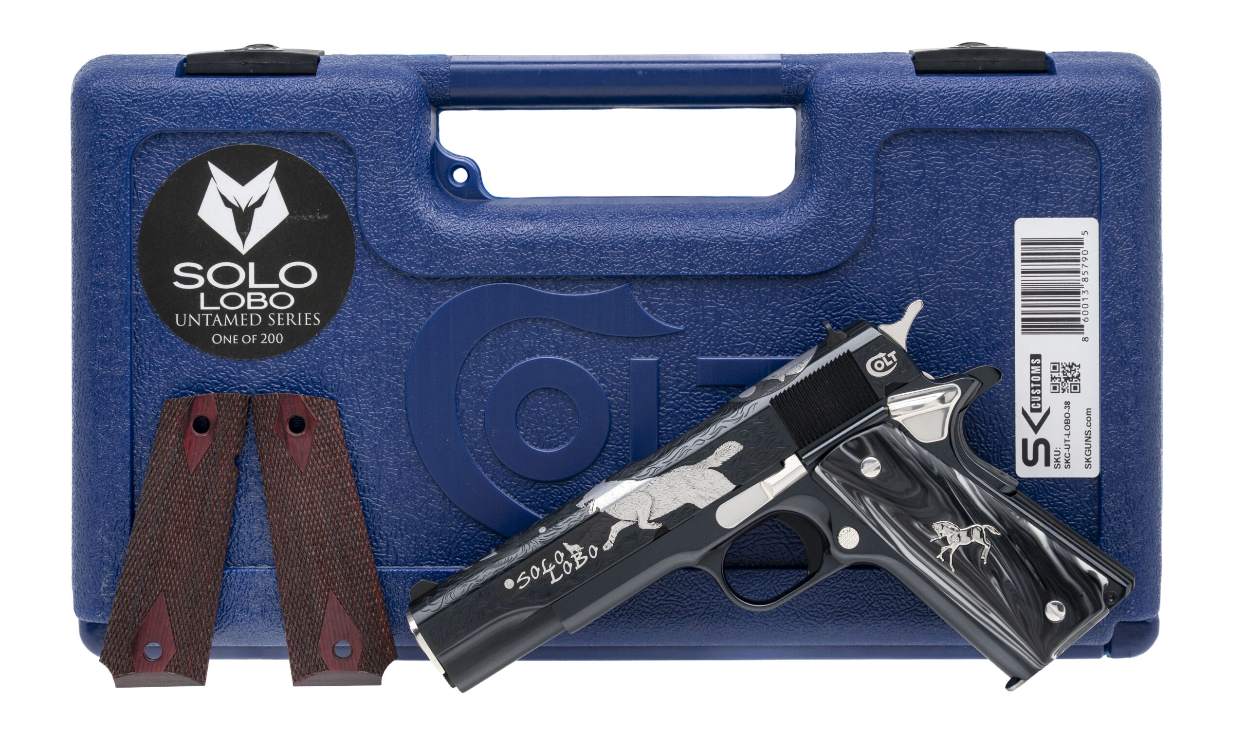 One of 200 Made SK Customs Solo Lobo Commemorative 1911 Pistol with a 5" Barrel. Government Size, Blue Finish, Etchings w/Silver Inlays, Kirinite Black Pearl Grips Grips w/Silver Stallion Inlay, and Silver Accents. NEW. UPC: 860013857905