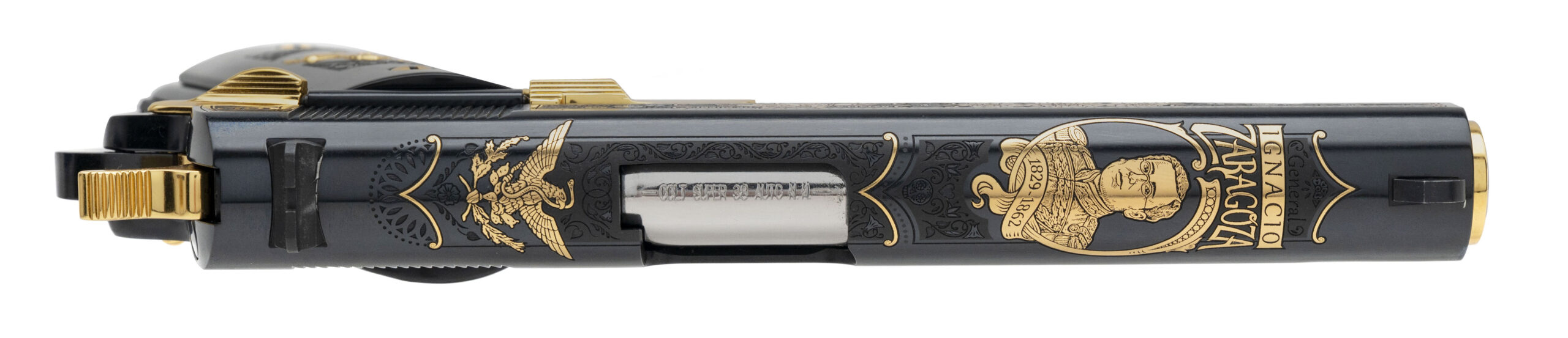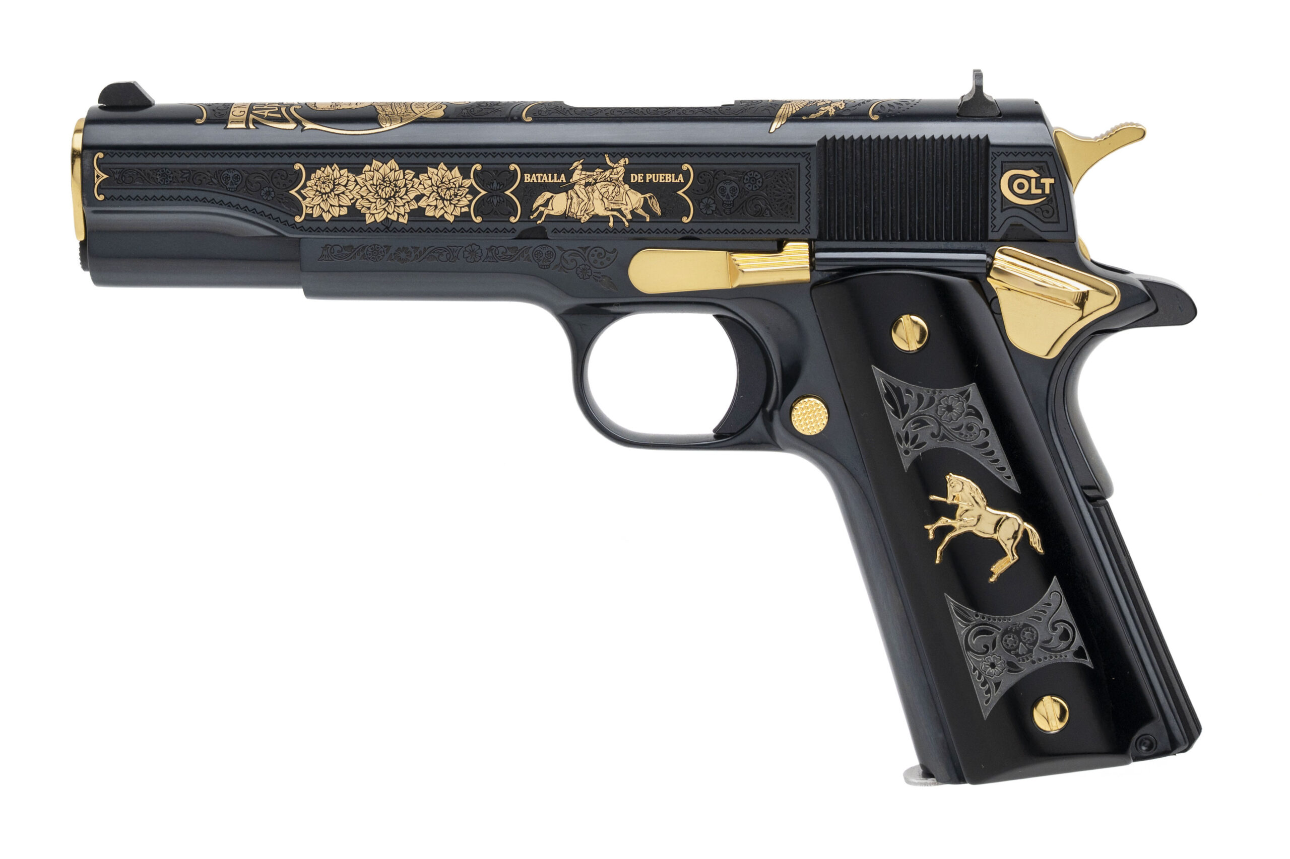 Limited Made SK Customs Cinco De Mayo Commemorative 1911 Pistol with a 5" Barrel. Government Size, Blue Finish, Etchings w/Gold Inlays, Fancy Grips with Etchings & Gold Stallion Inlay, and Gold Accents. NEW. UPC: 860013857929(STOCK PHOTO)