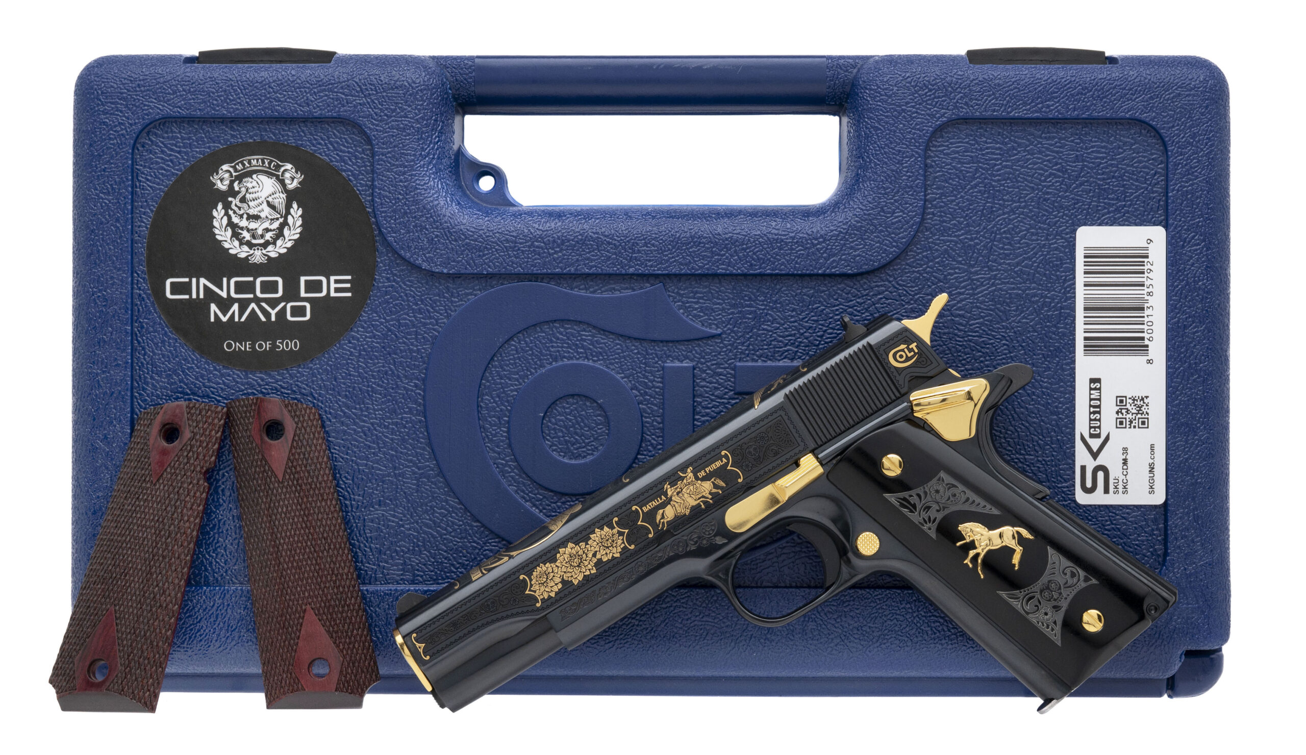 Limited Made SK Customs Cinco De Mayo Commemorative 1911 Pistol with a 5" Barrel. Government Size, Blue Finish, Etchings w/Gold Inlays, Fancy Grips with Etchings & Gold Stallion Inlay, and Gold Accents. NEW. UPC: 860013857929