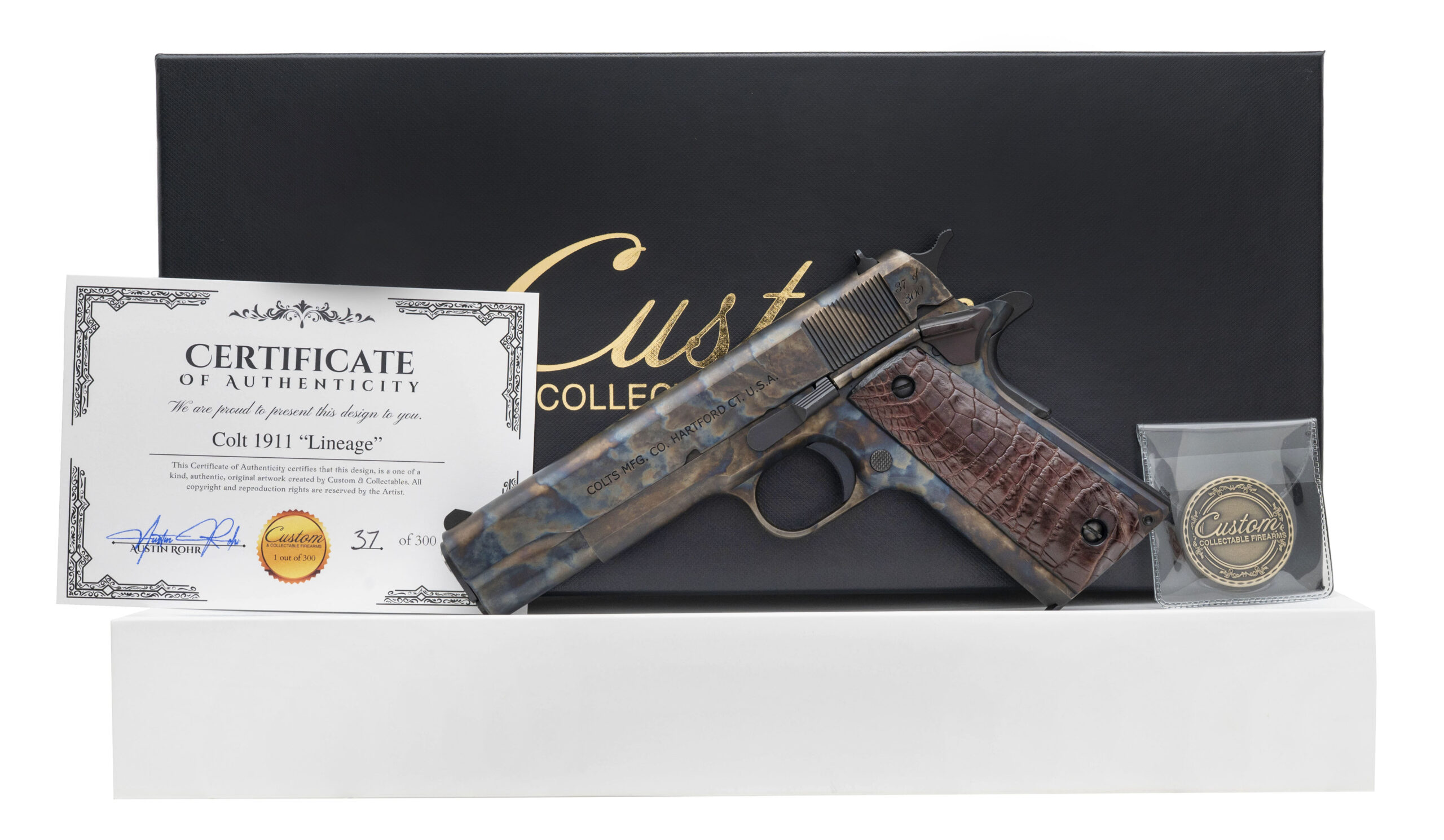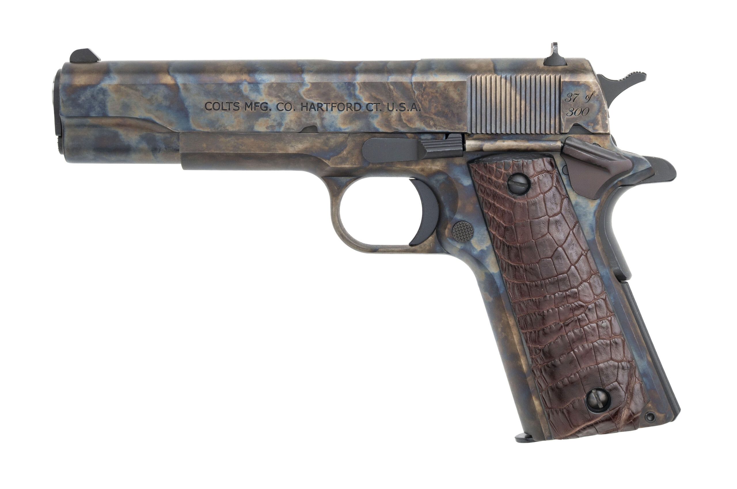 One of 300 Made Custom 1911 Pistol with a 5" Barrel. Government Size, Color Case Hardened Metal, Genuine Alligator Grips, and Blacked Out Sights. Includes 1-9rd Magazine and Collectible Coin. NEW. UPC: 199284487017