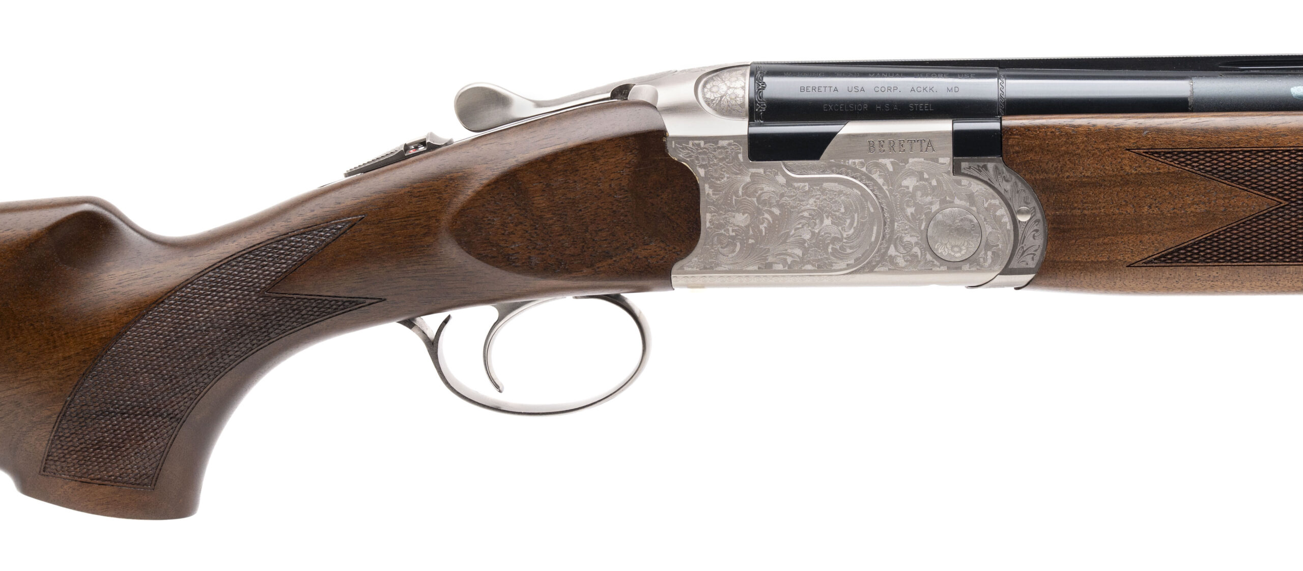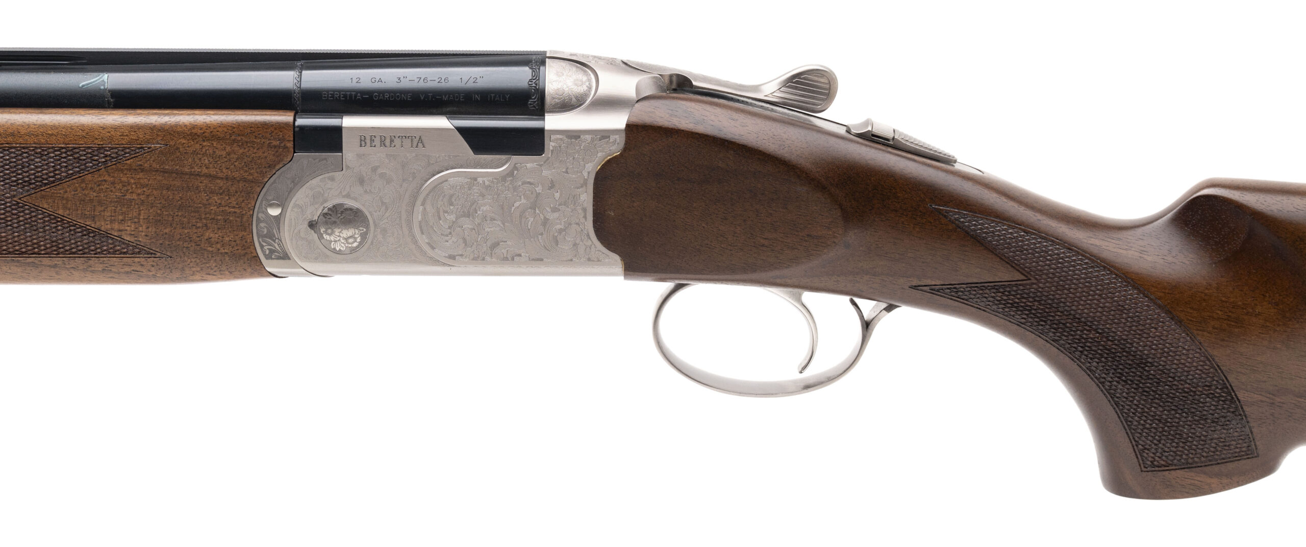 Over/Under Field Shotgun with 26" Vent Rib Barrels and 3" Chambers. Engraved Stainless Receiver, Blued Finish, and Checkered Wood Stock with a 14.75" LOP. Includes Choke Set. NEW. UPC: 082442989716 (STOCK PHOTO)