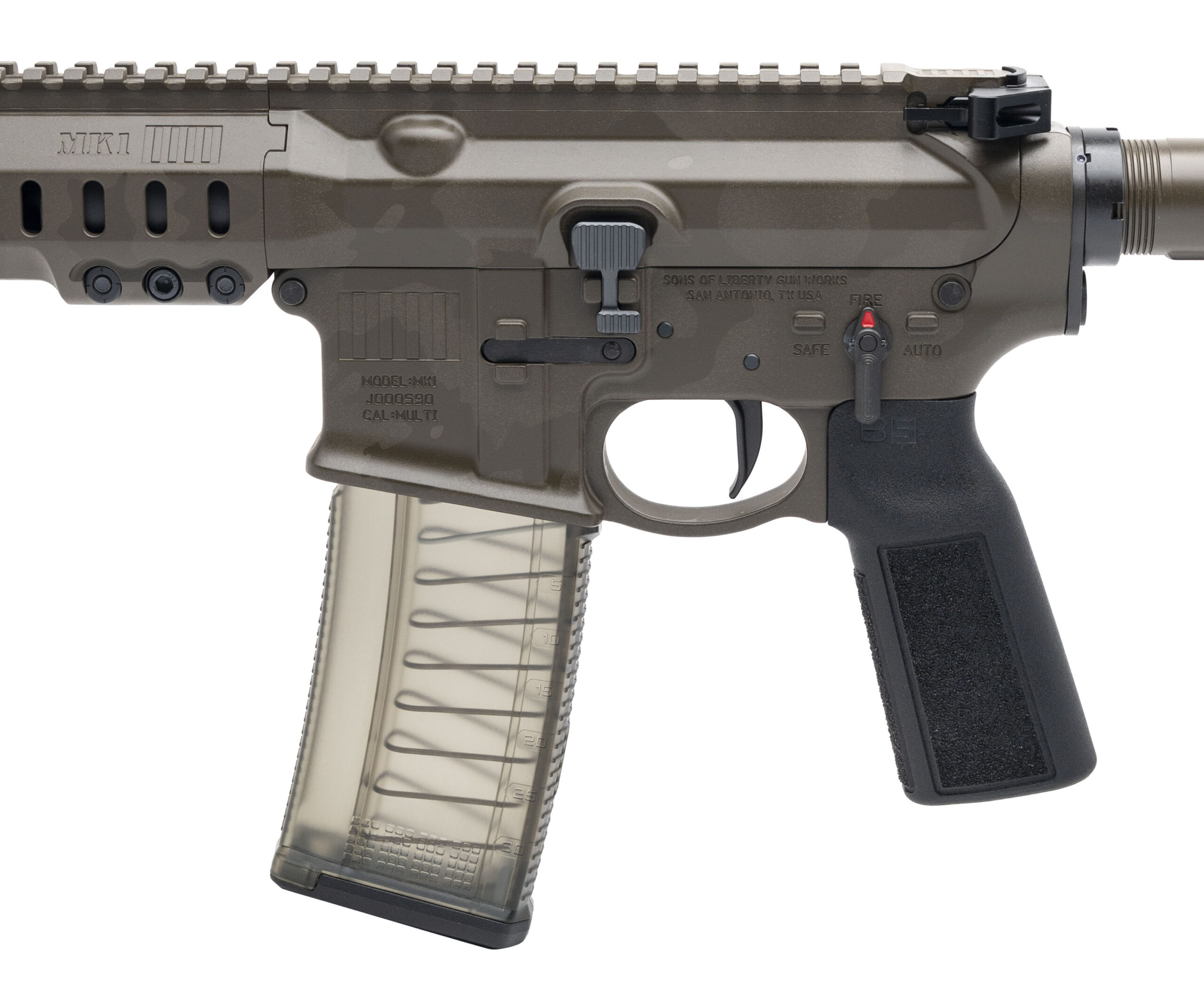 Semi-Auto Tactical Pistol with an 11.5" Barrel w/Huxwrx Flash Hider. MK1 Camouflage Cerakote Finish, Textured MK1 MLOK Handguard, Badger Ordnance Ambidextrous Safety, Liberty 2-Stage Trigger, SB5 Tactical Brace, B5 Systems Pistol Grips. Includes 1-30rd Translucent Magazine, and Soft Carry Bag. NEW. UPC: 657628672074