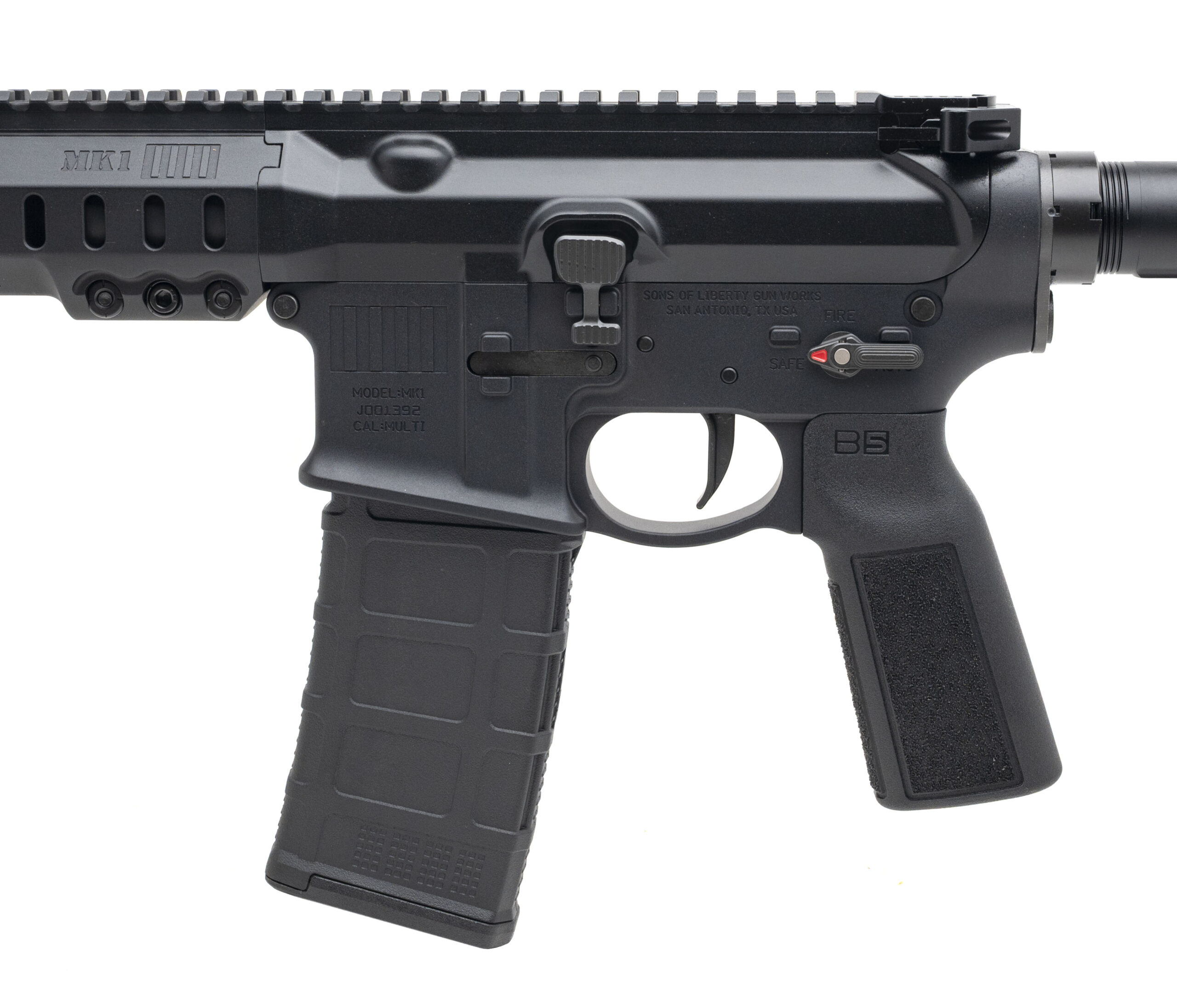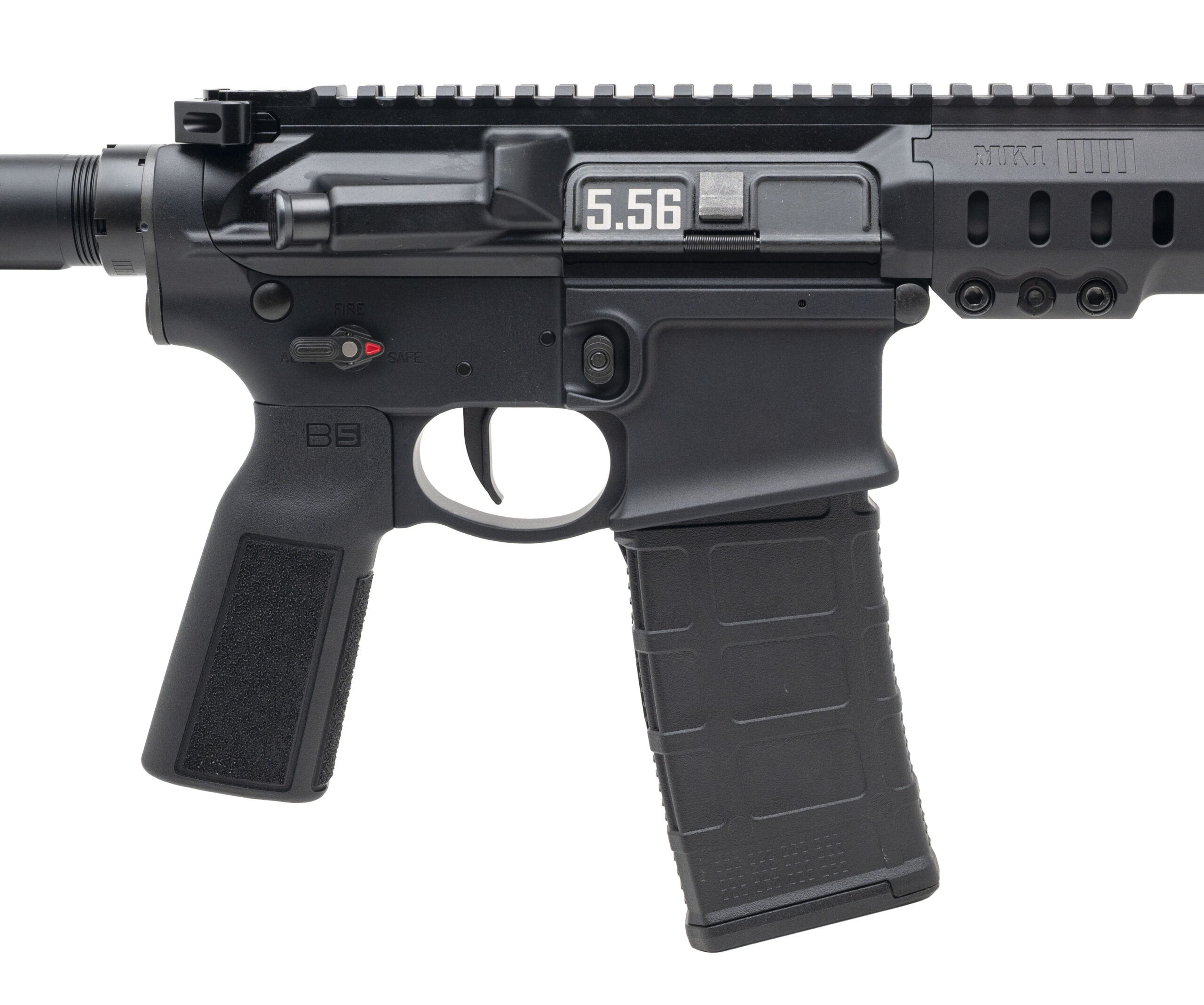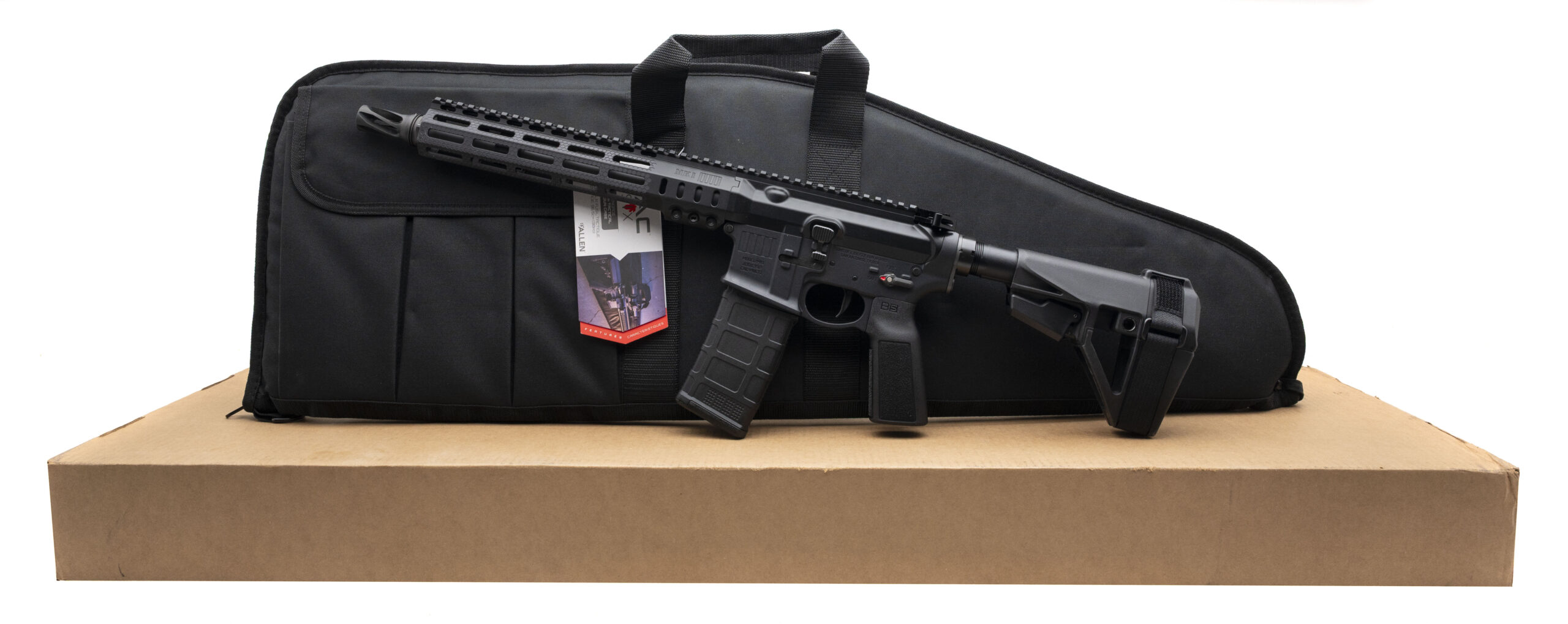 Semi-Automatic Tactical Pistol with a 11.5" P3 Chrome Lined Barrel w/Huxwrx Flash Hider. Anodized Finish, Textured MK1 MLOK Handguard, Badger Ambidextrous Safety, Liberty 2-Stage Trigger, SB Tactical Brace, and B5 Systems Grip. Includes 1-30rd Magazine and Soft Carry Bag. NEW. UPC: 657628671978
