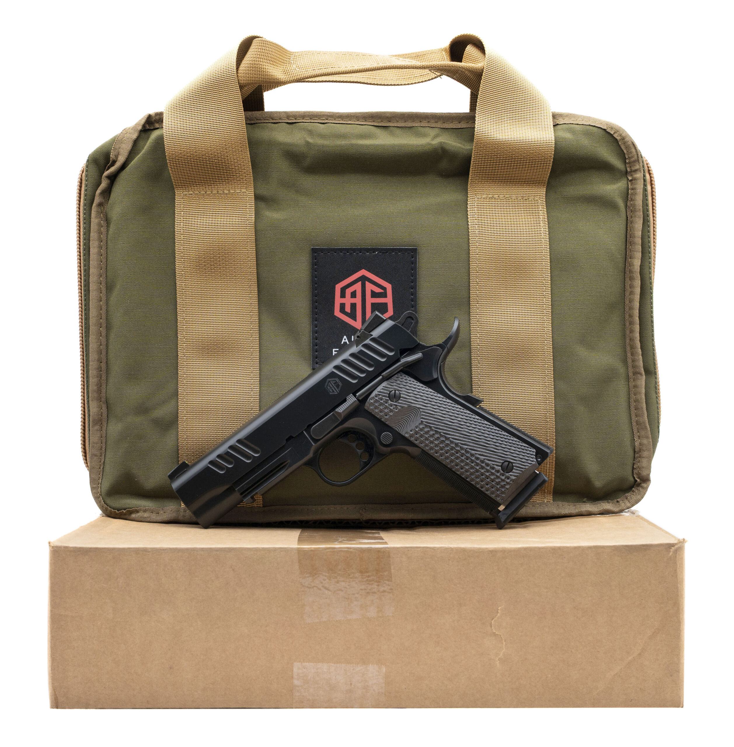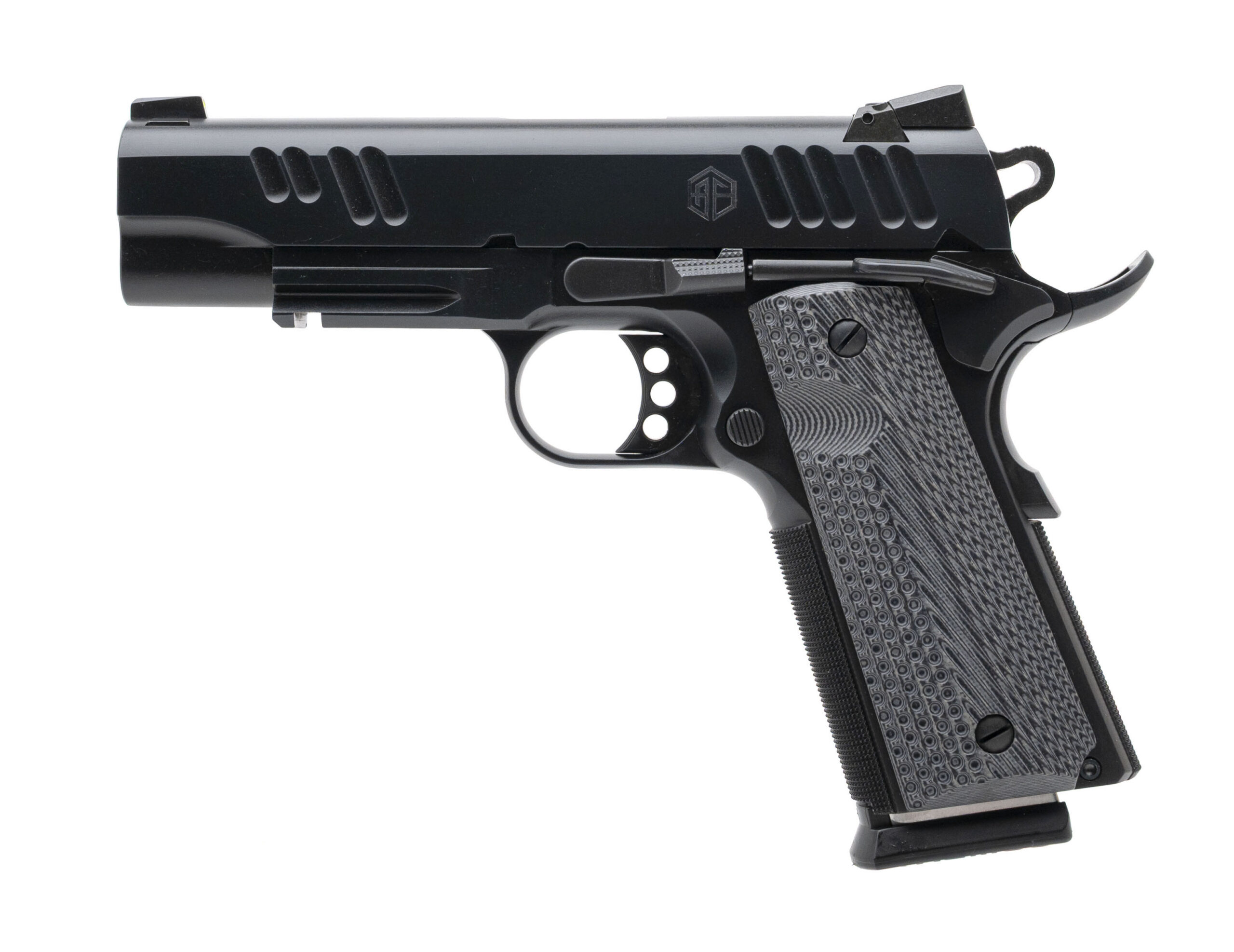 Enhanced 1911 Pistol with a 4.25" Stainless Steel Bull Barrel. Compact, Steel Frame, QPQ Finish, Green Dot Front & Fiber Optic Rear Sights, G10 Grips, and an Accessory Rail. Includes 1-10rd Magazine and an AF Carry Bag. NEW. UPC: 810100531928(STOCK PHOTO)