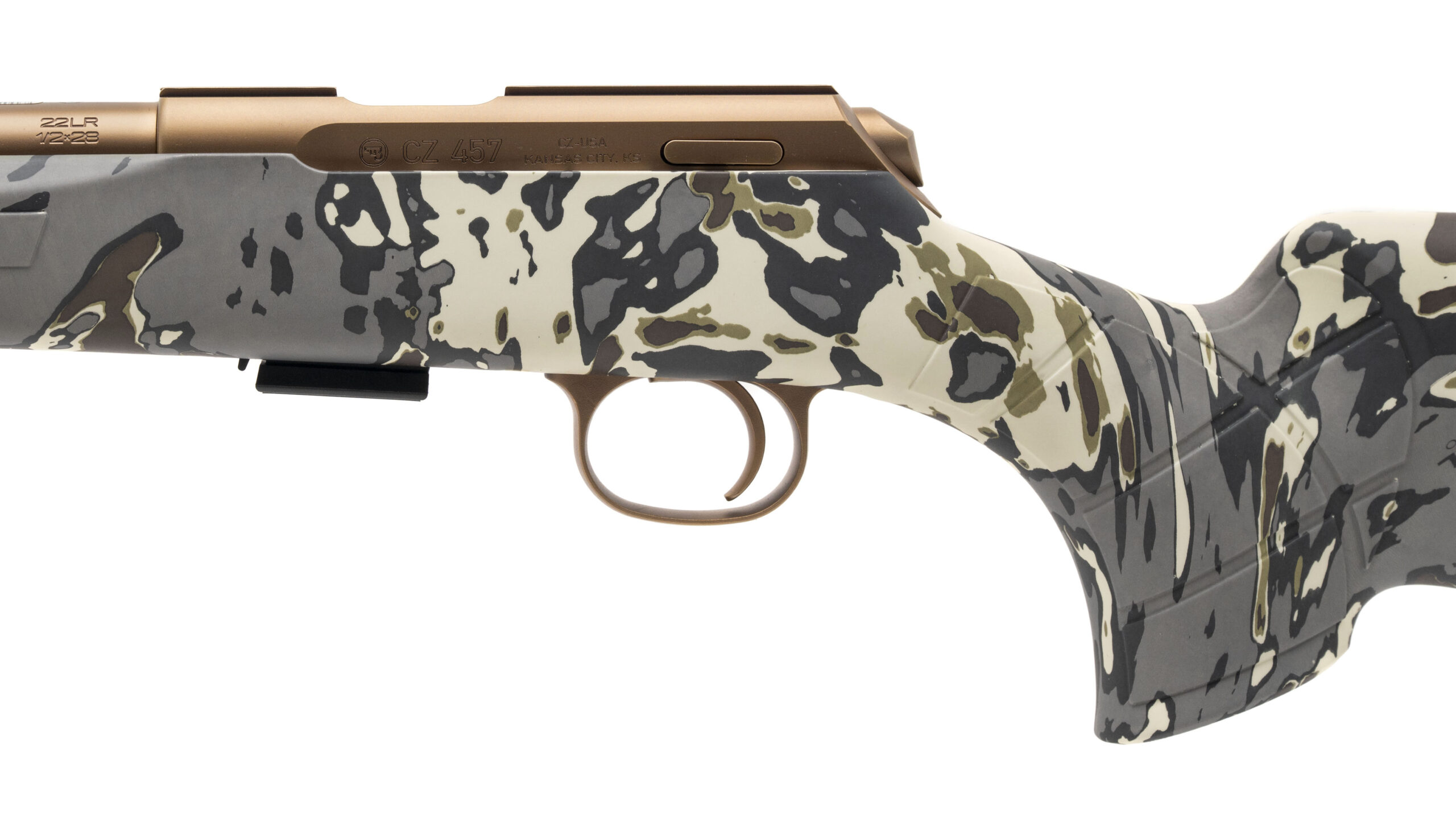 Bolt-Action Rimfire Rifle with a 20" Barrel w/Muzzle Device. PVD Bronze Finish, and Veil Camouflage Synthetic Stock. Includes 1-5rd Magazine. NEW. UPC: 806703023229 (STOCK PHOTO)