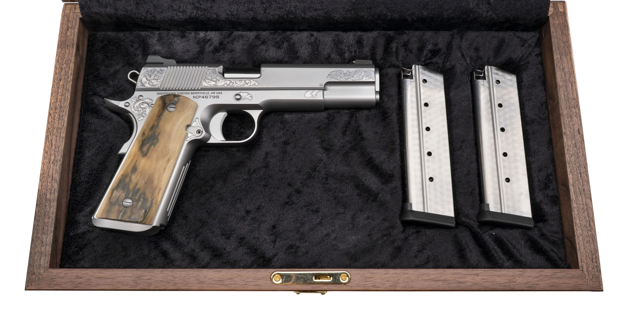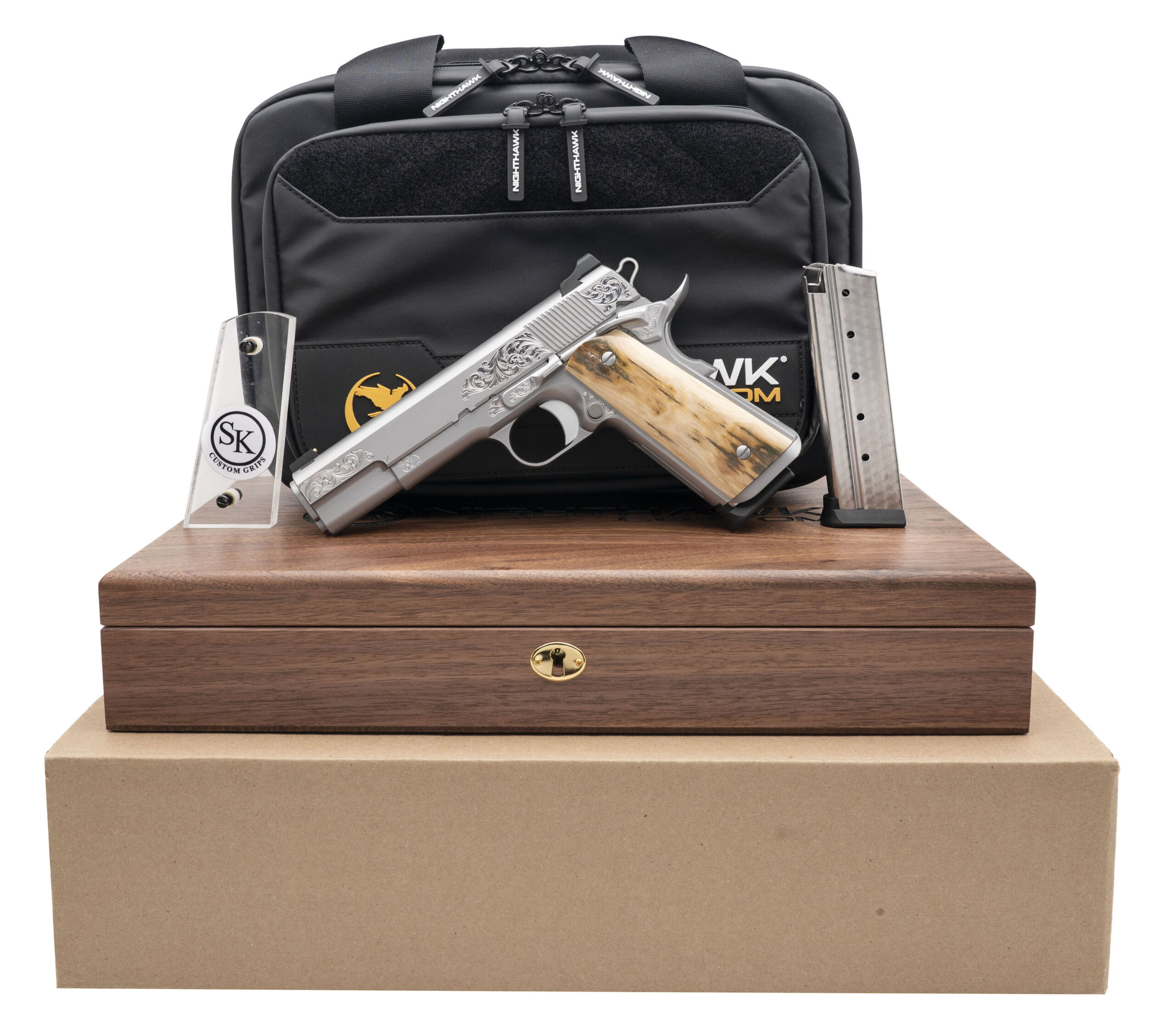 Custom 1911 Pistol with a 5" Stainless Steel Crowned Barrel Flushed Fit with Bushing. Full Size, Stainless Steel w/Bright Stainless Engravings, Mammoth Bark Grips, and Heinie Rear & Nighthawk 14k Gold Beaded Front Sights. Includes 2-8rd Jeweled Magazines and a Custom Hardwood Presentation Case. NEW. UPC: 806802761251