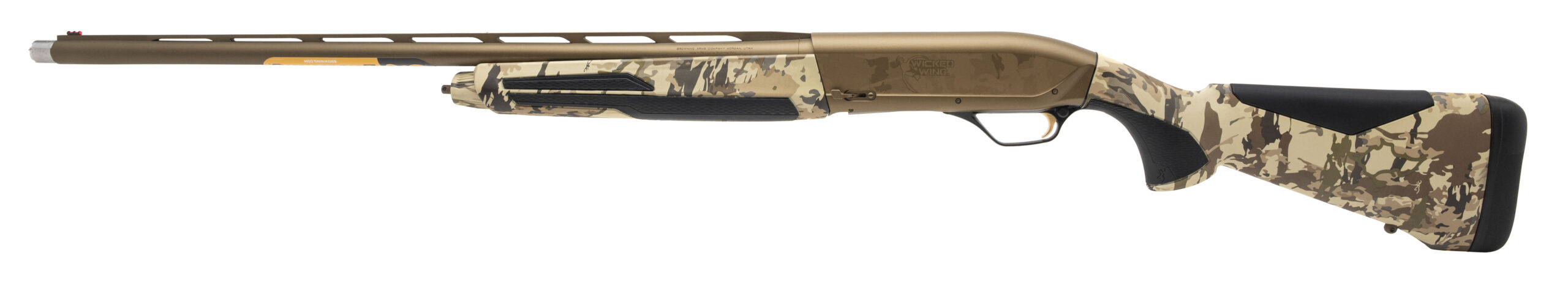 Semi-Automatic Field Shotgun with a 28" Vent Rib Barrel w/Extended Removable Choke Chambered for 2 3/4", 3", & 3 1/2" Shells. Fiber-Optic Front Sight, Burnt Bronze Cerakote Finish, and Textured Auric Camouflage Finished Composite Forend & Stock with a 14.75" LOP. Includes Choke Set. NEW. UPC: 023614855507