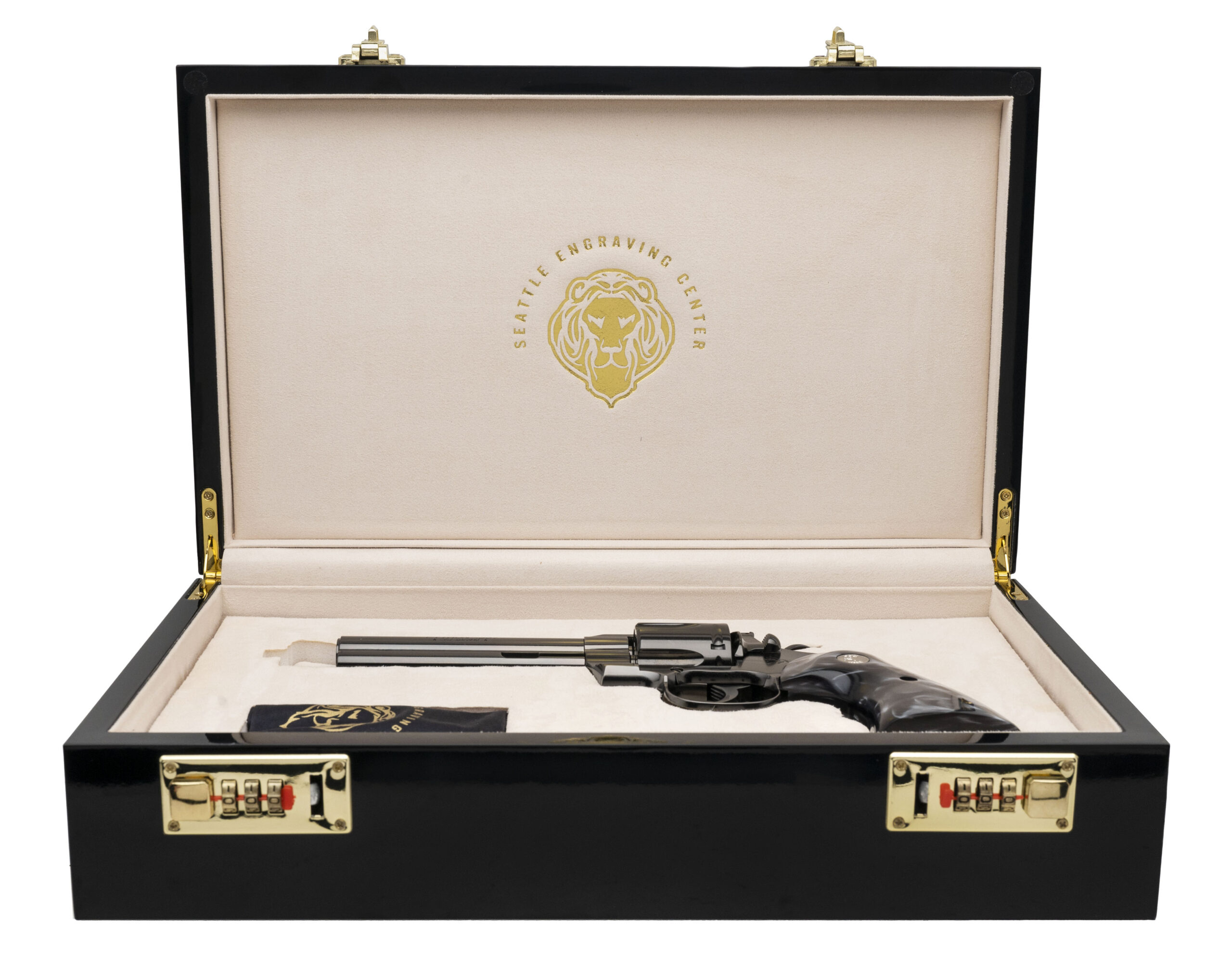 Colt Python Revolver. .357 Magnum Snake Gun with a 5" Vent Ribbed Barrel. Black Chrome Finish, Beautiful Grips, and Recessed Target Crown. Includes Seattle Engraving Center Presentation Case/Lock Box. NEW. UPC: 098289003416