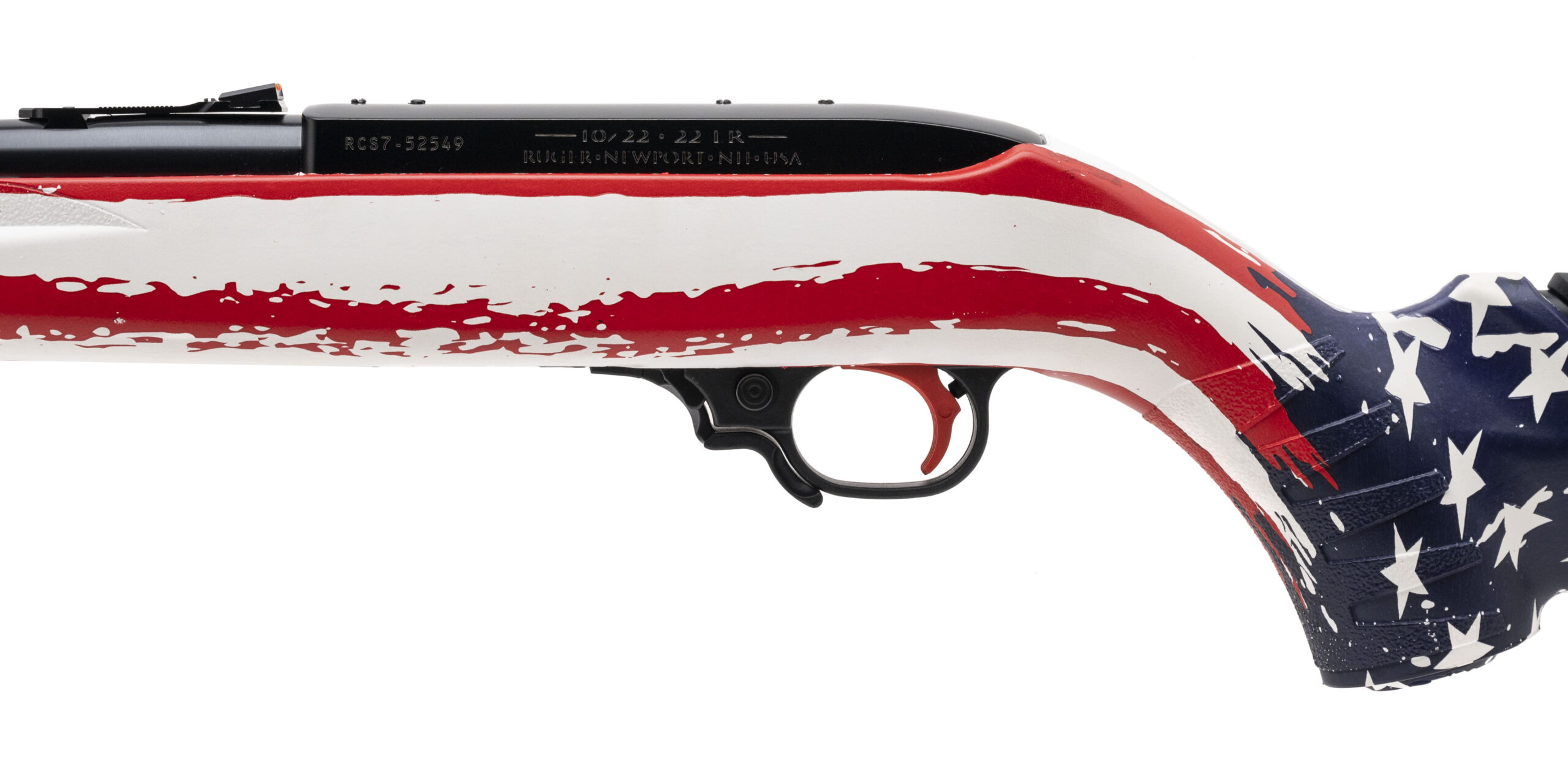 Ruger 10/22 Collector's Series Rifle .22LR. Semi-automatic with an 18.5" Threaded Barrel, Black Satin Finish, American Camo Dipped Synthetic Stock, Adjustable Rear & Fiber Optic Front Sight, and BX-Trigger. 10 Round Magazine Capacity. 1/2x28" Thread Pitch. NEW. UPC:736676312078