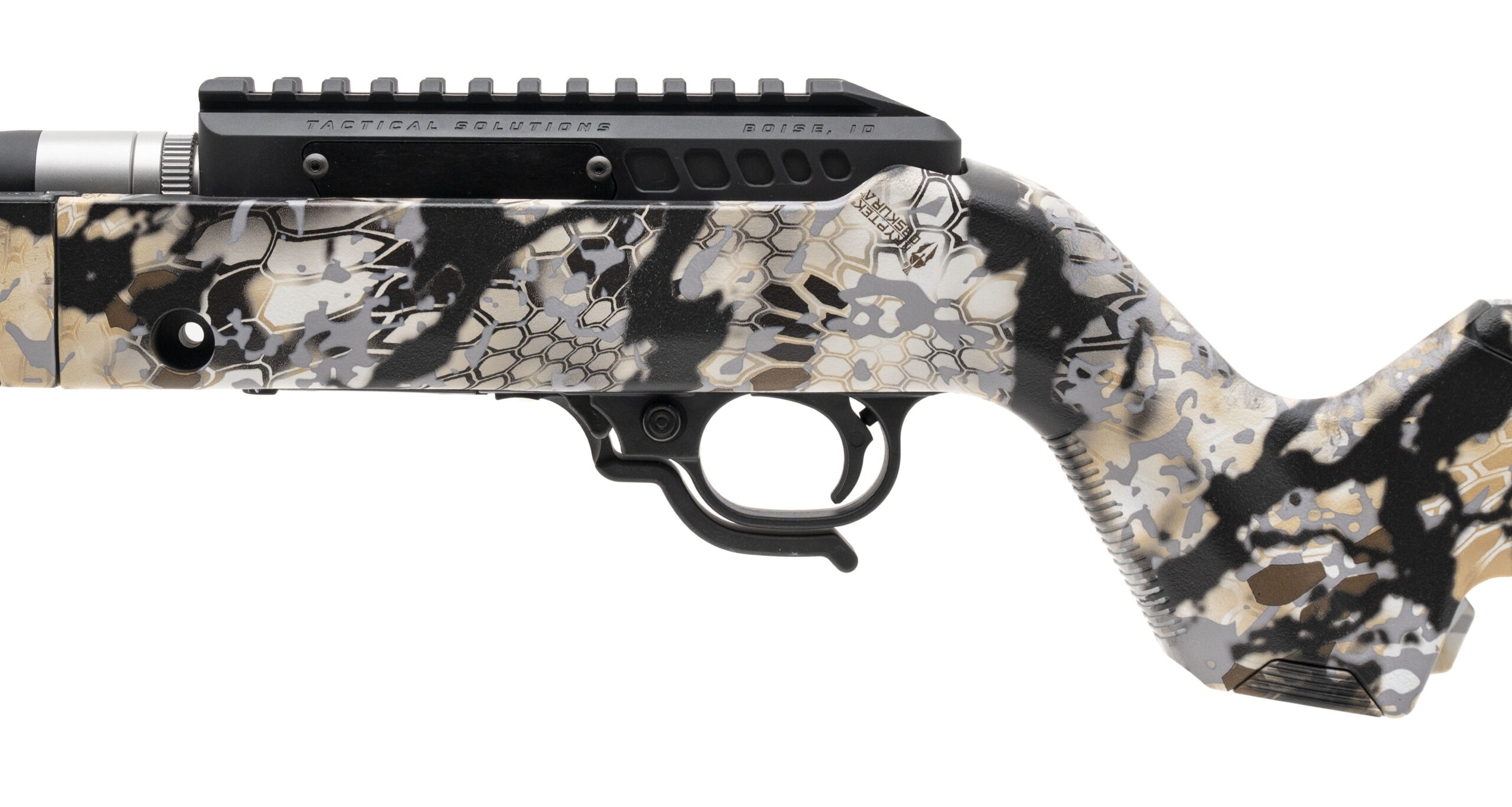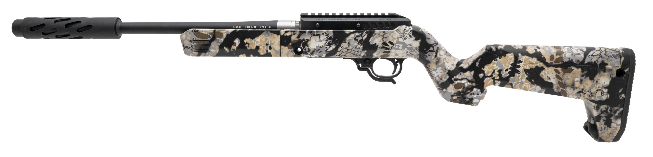 Take Down Semi-Auto Rifle with a 16.5" SBX Threaded Barrel w/Faux Suppressor & Shroud. Matte Black Finish, Synthetic Kryptek Obscura Skyfall Backpacker Stock, and Extended Magazine Release. NEW. UPC: 879971004689