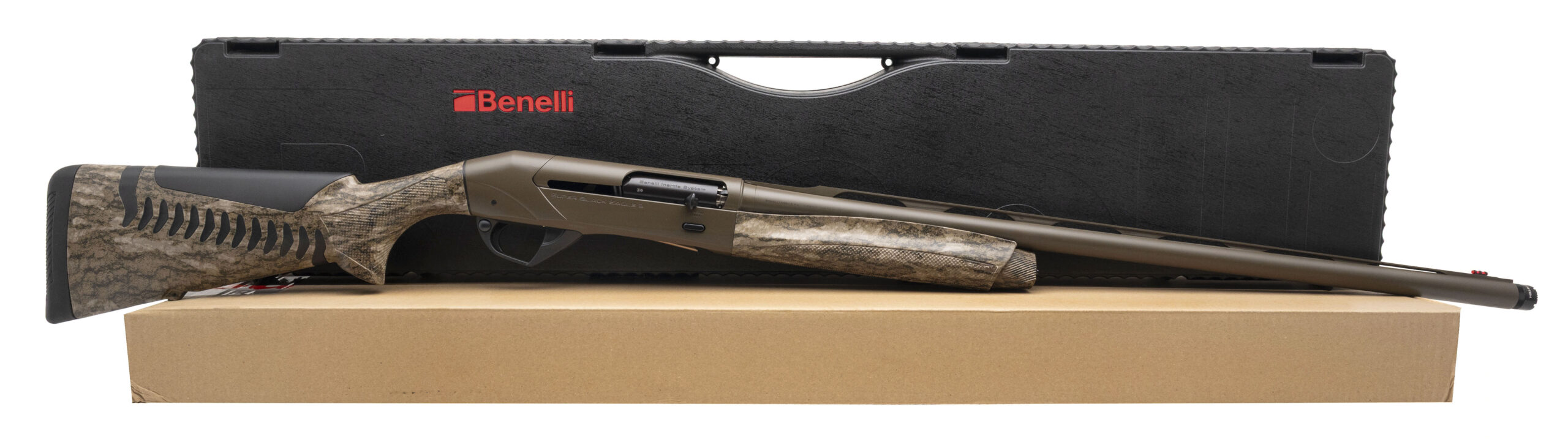 Semi-Auto Field Shotgun with a 28" Vent Rib Advanced Impact Barrel w/Extended Choke Chambered for 2 3/4", 3", & 3 1/2" Shells. Fiber-Optic Front Sight, Patriot Brown Cerakote Finish, and Mossy Oak Bottomland Camouflaged Synthetic Stock & Forend with a 14.5" LOP. NEW. UPC: 650350123715
