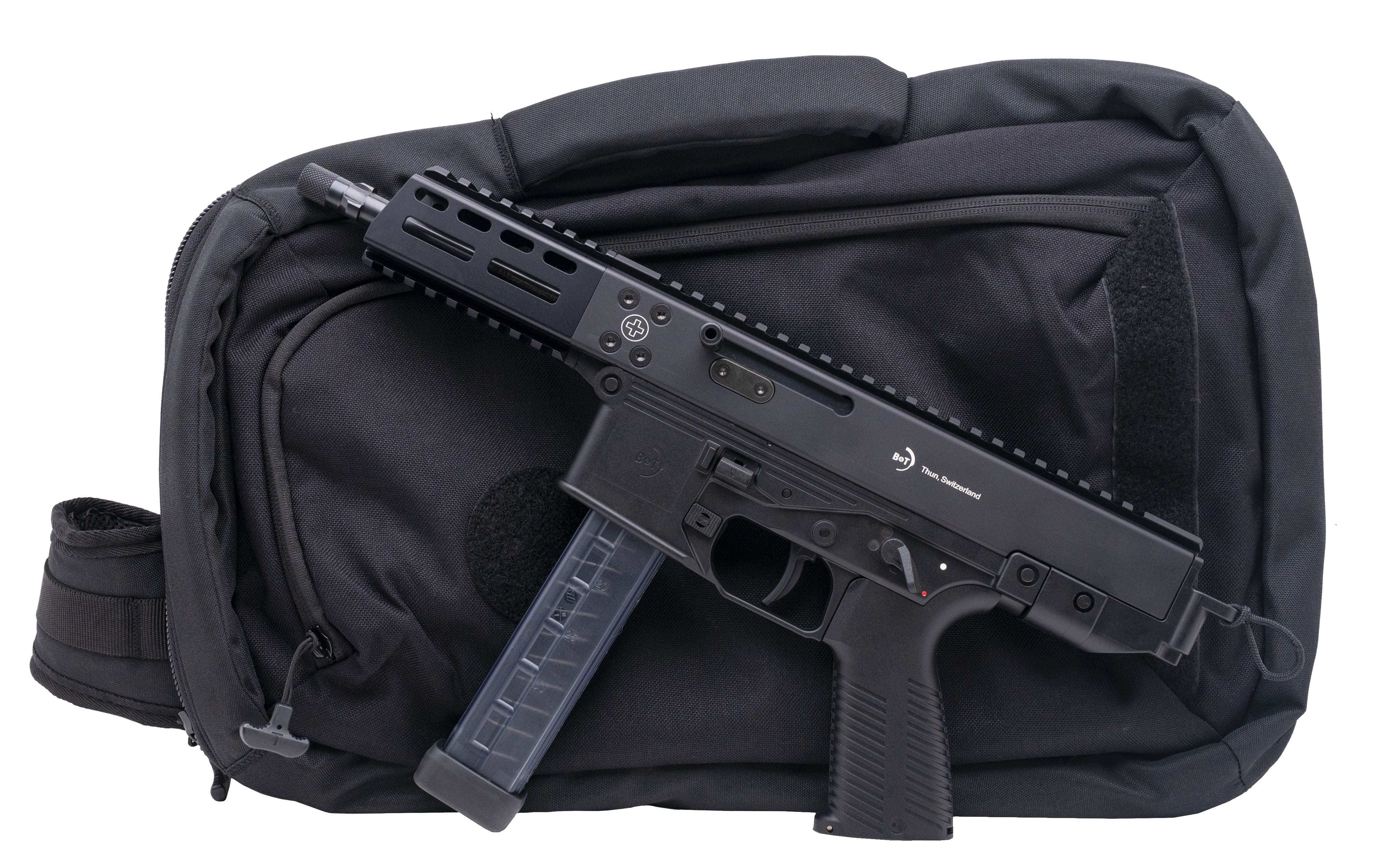 Swiss made Tactical Pistol with reciprocating bolt and picatinny handguard with threaded tri-lug muzzle device. Comes with 30 round magazine and tactical carry bag. New. UPC: 840225705775