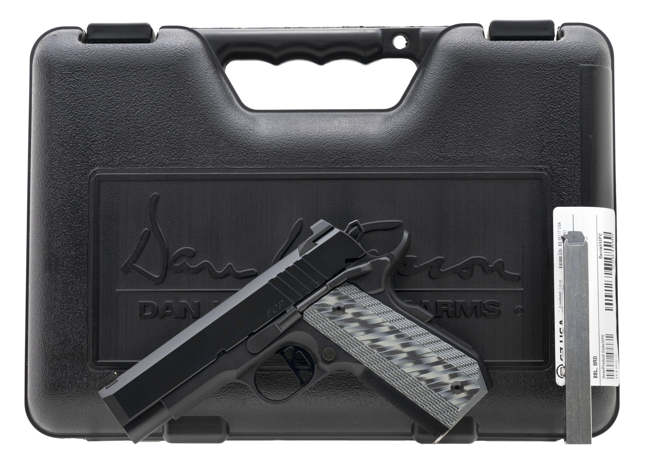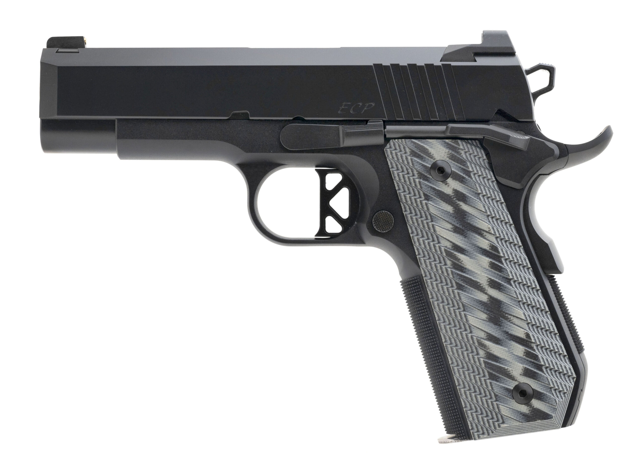 Dan Wesson 1911 ECP Pistol. .45 ACP with a 4" barrel. Compact 1911 Pistol with a matte black finish and steel frame with a manual thumb safety and a grip safety.