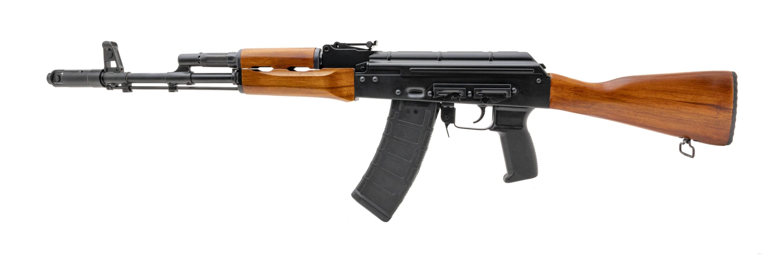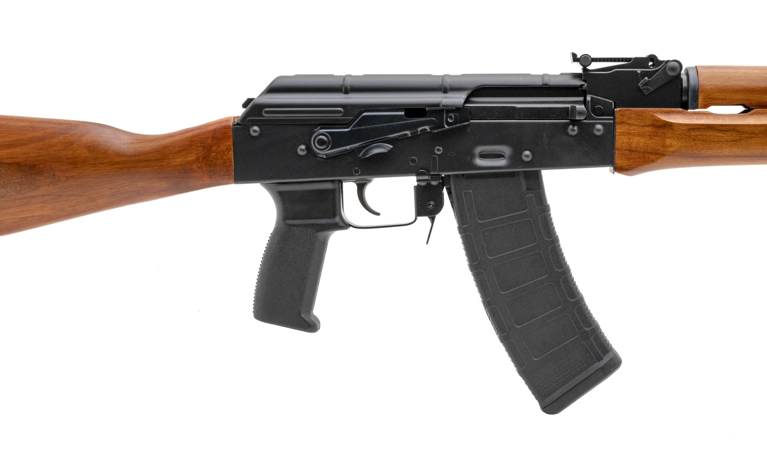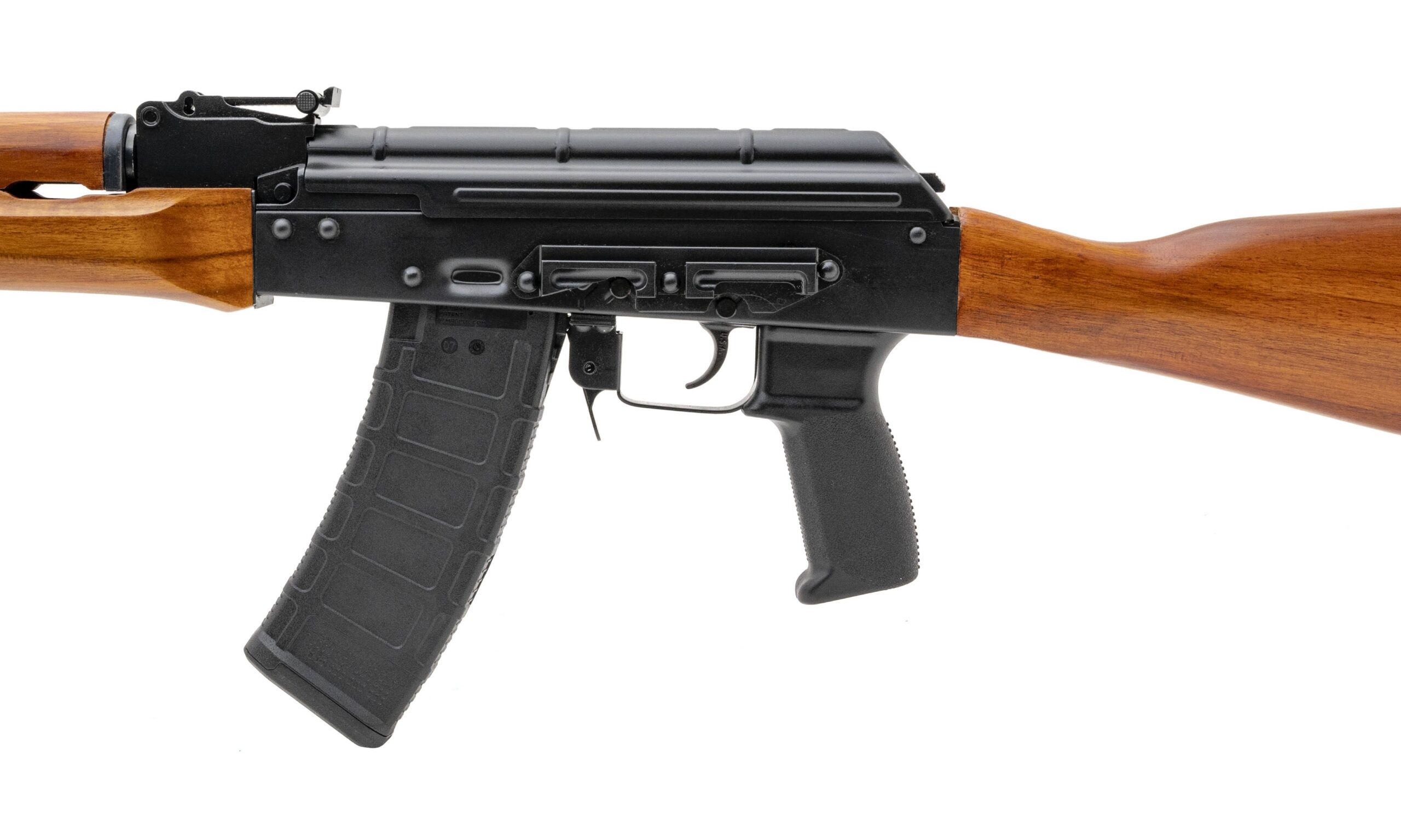 SNC03866 Semi-automatic AK rifle chambered in 5.45x39mm. Has a 16" barrel, Stained solid TEAK wood butt stock, upper and lower hand guards and black polymer pistol grip, adjustable sights, and one 30 round magazine, FORGED Trunion, bolt and carrier Extended magazine release NEW. UPC:850028892077.(Stock Photo)(DALLAS LOCATION)
