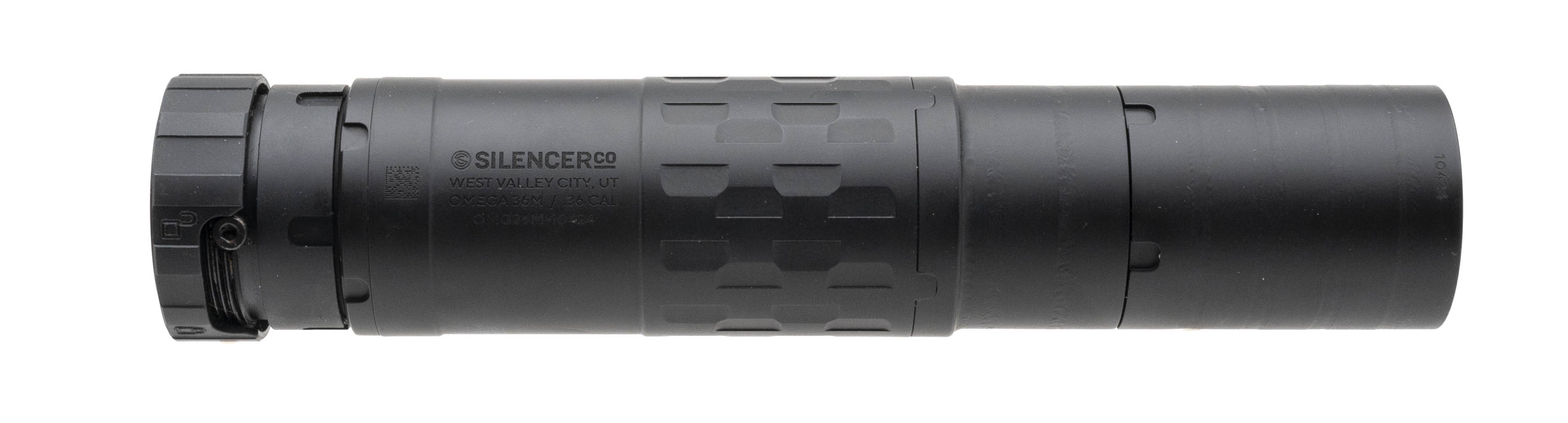 SilencerCo Omega 36M Suppressor. .36 Cal Overall length is 7.75". Total weight is 9.2 OZ, black cerakote . New. UPC: 816413026625