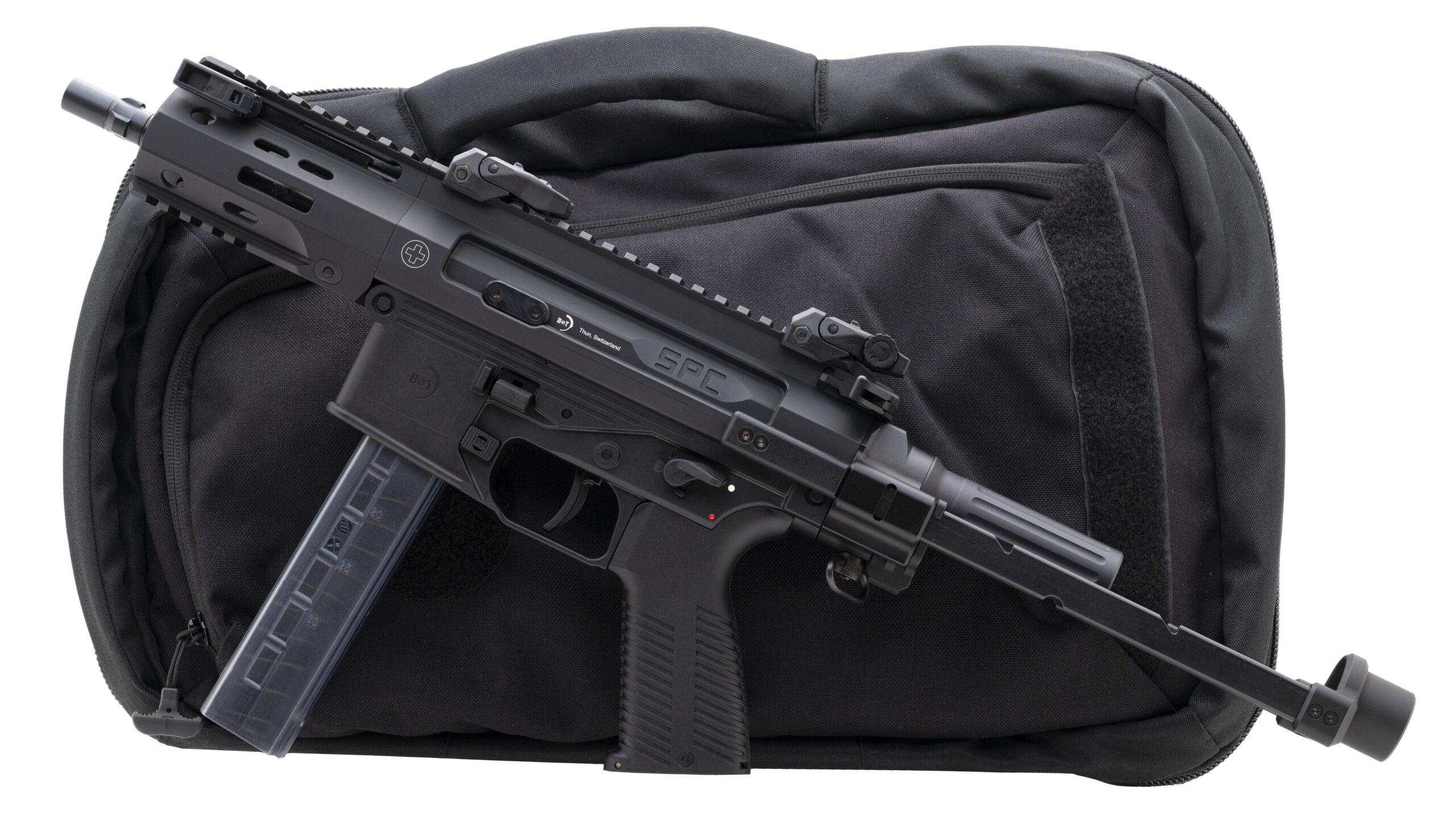 Premium Swiss tactical pistol 4.5" threaded barrel, ambidextrous controls, hydraulic buffer system and both rear and side charging handle. Comes with back pack, sling, cleaning gear and tri-lug mount. NEW. (STOCK PHOTO)(DALLAS LOCATION)