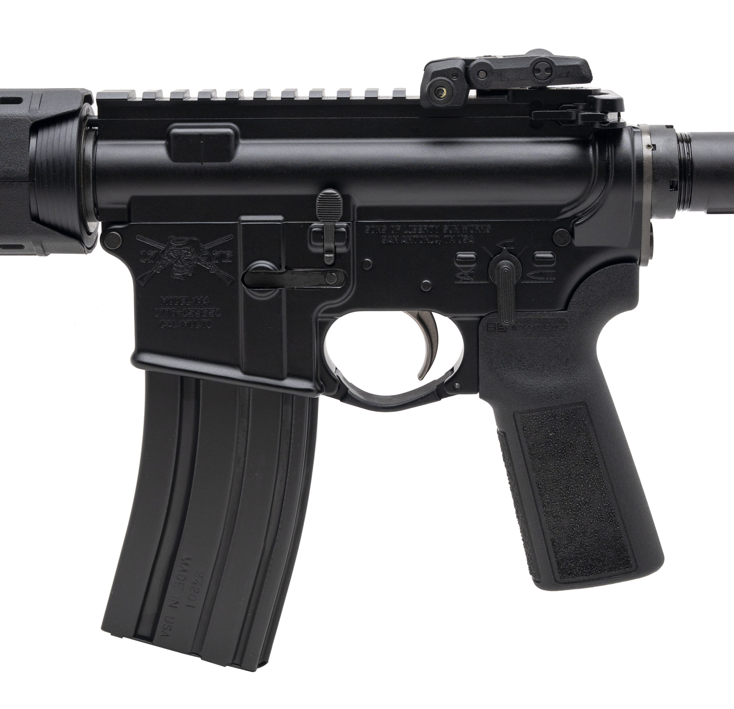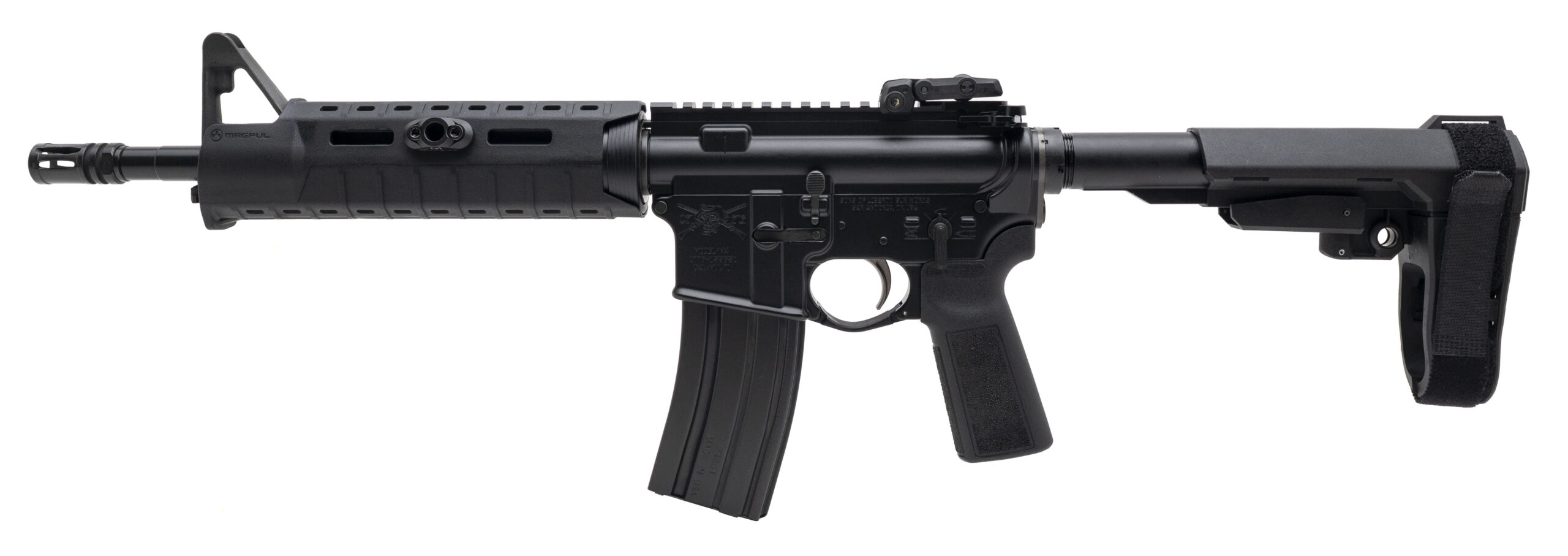 SN: 1776-159651. Modern production, 5.56 NATO with a 11.5" barrel w/ flash hider. Bore is excellent. Semi-auto tactical pistol with SOLGW Liberty Fighting Trigger, Magpul flip-up rear sight, handguard, pistol grip, trigger guard, SB Tactical brace, and matte black finish. Includes original box. Overall condition is excellent.