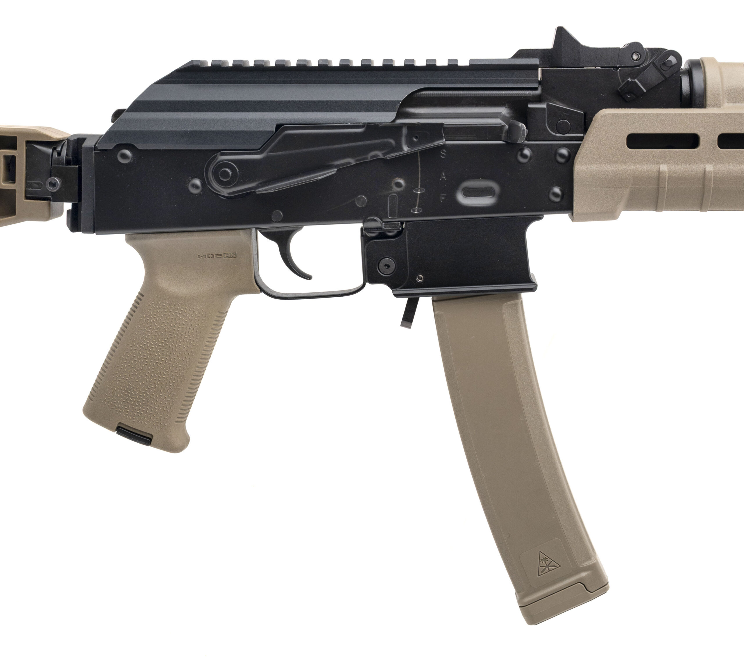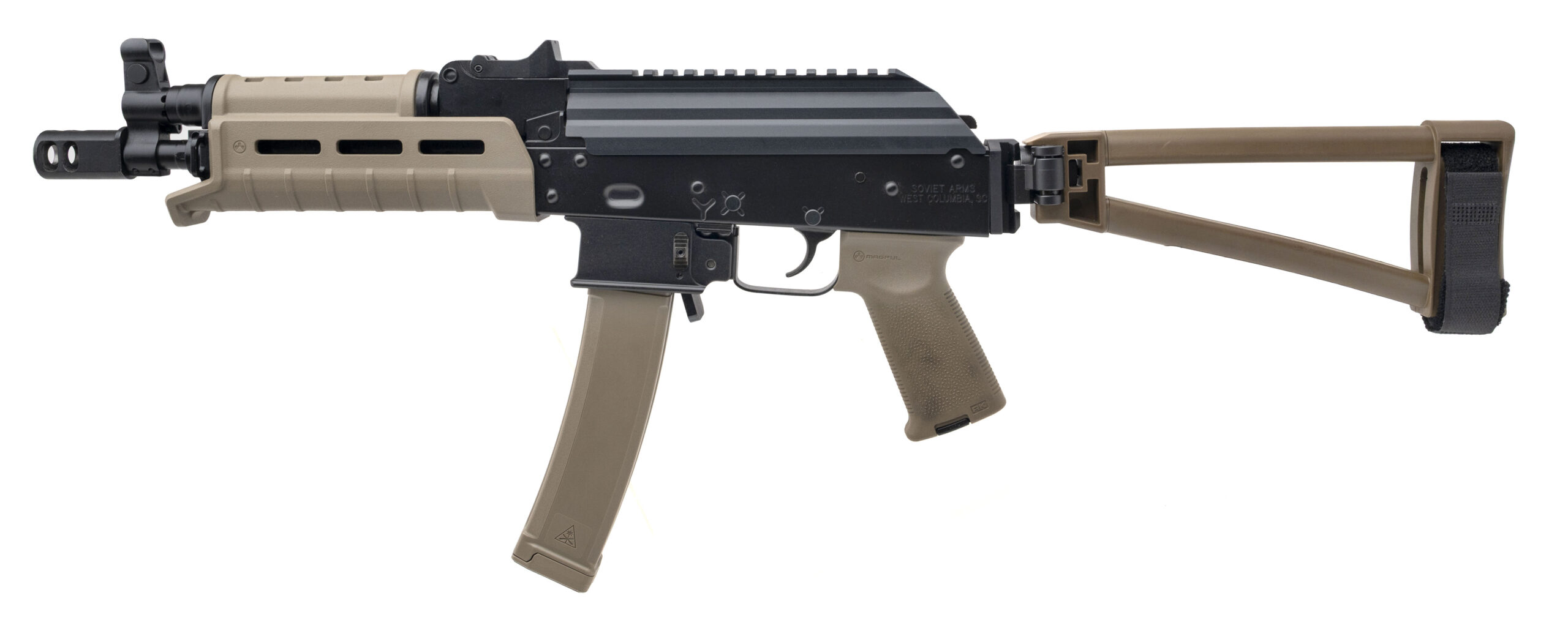 SN: V002951. Modern production, 9m with a 10.5" barrel w/2-port muzzle brake. Bore is bright with strong rifling. Semi-auto tactical AK pistol with FDE Magpul furniture, picatinny rail dust cover, and an FDE SB Tactical side-folding brace. Near excellent condition overall.