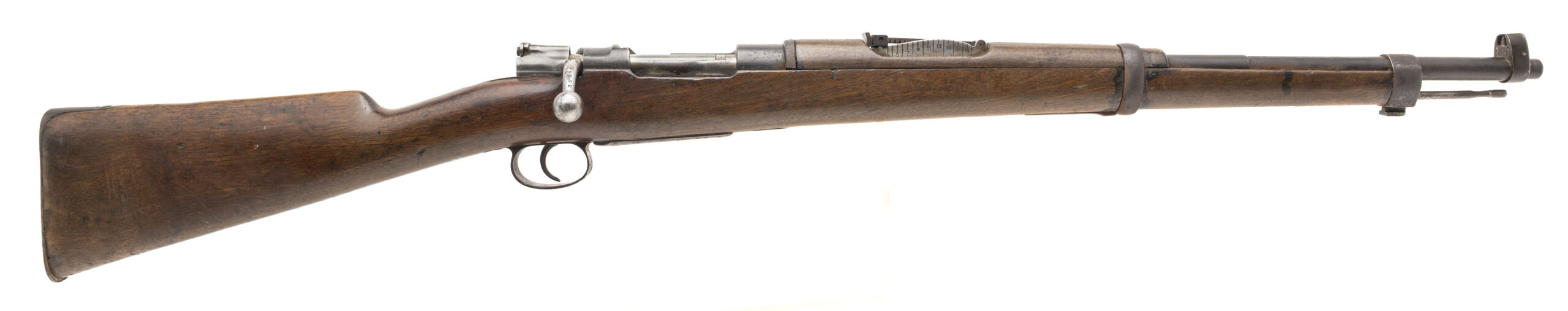 Serial No. N2019, manufactured in the early 1900s and later refurbished between 1931 and 1936, chambered in 7mm with a 22” round barrel. Bore is bright and shiny with strong rifling noted. The rifle shows honest service wear, with the original crest removed from the receiver as commonly encountered on refurbished examples. Light surface oxidation is present on the metal, consistent with age and use. The stock remains solid and displays light handling impressions throughout. A representative example of a Spanish service rifle that saw continued use through the interwar period. Action is smooth and functions correctly.