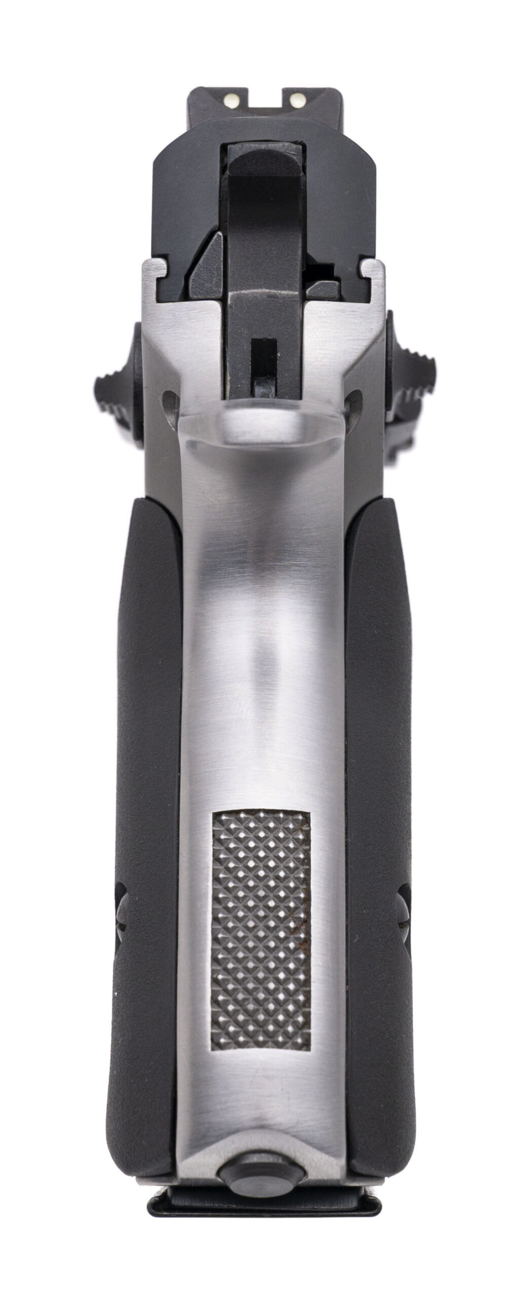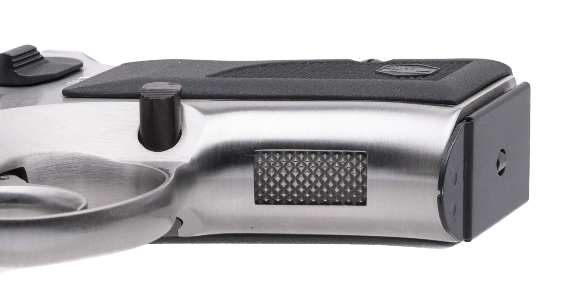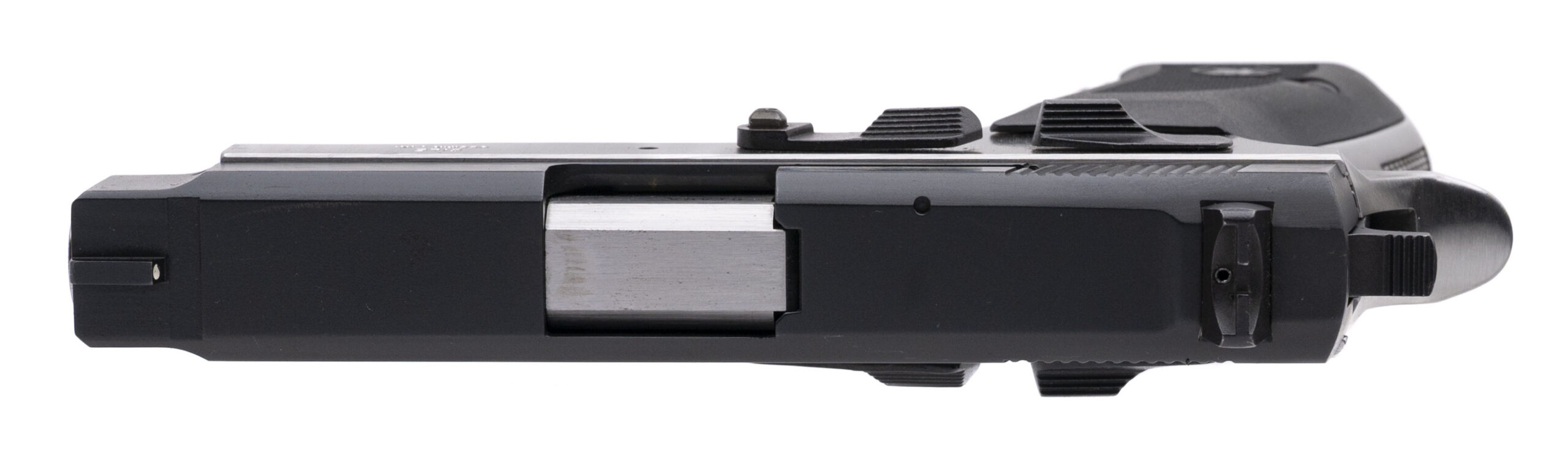 SN: A01263H. 1990s vintage, 9mm with a 3.66" barrel. Bore is excellent. Swiss made steel frame double-action pistol with 3 dot sights, ambidextrous manual thumb-safety, two-tone finish, and checkered polymer grips. Metal & finish show light marks & edge wear. Overall condition is near excellent. Includes an additional magazine, and original box.
