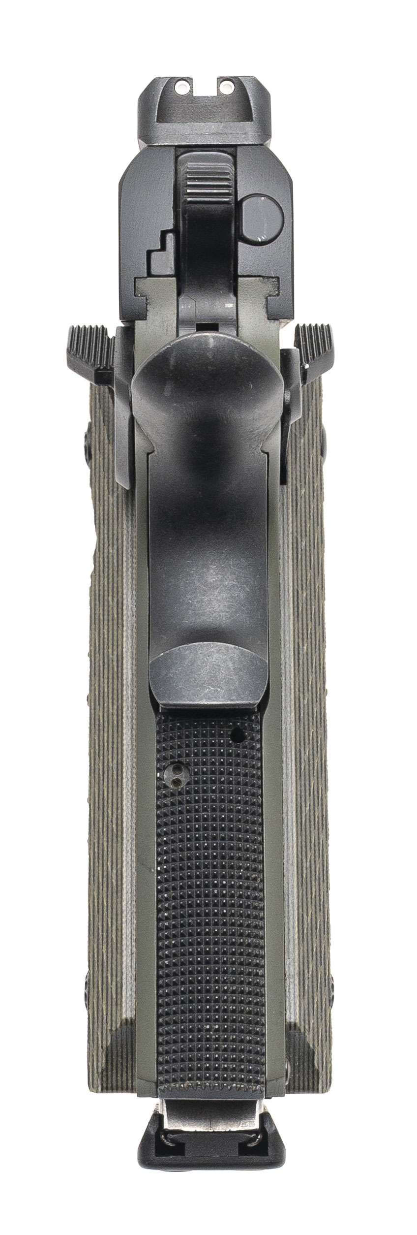 SN: NM424801. Modern production, .45 ACP with a 5" barrel. Bore is excellent. Single-action only steel frame 1911 style pistol with Trijicon front & rear night sights, ambidextrous manual thumb-safety, accessory rail, two-tone finish, and G10 grips. Finish shows light edge wear. Overall condition is near excellent. Includes an additional magazine, original OWB holster & magazine holder, and original case.