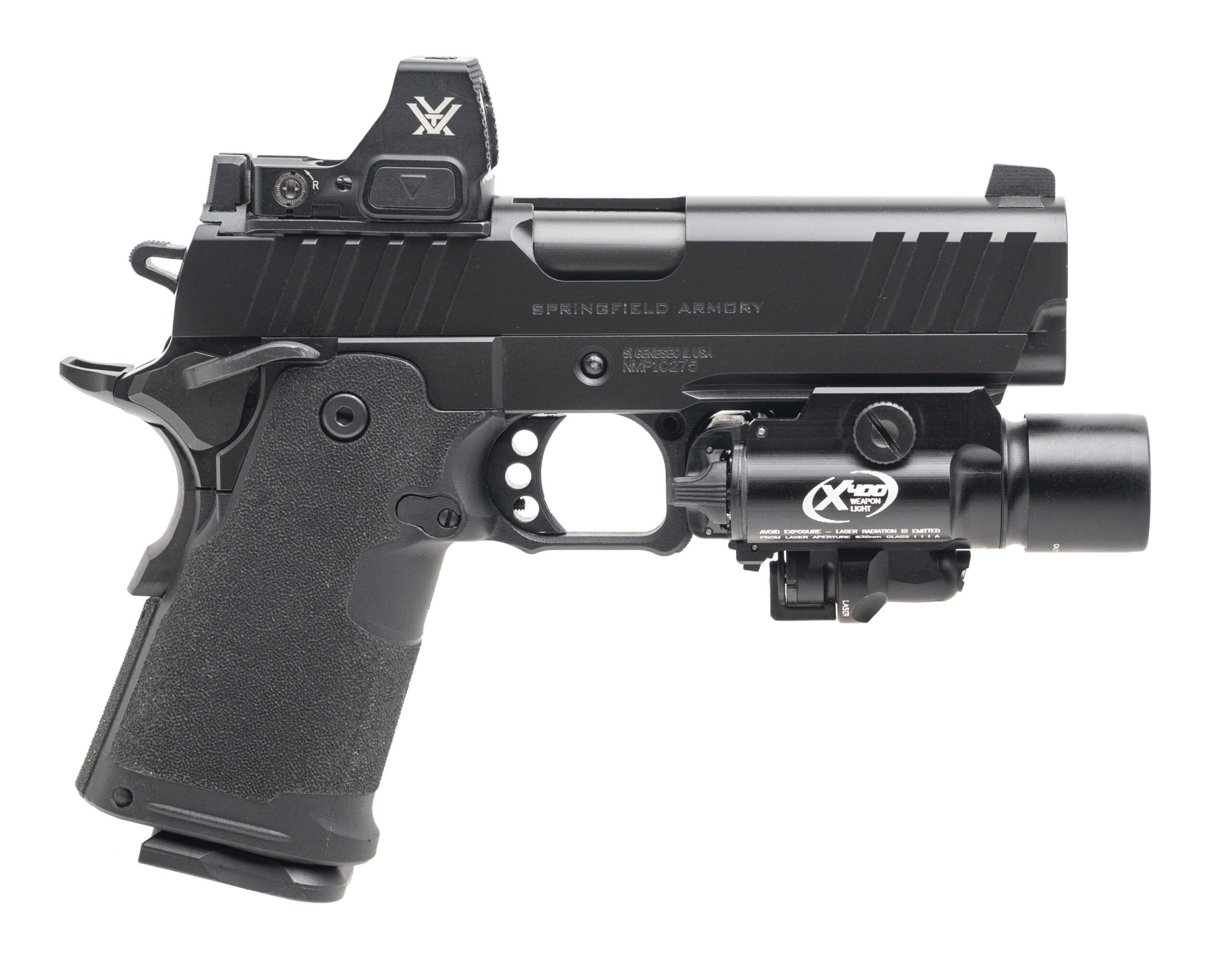 SN: NMP10275. Modern production, 9mm with a 4.25" bull barrel. Bore is very good. Compact double stack 1911 style pistol with a Vortex Defender-ST red dot optic, Surefire X400 laser/light module, ambidextrous manual thumb-safety, matte black finish, and textured polymer grip module. Finish shows light marks. Overall condition is near excellent. Includes 3 additional magazines, original soft carry case, and original box.