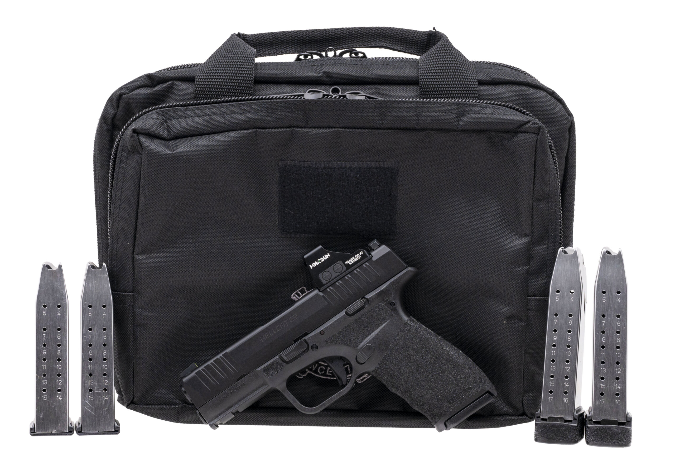 SN: BF207082, Modern production, 9mm with a 3.7" barrel. Sub-compact polymer frame pistol. Bore, finish, and grips are in excellent condition. Pistol comes with case. four extra magazines, and Holosun 407k red dot sight.