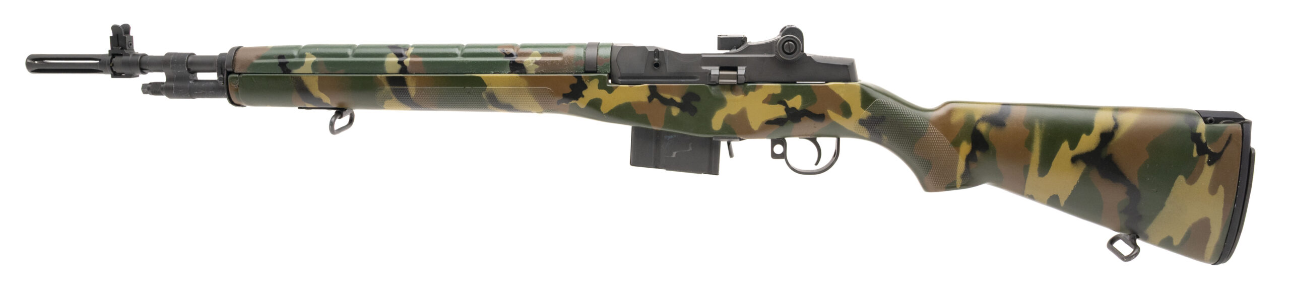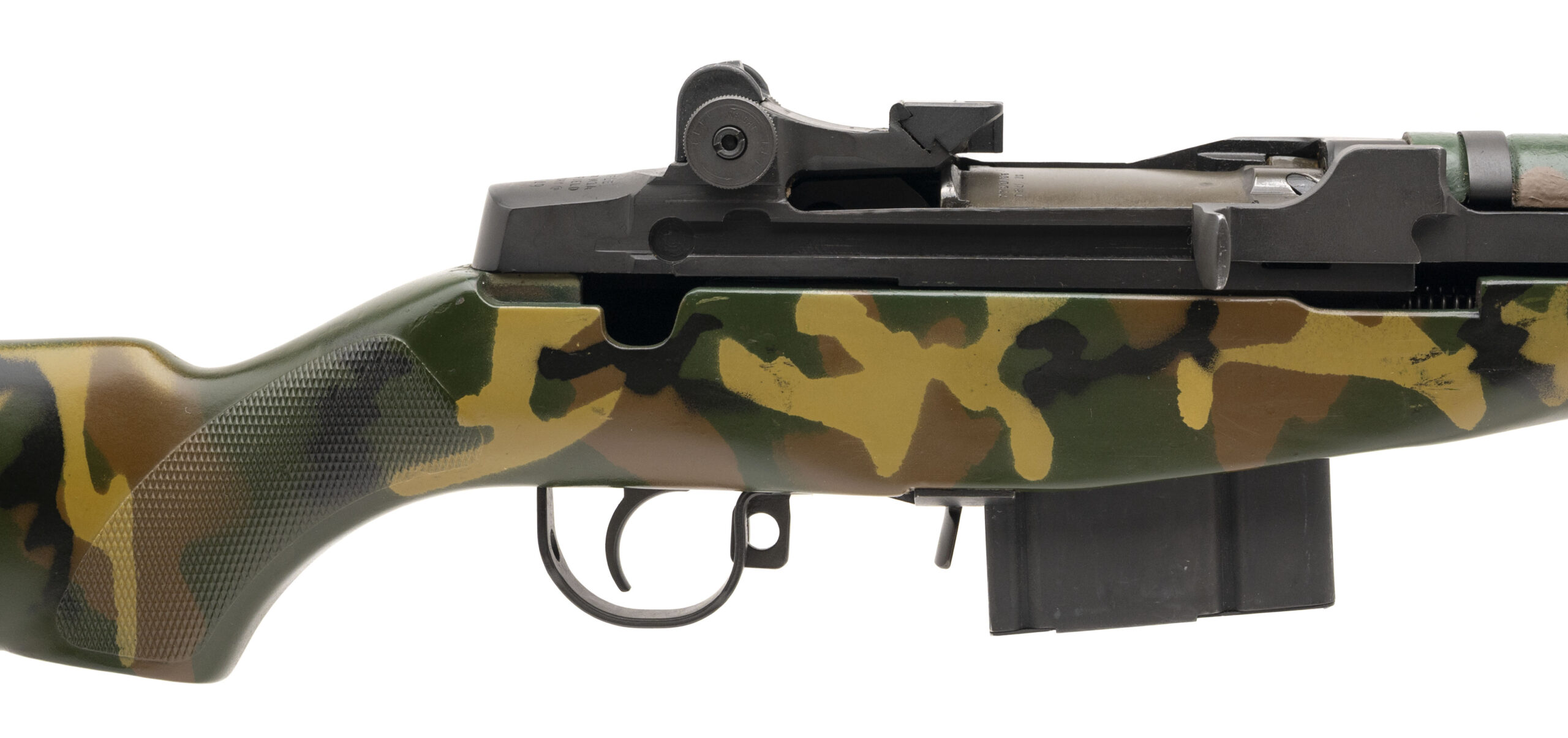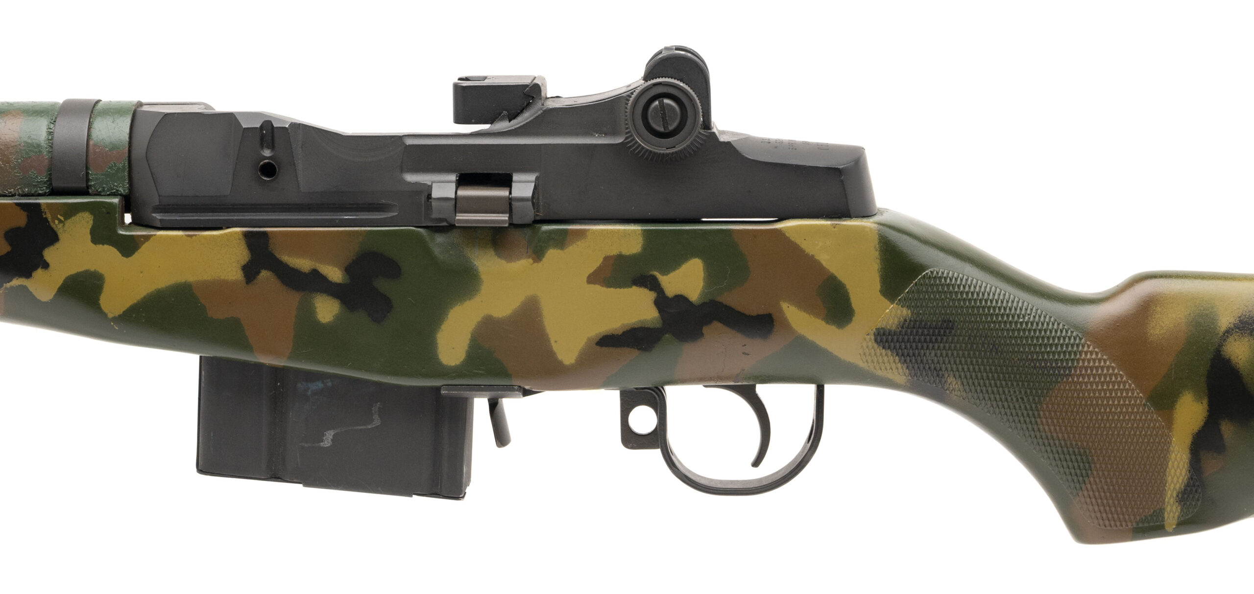 SN: 051649. Made in 1989, .308 WIN. with an 18" barrel w/flash hider. Bore is excellent. Semi-auto rifle with a bladed front sight, adjustable aperture rear sight, parkerized finish, and custom camouflage painted checkered composite stock w/hinged buttplate. Paint and finish show wear with handling marks throughout. Overall condition is very good.