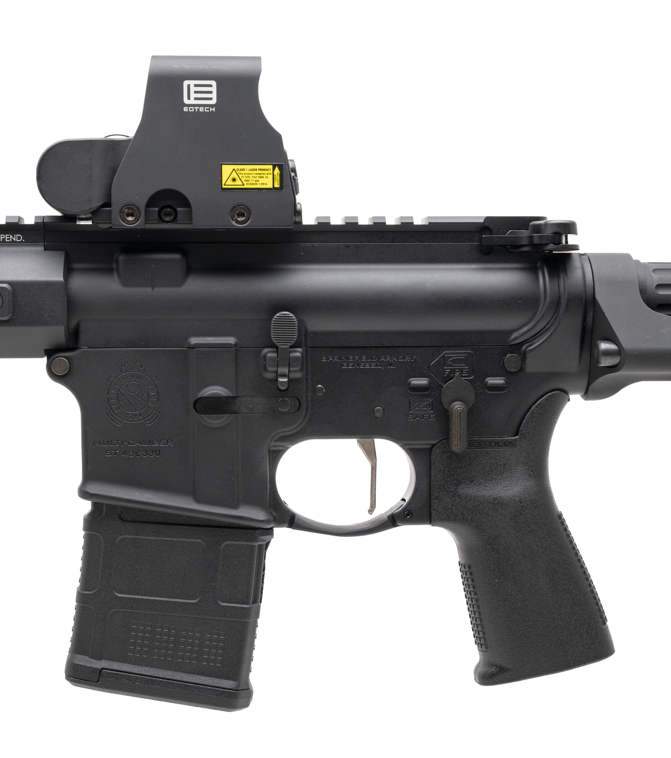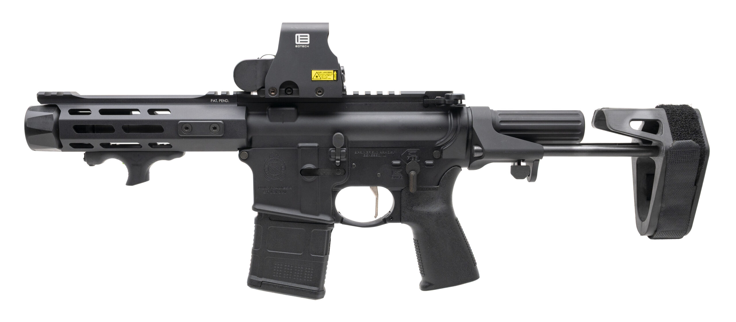 SN: ST430330. Modern production, 5.56 NATO with a 5.5" barrel w/blast diverter. Bore is excellent. Semi-auto tactical pistol with an EOTech XPS2-1 holographic optic, Viridian HS1 green laser module hand stop, maxim defense collapsible brace, and matte black finish. Overall condition is excellent. Includes 2 additional magazines, and original range bag.