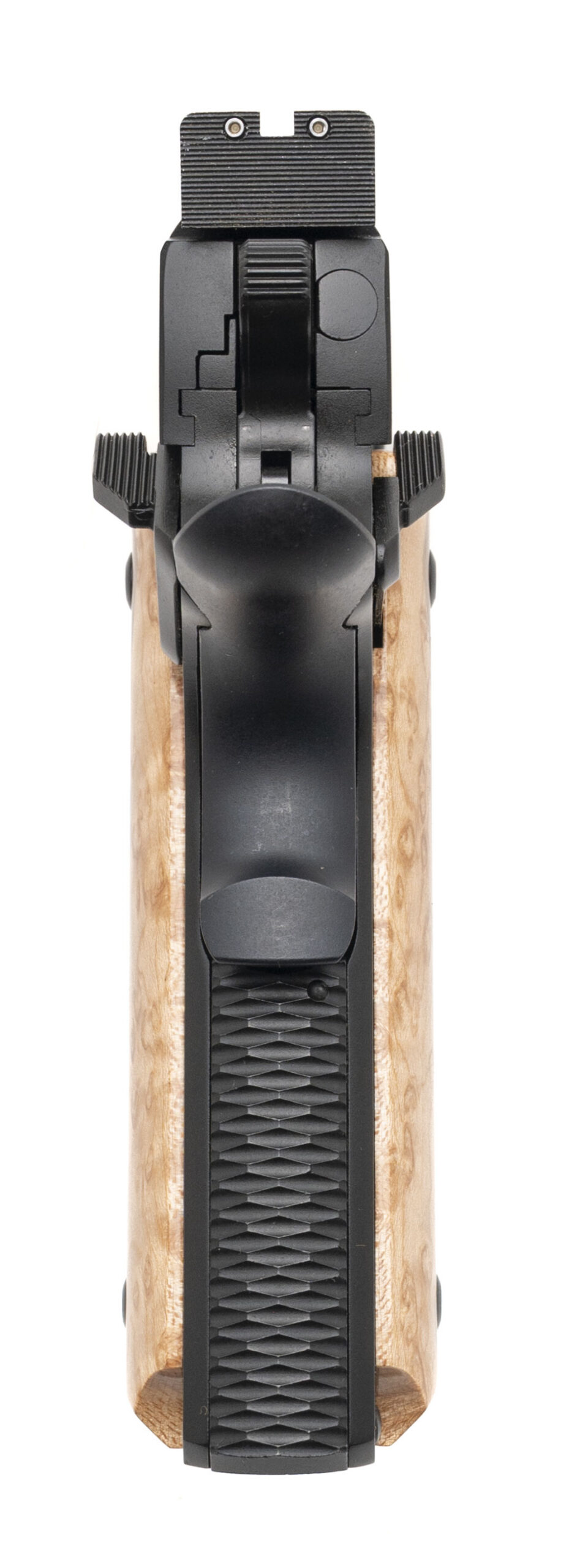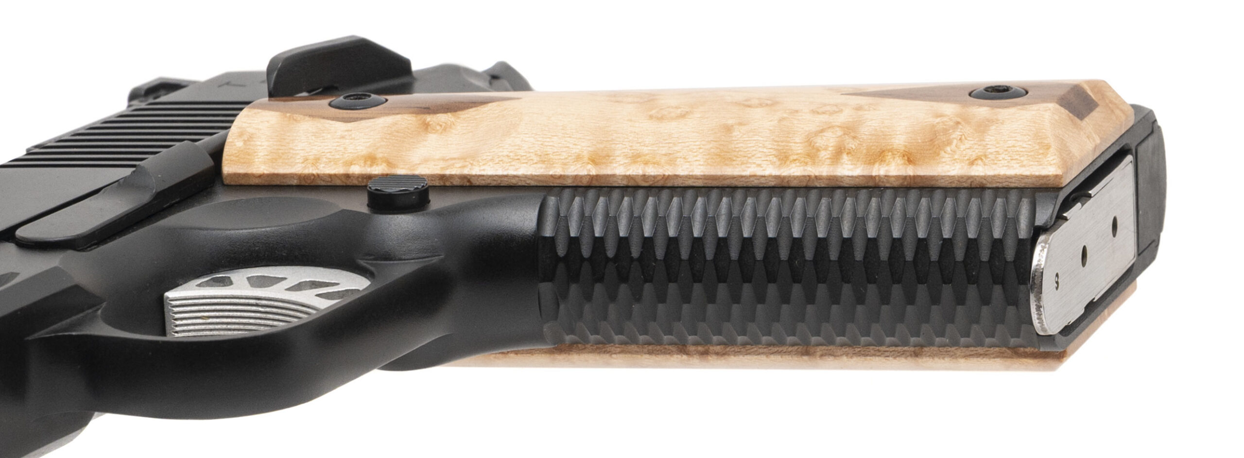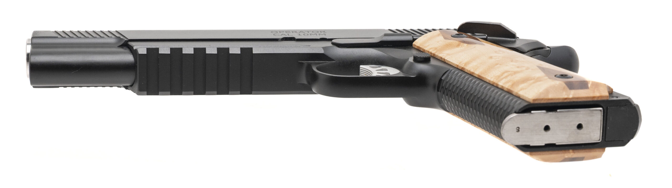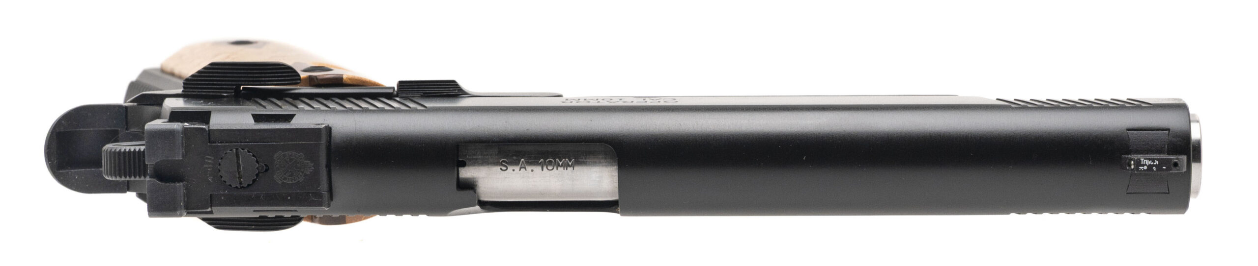 SN: NM549986. Modern production, 10mm with a 6" barrel. Bore is excellent. Full size steel frame 1911 style pistol with front & rear adjustable night sights, accessory rail, ambidextrous manual thumb-safety, matte black finish, and custom maple wood grips. Overall condition is excellent. Includes an additional magazine, original grips, and original range bag.