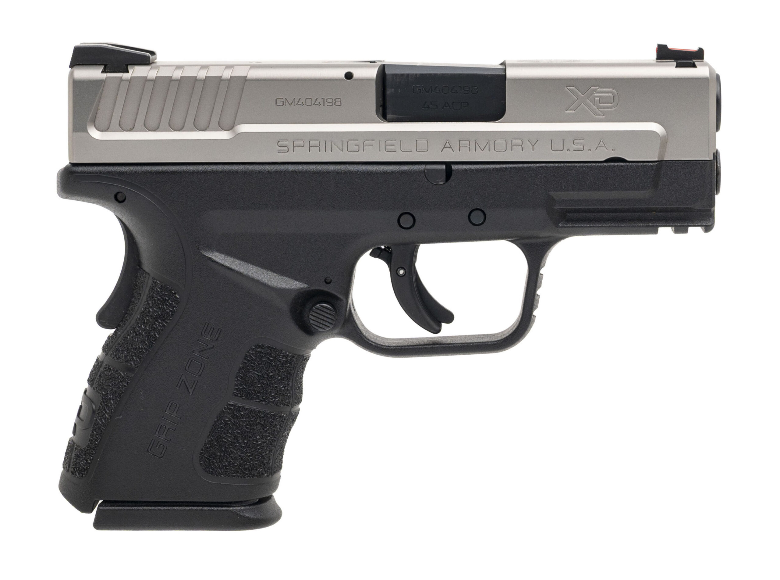 SN: GM404198. Modern production, .45 ACP with a 3.25" barrel. Bore is excellent. Sub-compact polymer frame striker-fired pistol with a fiber-optic front sight, ambidextrous slide release, accessory rail, and stainless steel slide. Overall condition is excellent.