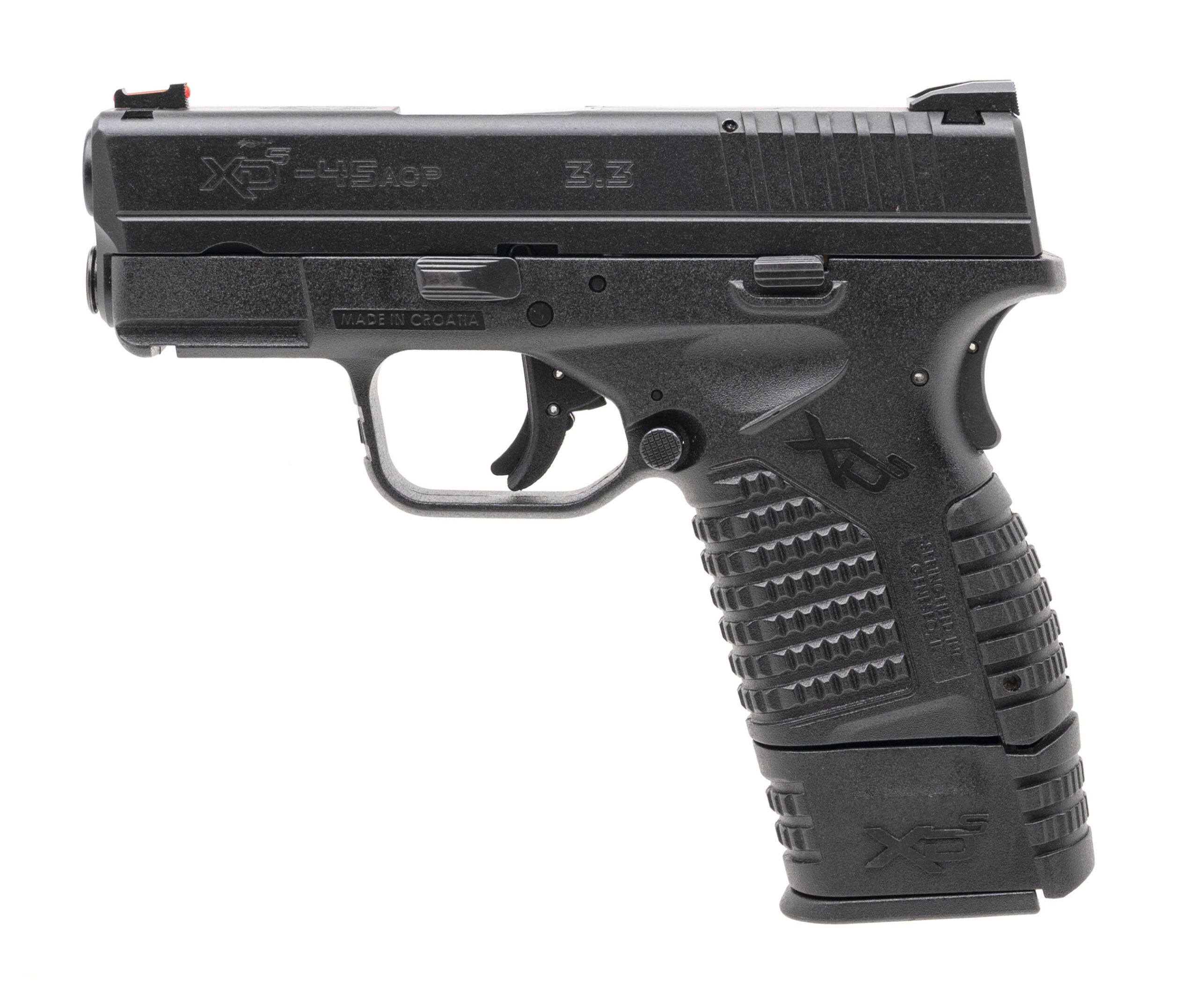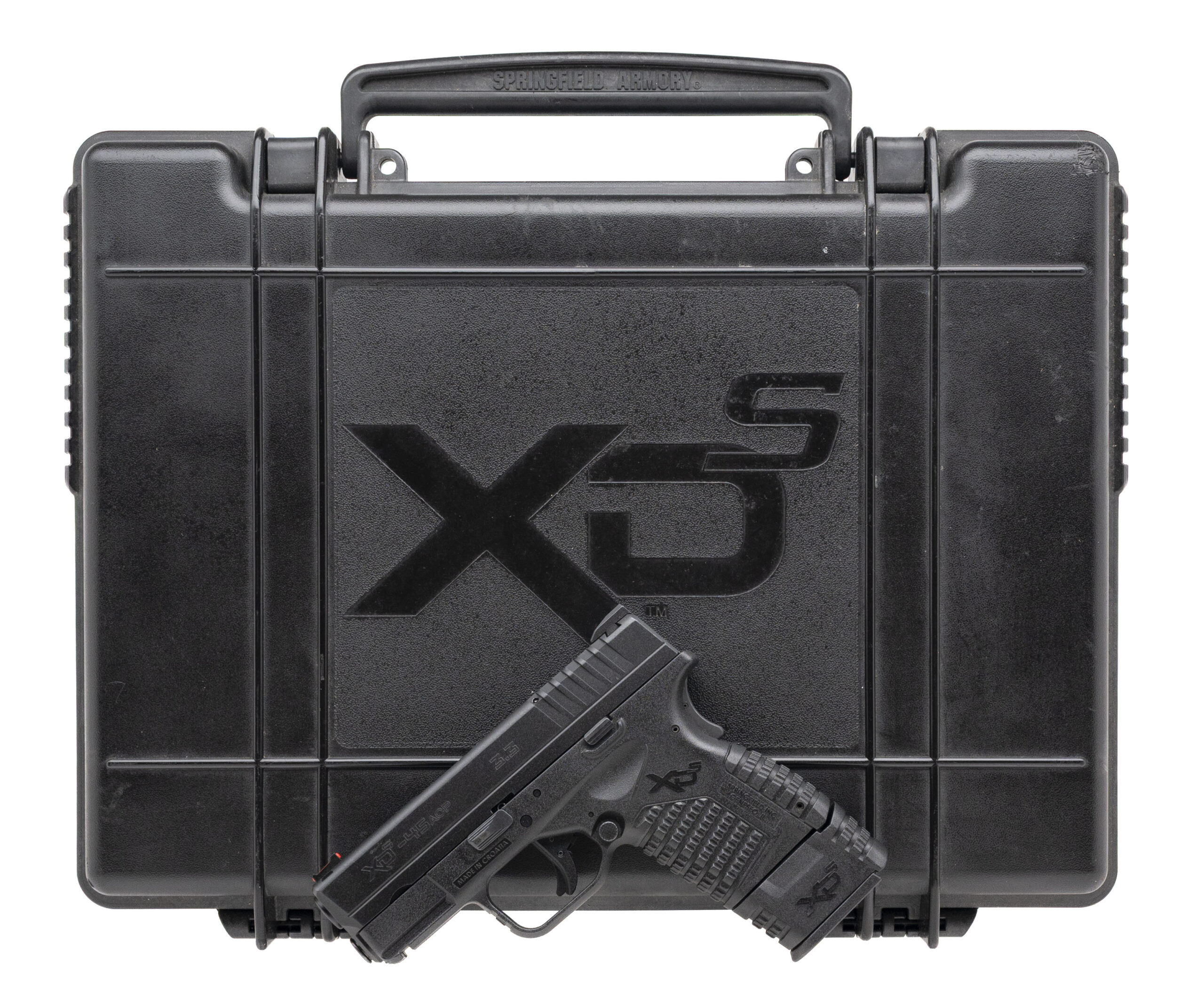 SN: XS519656. Modern production, .45 ACP with a 3.3" barrel. Bore is excellent. Sub-compact striker-fired pistol with a fiber-optic front sight, accessory rail, matte black finish, and black polymer frame. Finish & frame show minor handling marks. Includes original case. Overall condition is very good.