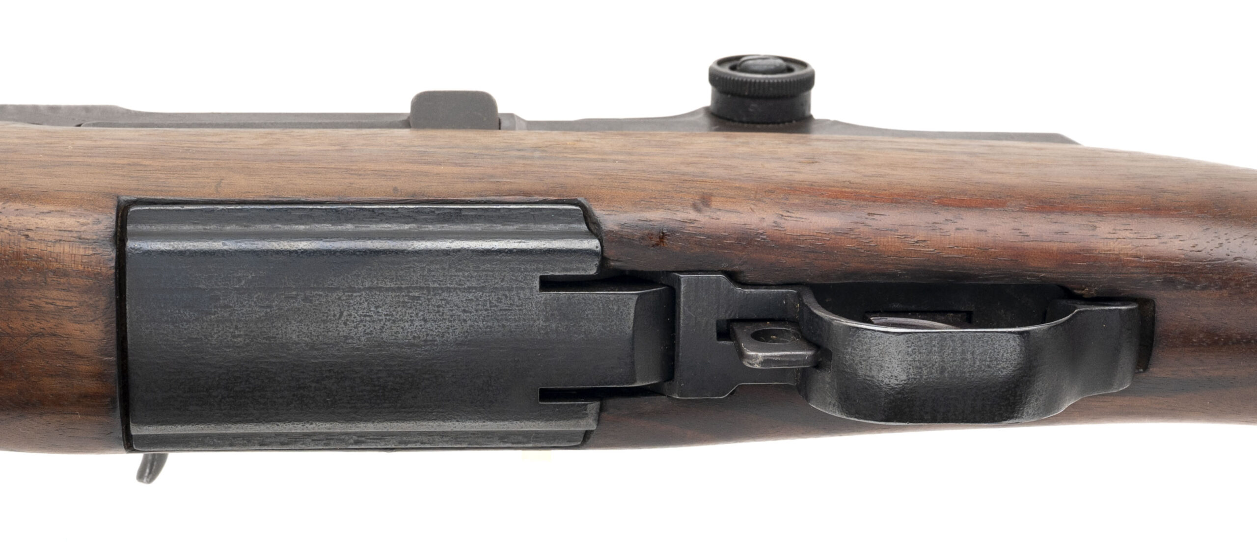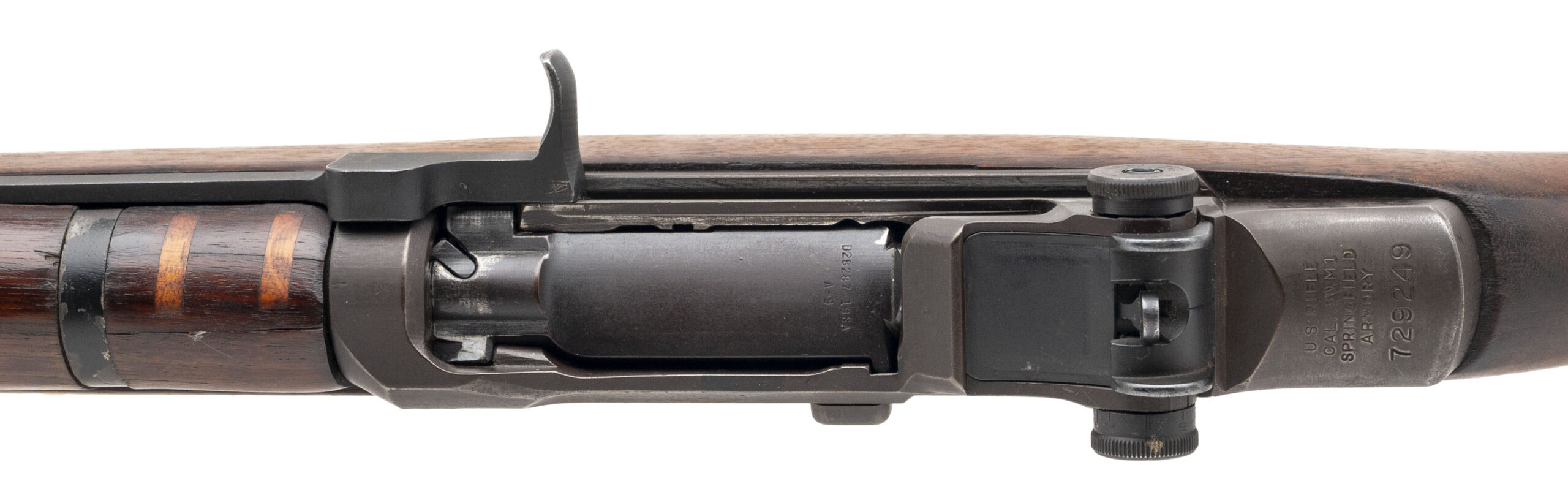 Serial number 729249. Made in June 1942 with a July 1942 dated 24-inch round Springfield barrel with British import marks on the left side & a bright bore that has strong visible rifling. Equipped with a milled Springfield trigger guard, a radius cut Springfield op rod & a "BME" marked T105E1 adjustable rear sight assembly made by Borg-Warner, Inc. The wood furniture is in very good condition although there is a crude repair on rear handguard. The gas cylinder, gas cylinder lock, front sight & rear handguard band have all been painted black. Comes with a M1943 webbed sling with MRT markings.